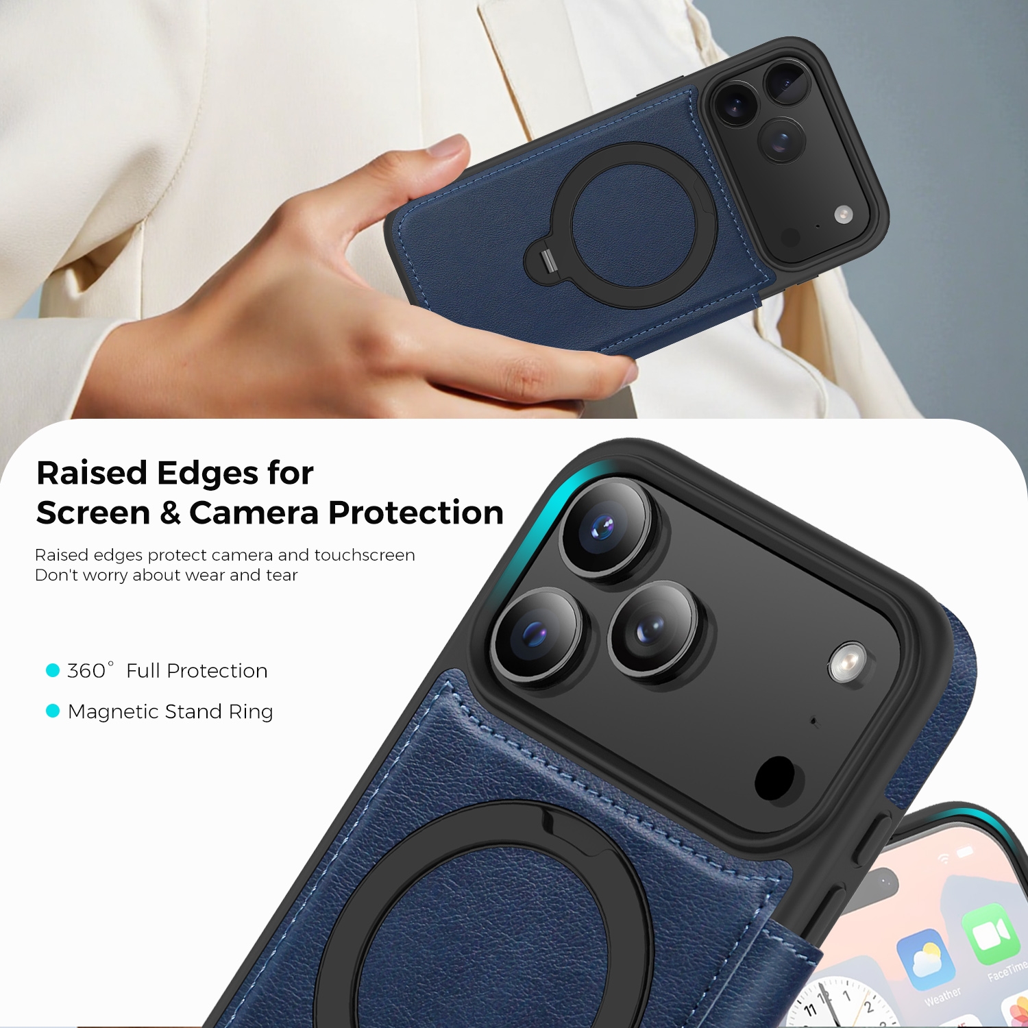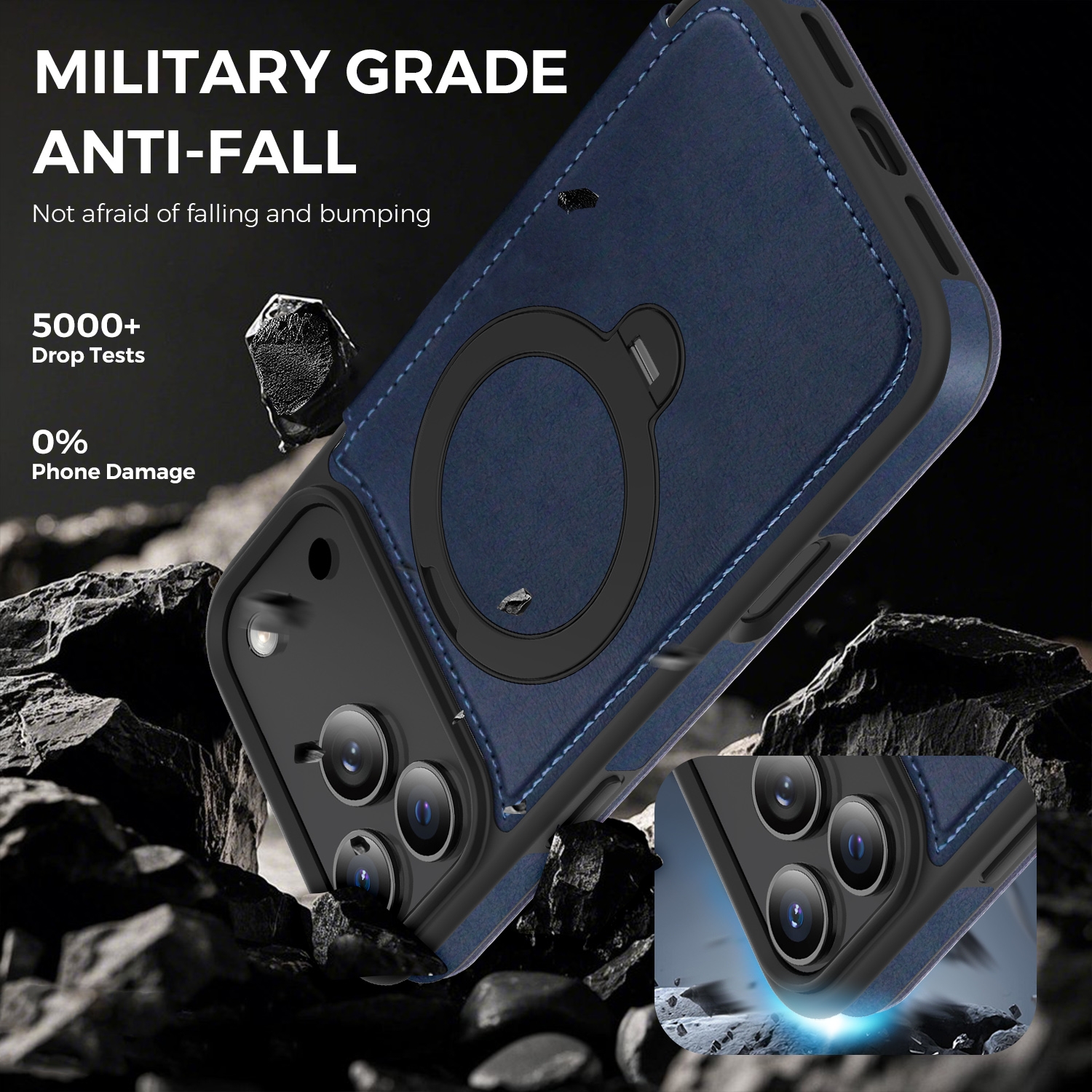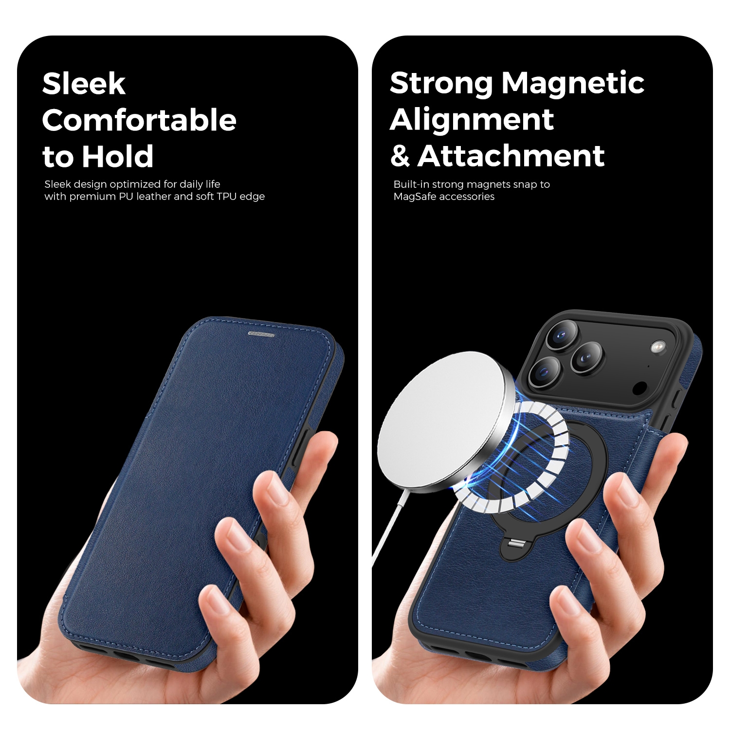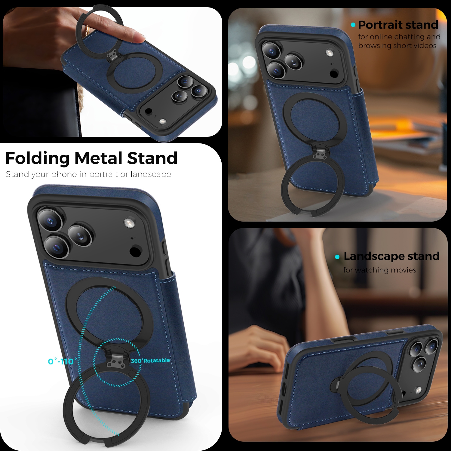 360° Rotating Stand iPhone 17 Pro Max Case - Magnetic Wireless Charging PU Cover, Blue