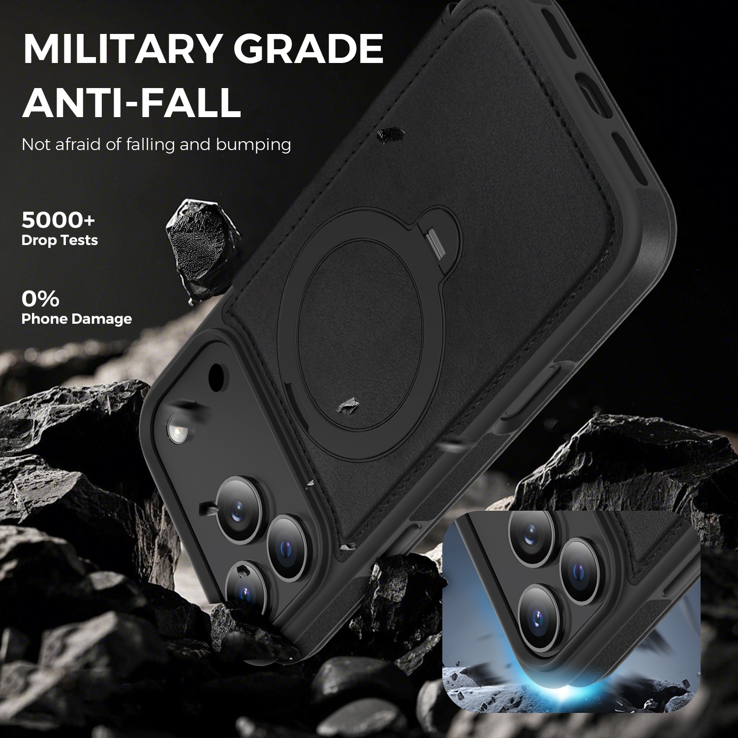 360° Rotating Stand iPhone 17 Pro Case - Magnetic Wireless Charging PU Cover, Black