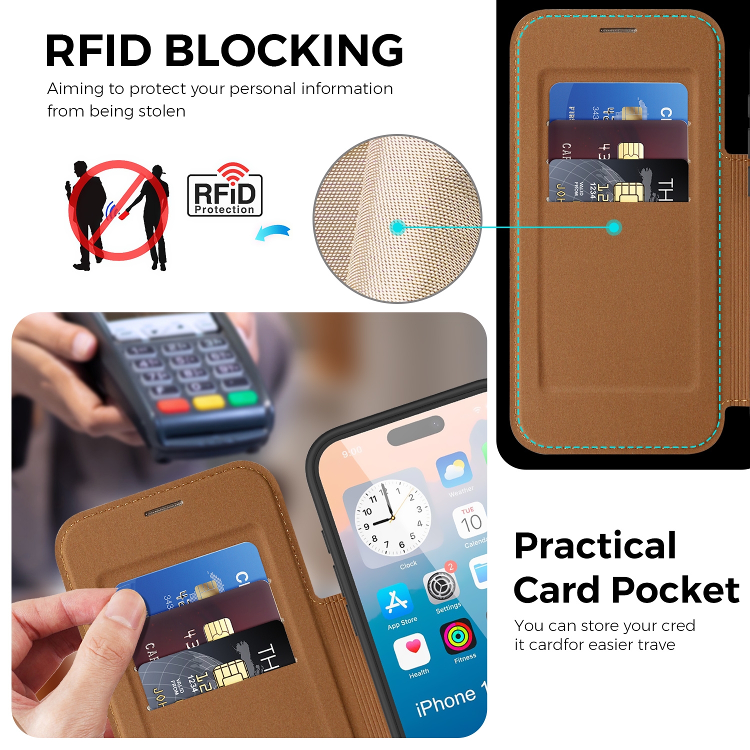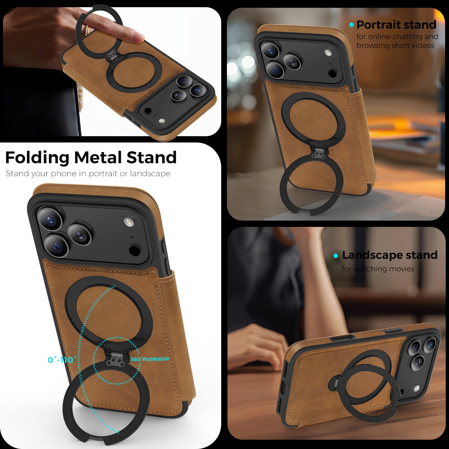 360° Rotating Stand iPhone 17 Pro Case - Magnetic Wireless Charging PU Cover, Brown