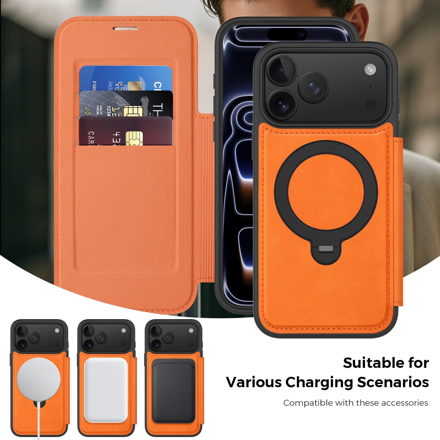 360° Rotating Stand iPhone 17 Pro Max Case - Magnetic Wireless Charging PU Cover, Orange