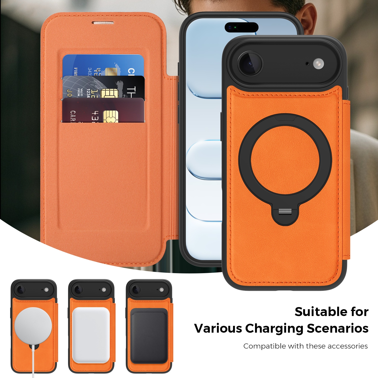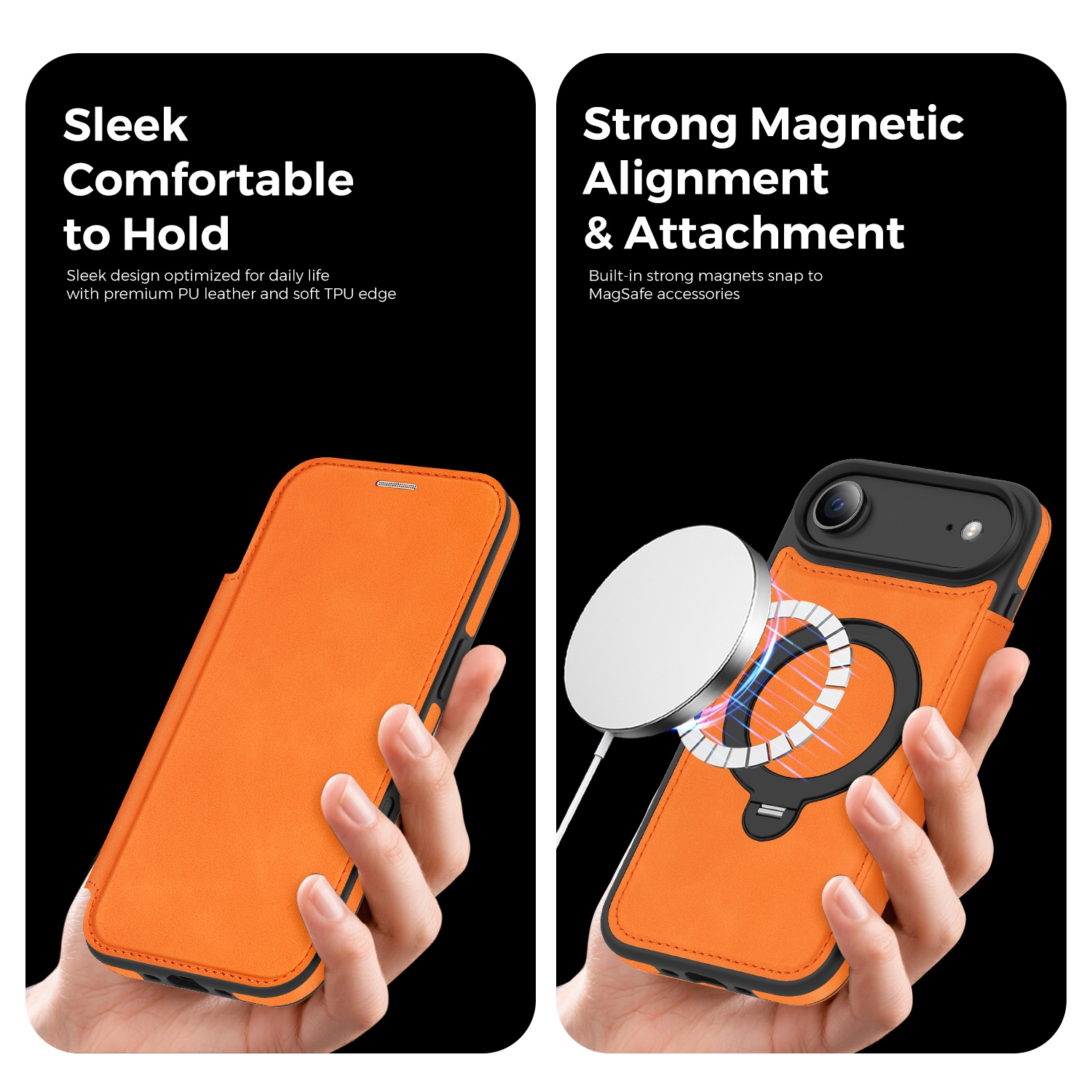 360° Rotating Stand iPhone Air Case - Magnetic Wireless Charging PU Cover, Orange