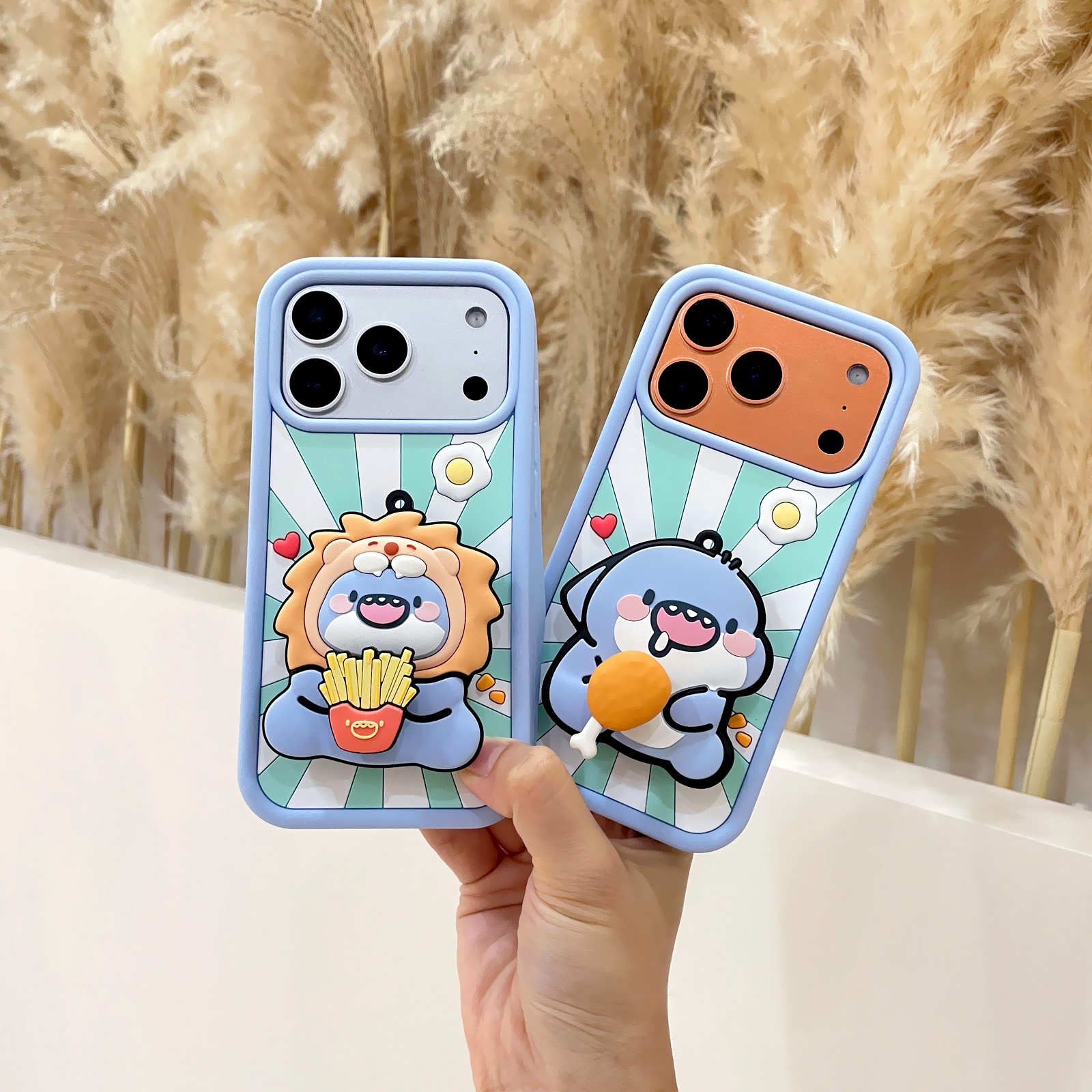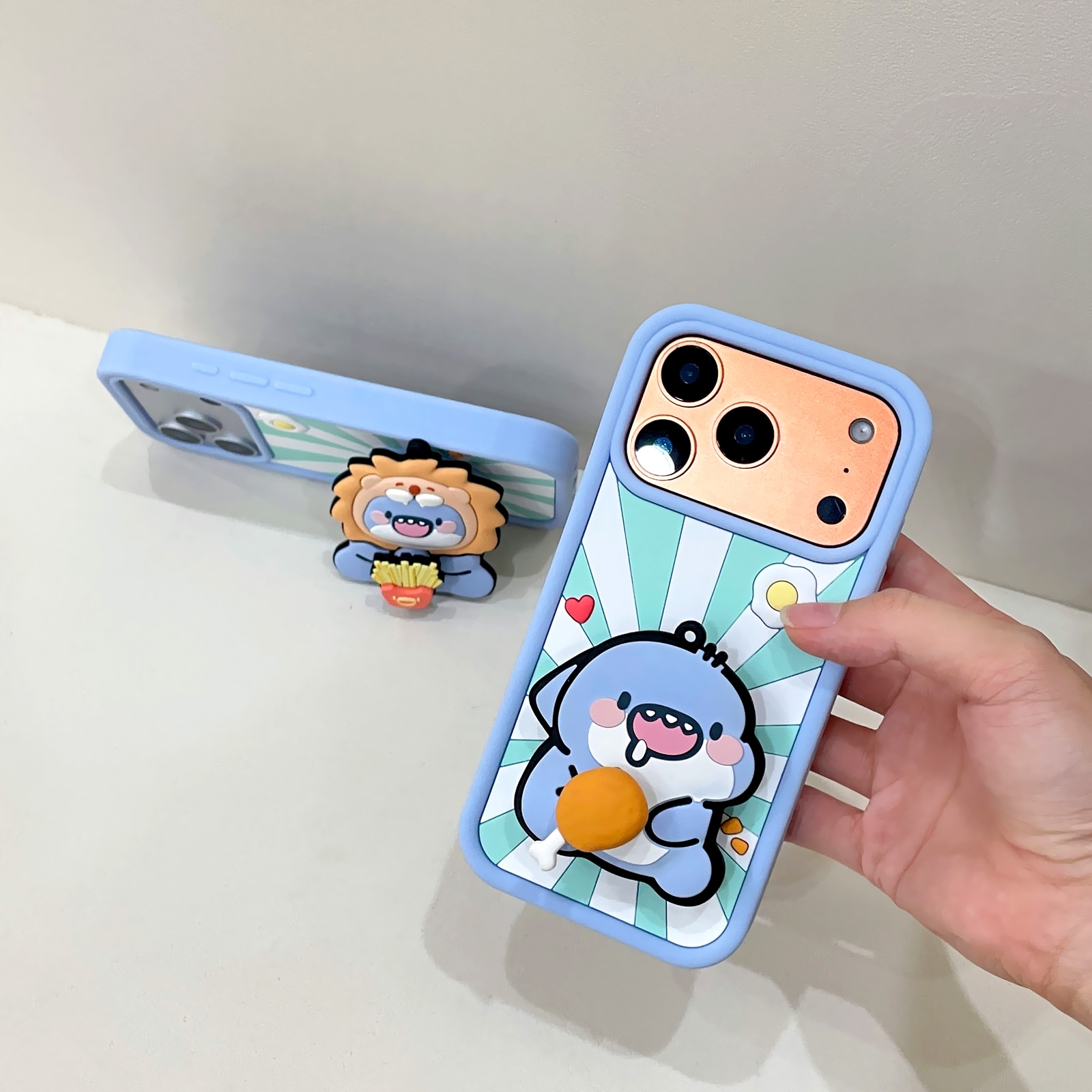 3D Fat Shark with Chicken Drumstick for iPhone 17 - Soft Silicone cover with Rotatable Kickstand, Light Blue