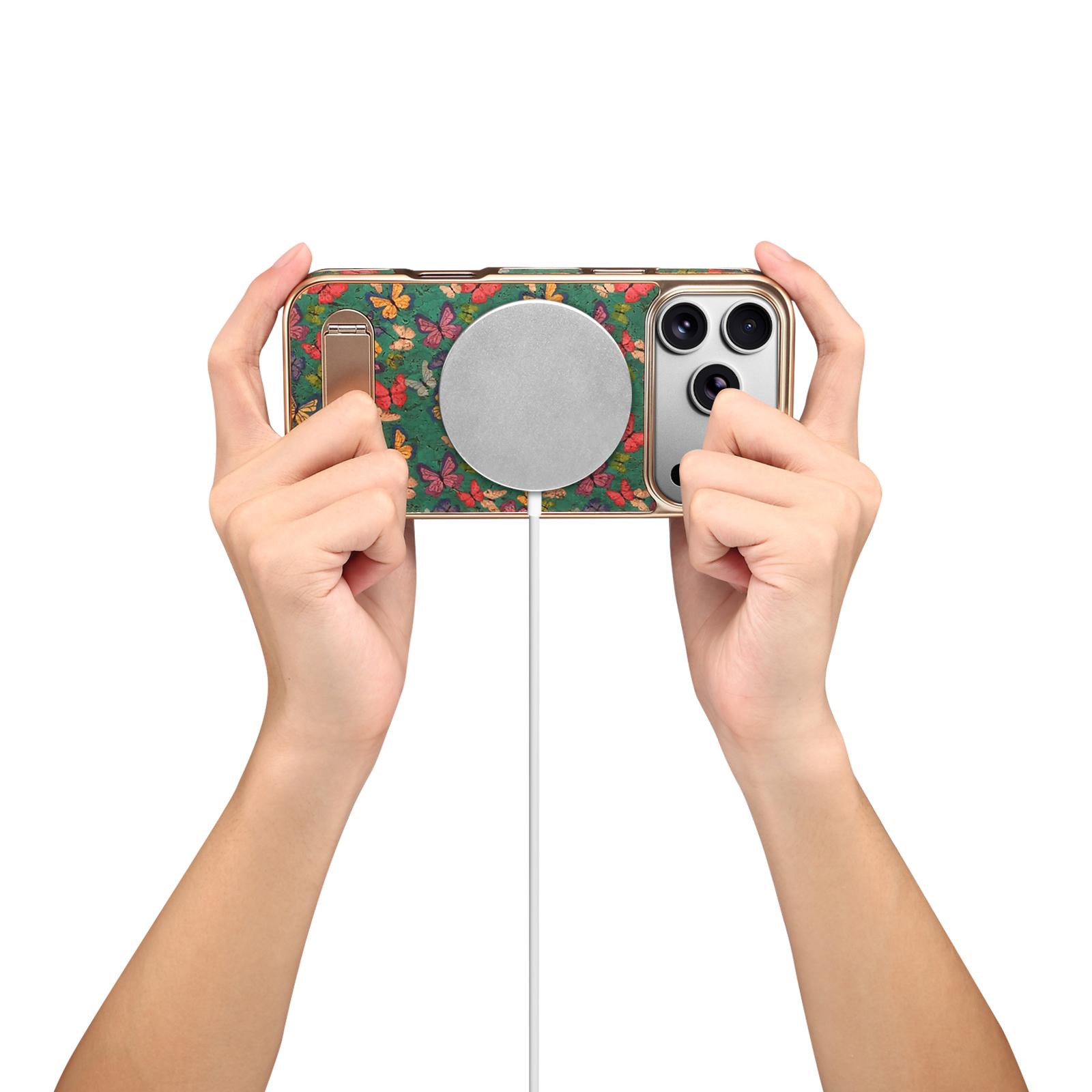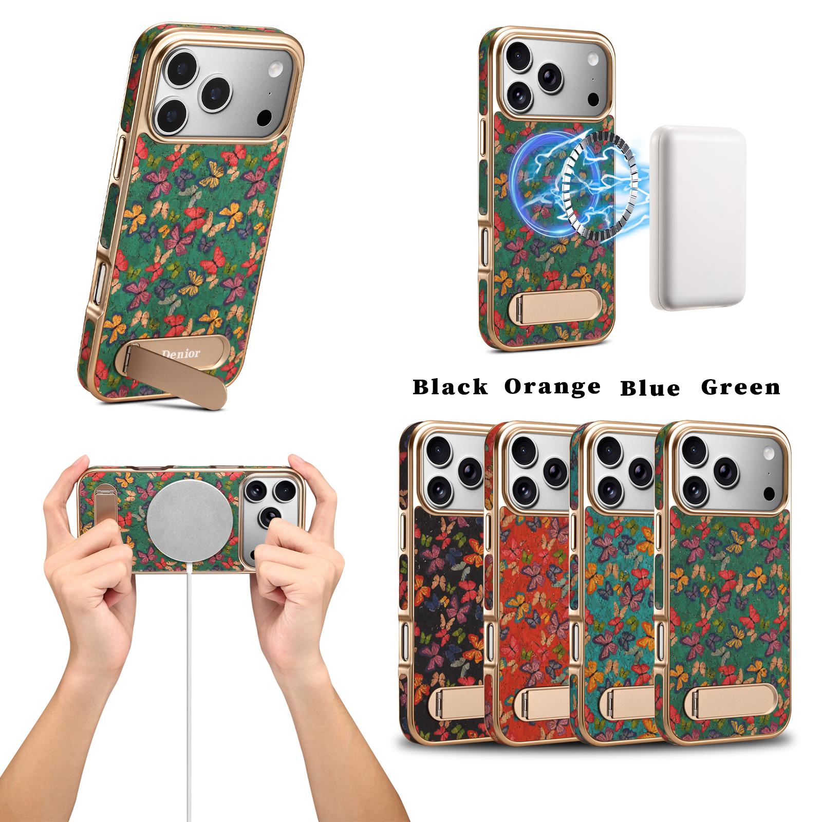 All pictures shown are for illustration purpose only. Actual product may vary due to product enhancement.Denior Butterfly Print Kickstand Phone Case for iPhone 17 Pro | Cork Material | Wireless Charging Supported - Butterfly Green