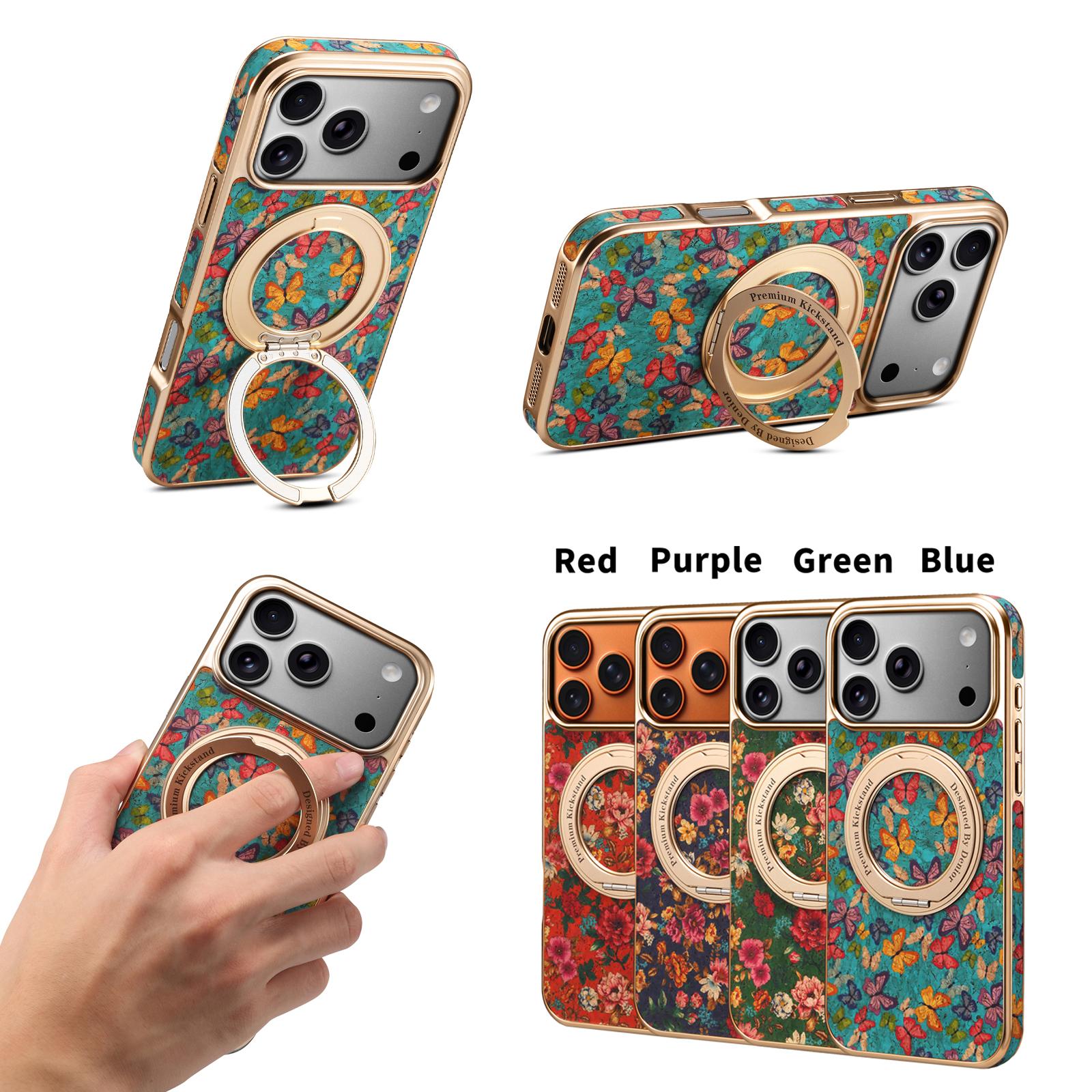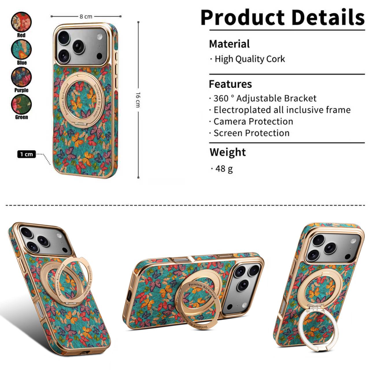 Denior Floral Print Magnetic Gear Rotating Stand Phone Case for iPhone 17 Pro Max | Eco-Friendly Cork | Fingerprint-Resistant Electroplated Case - Butterfly Blue
