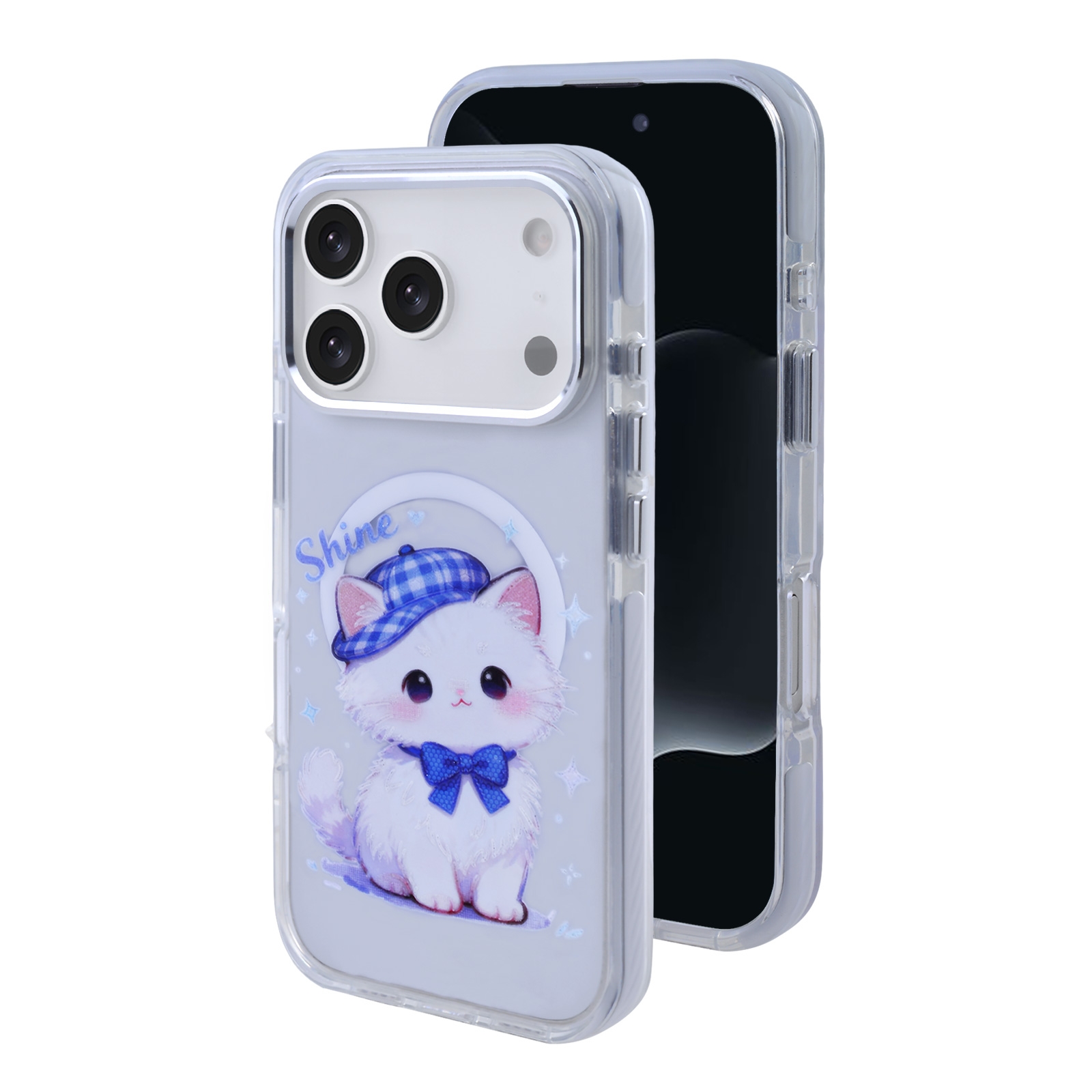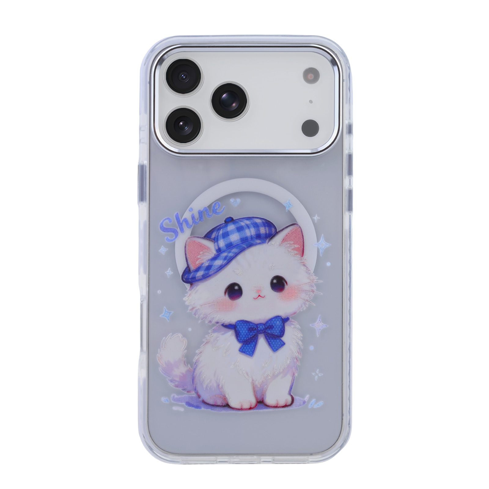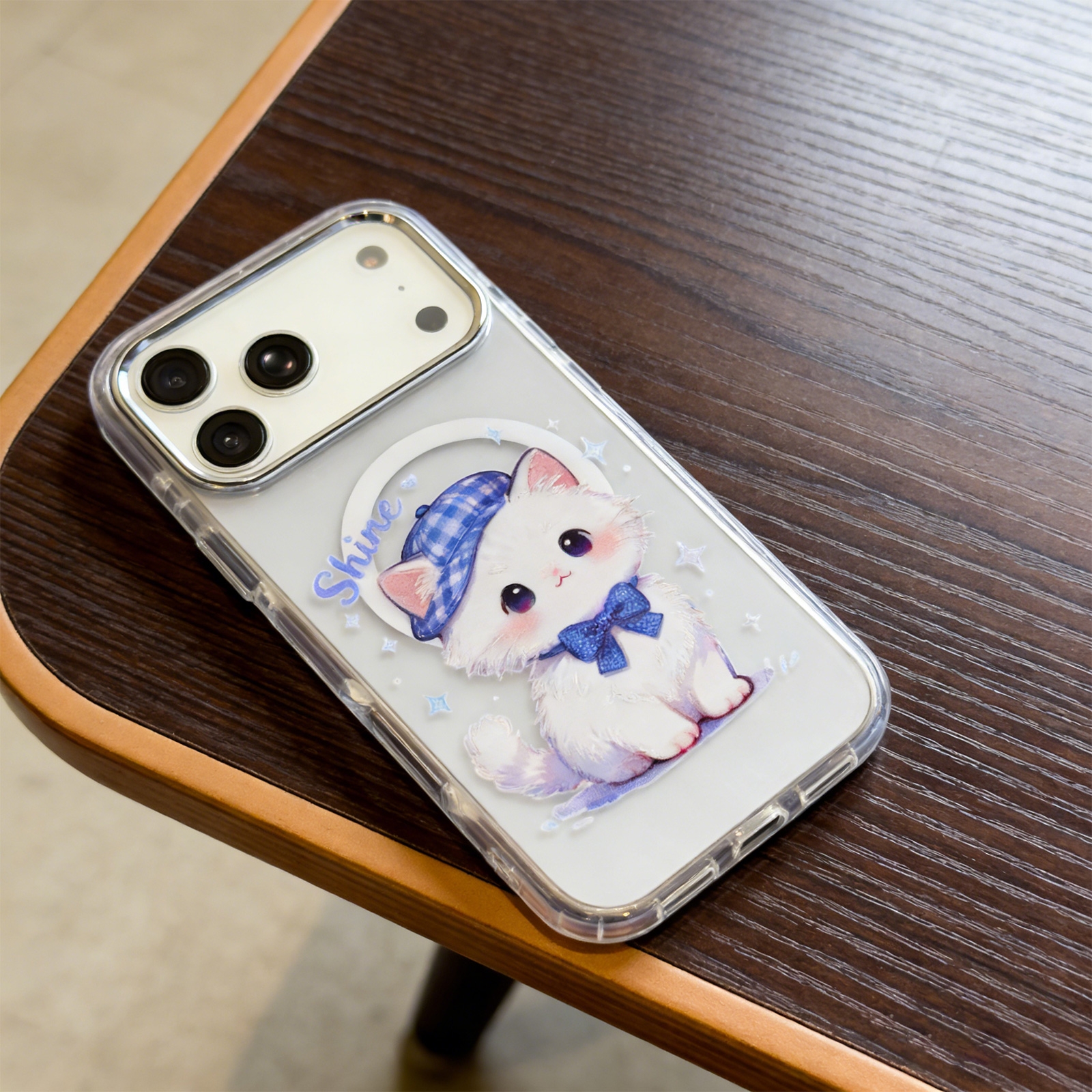 Clear Magnetic Phone Case for iPhone 17 Pro Max - Cute White Cat with Blue Plaid Hat Design