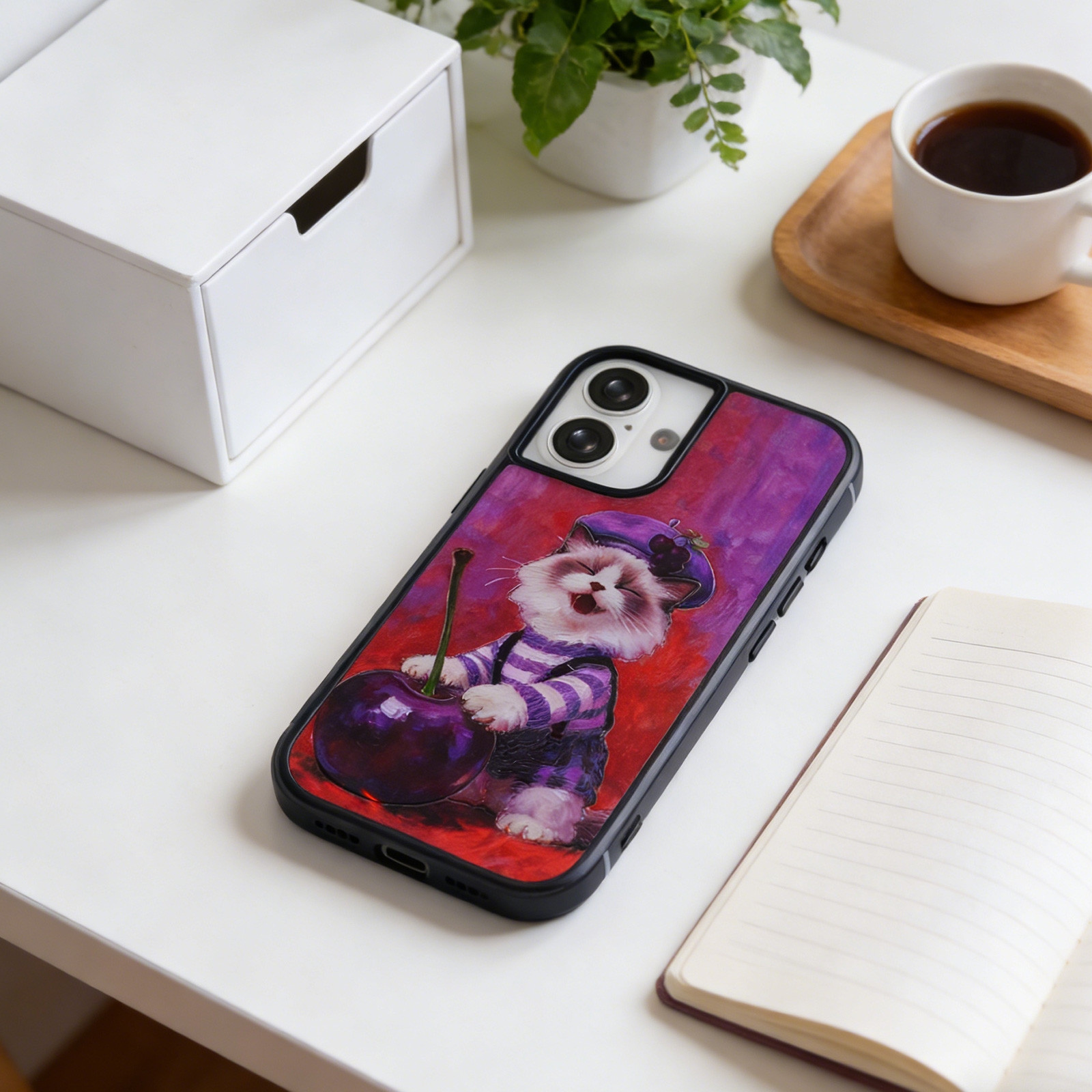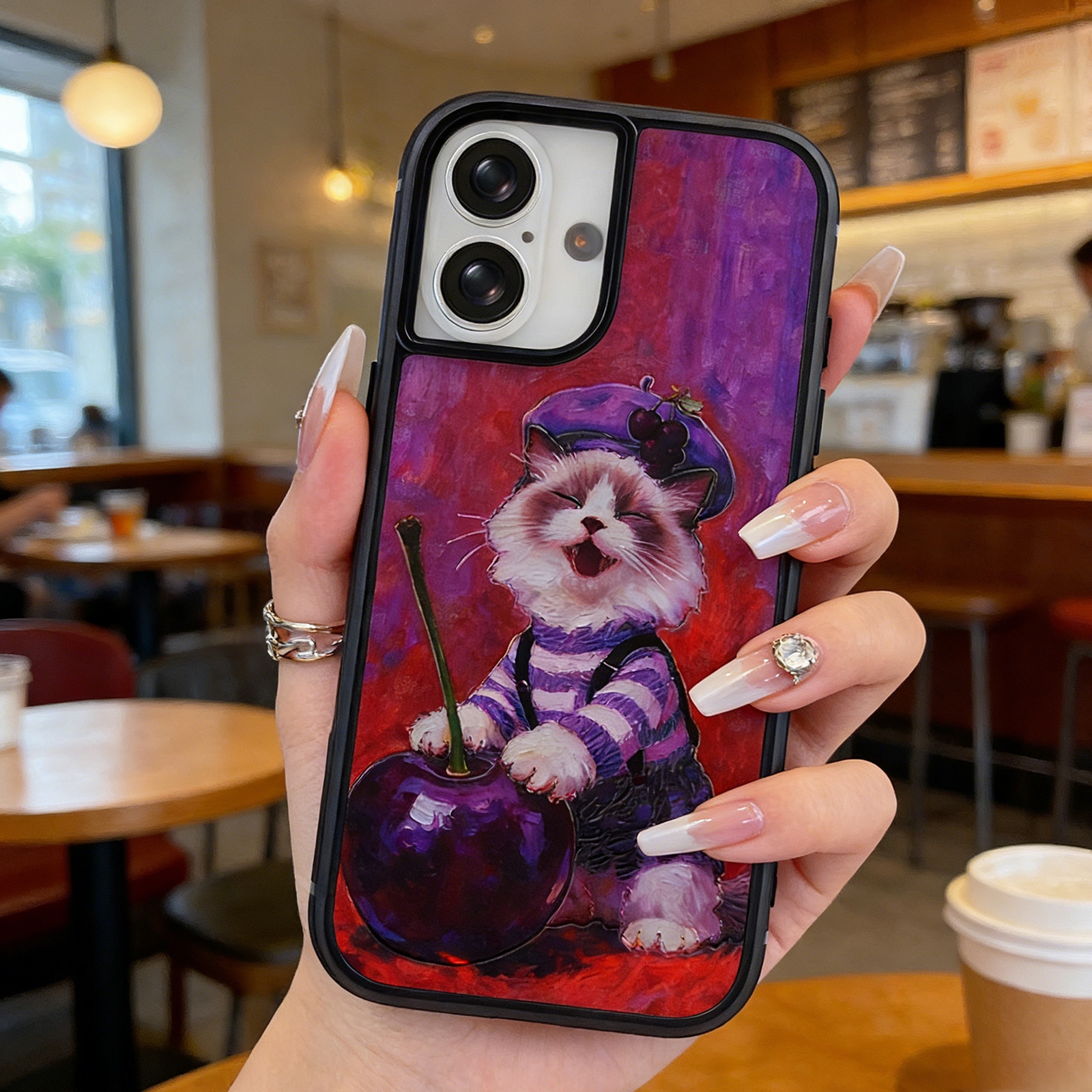 Cute Cherry Cat Phone Case for iPhone 17 - Vintage Oil Painting Art Print Design, Purple