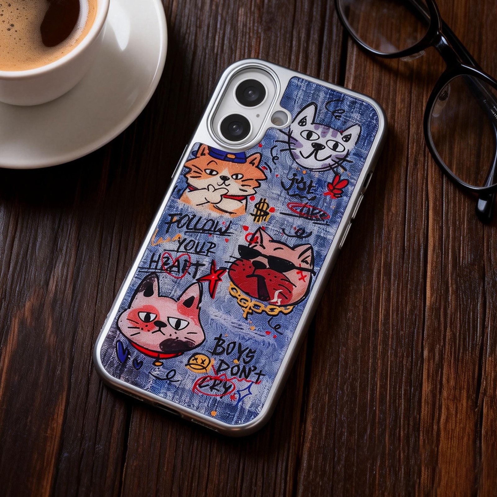 Denim Style Graffiti Cat Magnetic Case for iPhone 17 - Electroplated Frame Protective Phone Cover