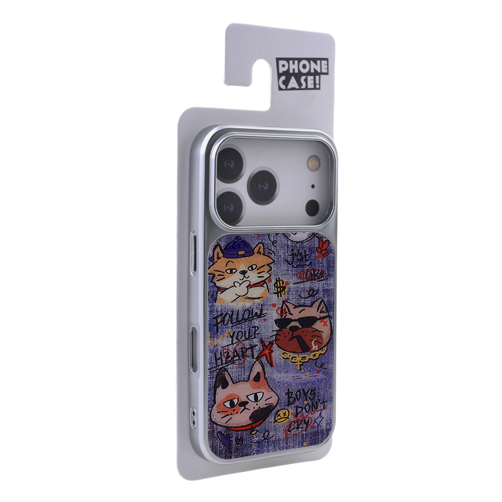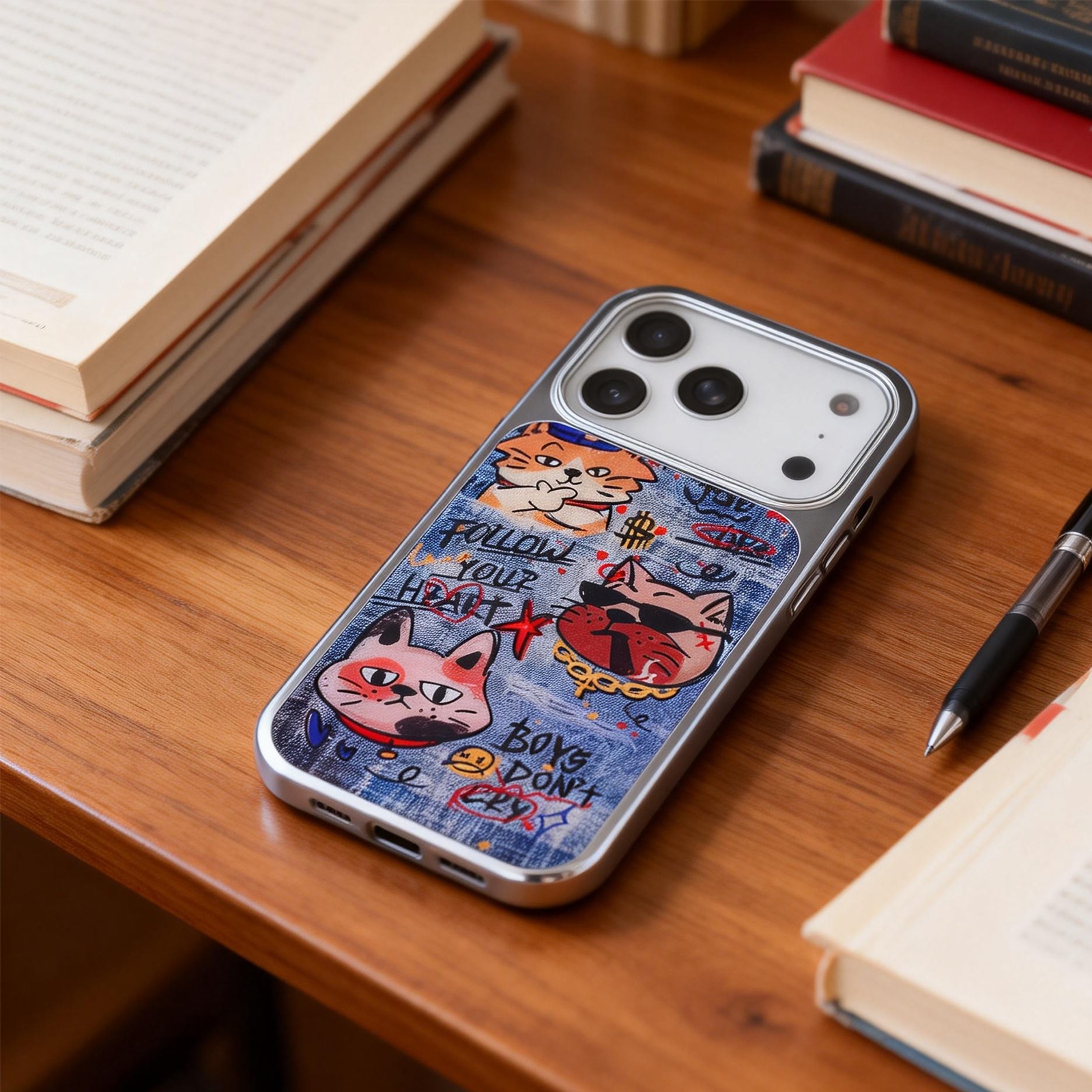 Denim Style Graffiti Cat Magnetic Case for iPhone 17 Pro - Electroplated Frame Protective Phone Cover