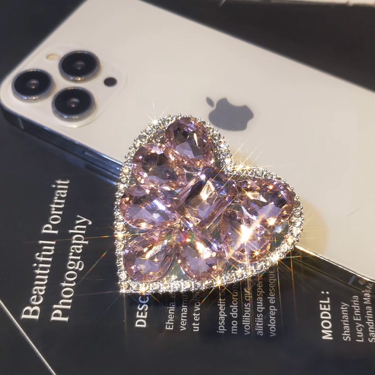 Secure Hold and Stand: Offers a reliable grip for single-hand texting, photo taking, and video viewing. Functions as a sturdy kickstand when unfolded.Foldable and Lightweight: The compact structure folds flat, allowing easy storage in pockets or bags while remaining attached to the phone.Decorative Heart Shape Design: Features a heart-shaped surface with a diamond-like appearance, adding a unique decorative element to your device.Magnetic and Adhesive Support: Includes a strong double-sided adhesive pad for attachment to flat surfaces. Compatible with magnetic phone mounts and cases.Material Compatibility: Adheres to most phone surfaces and cases. Repositionable adhesive leaves no residue upon removal.