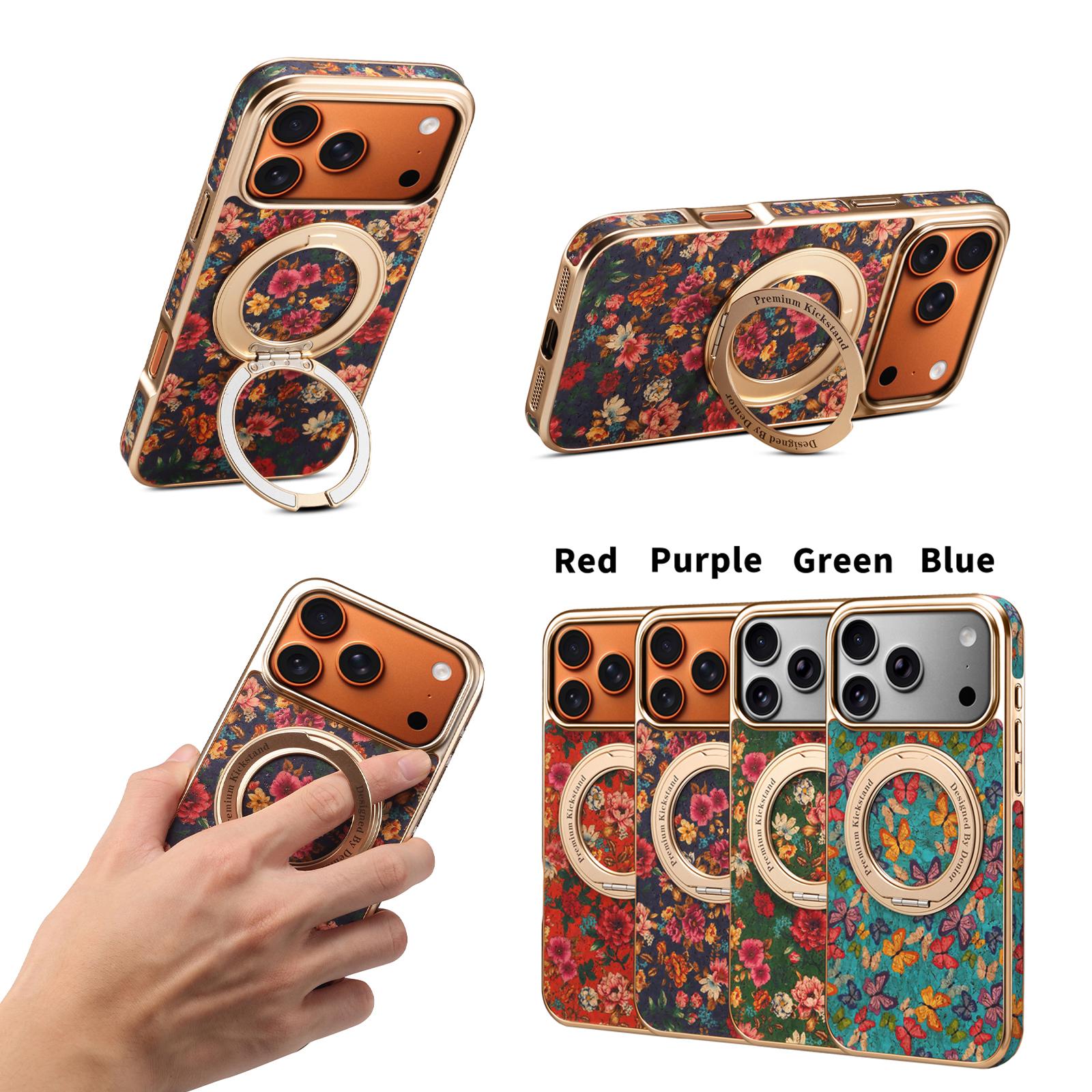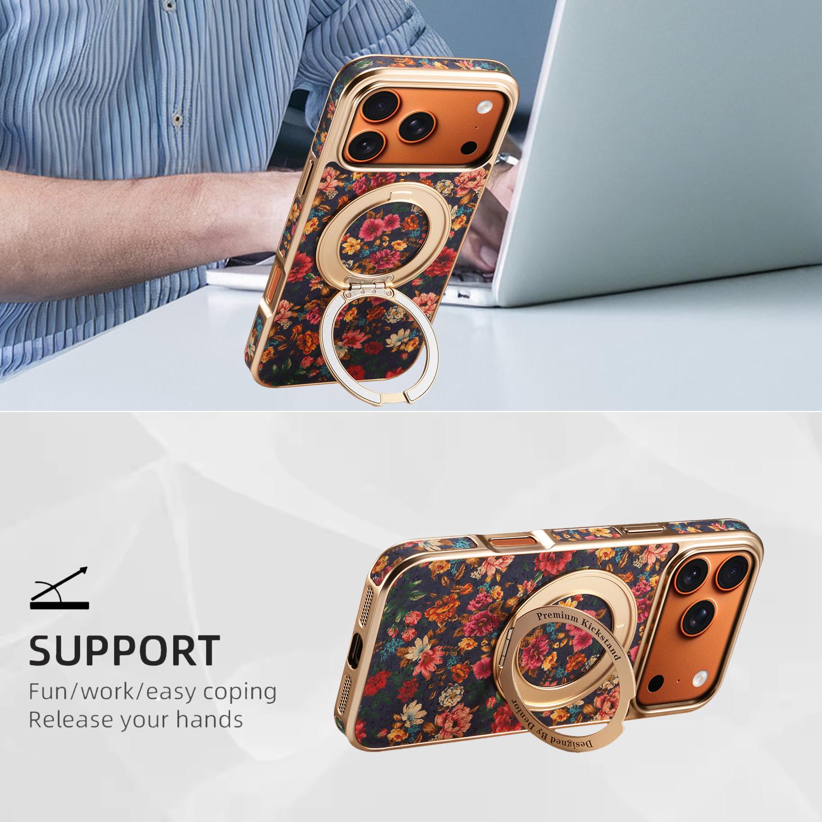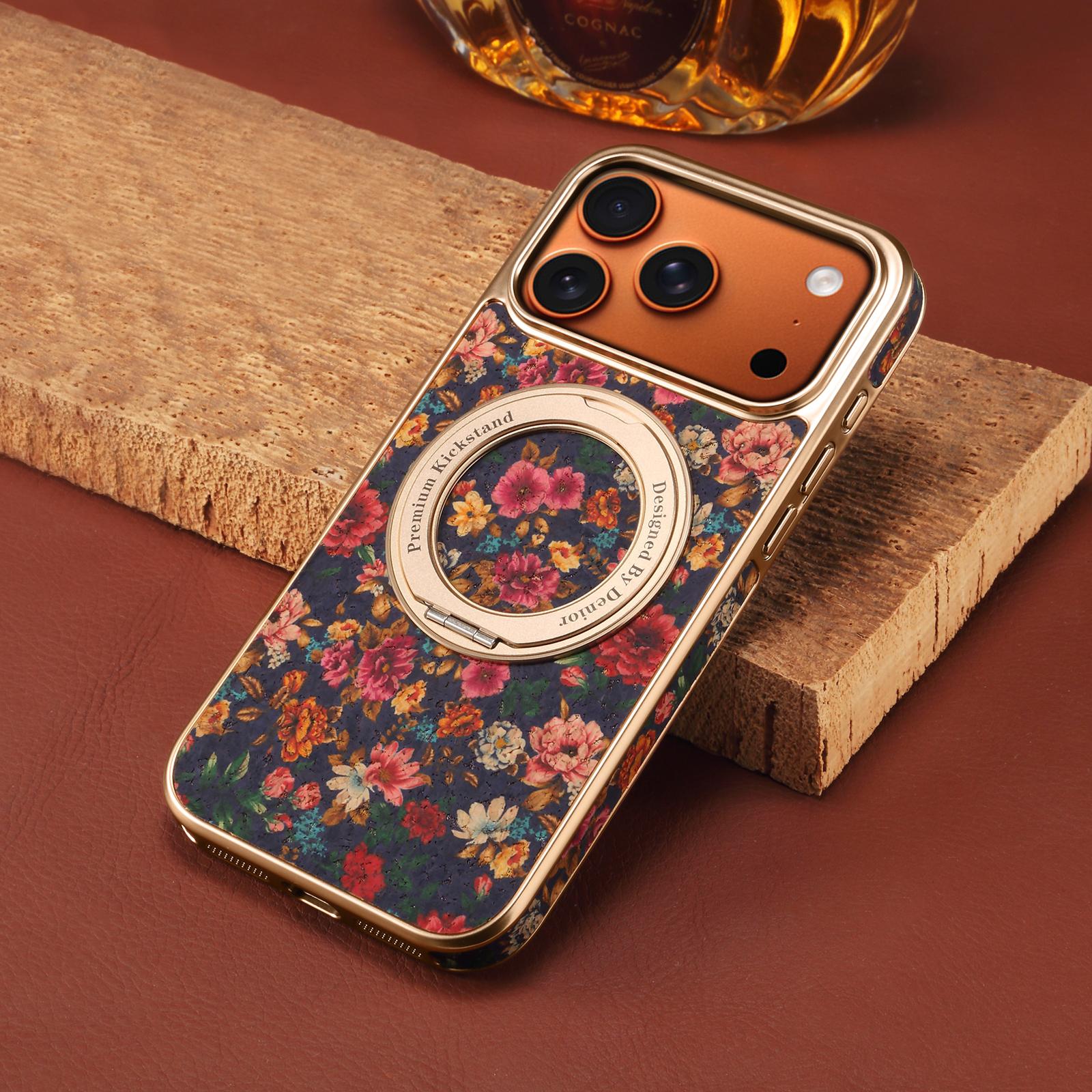 Denior Floral Print Magnetic Gear Rotating Stand Phone Case for iPhone 17 Pro Max | Eco-Friendly Cork | Fingerprint-Resistant Electroplated Case - Peony Purple