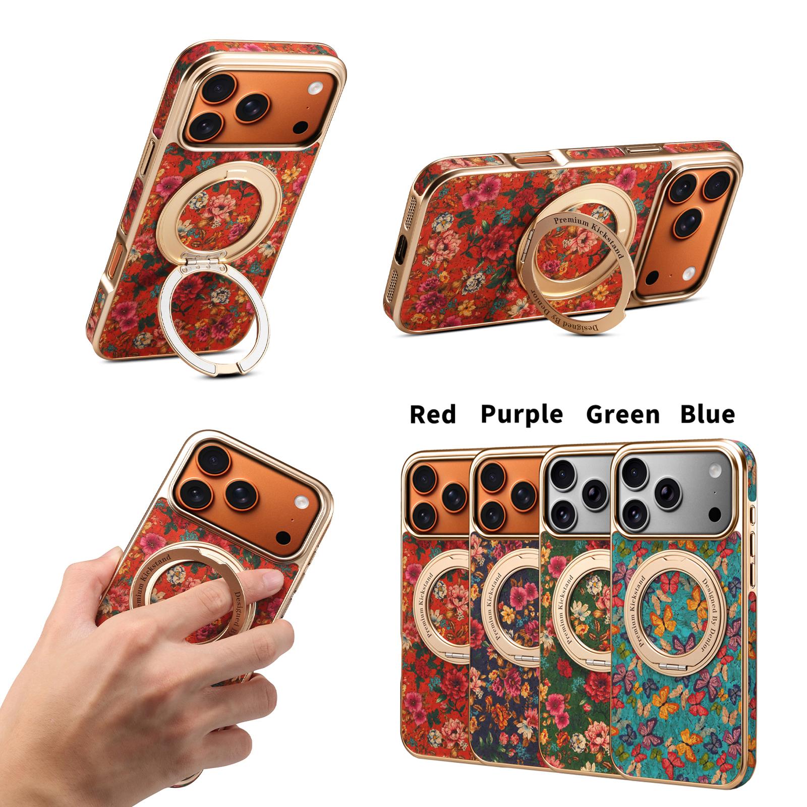 Floral Print Magnetic Gear Rotating Stand Phone Case for iPhone 17 Pro Max, Red