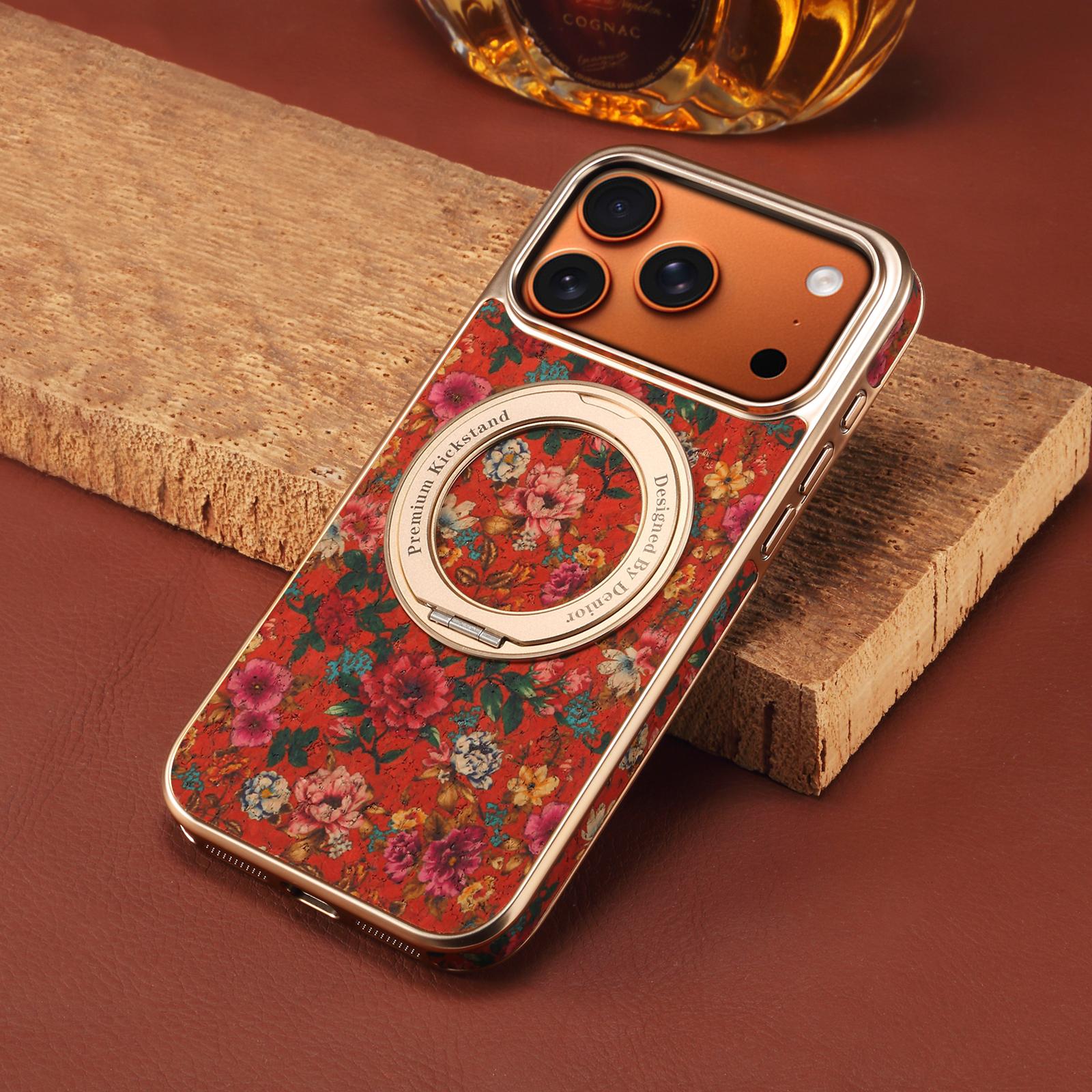 Denior Floral Print Magnetic Gear Rotating Stand Phone Case for iPhone 17 Pro | Eco-Friendly Cork | Fingerprint-Resistant Electroplated Case - Peony Red