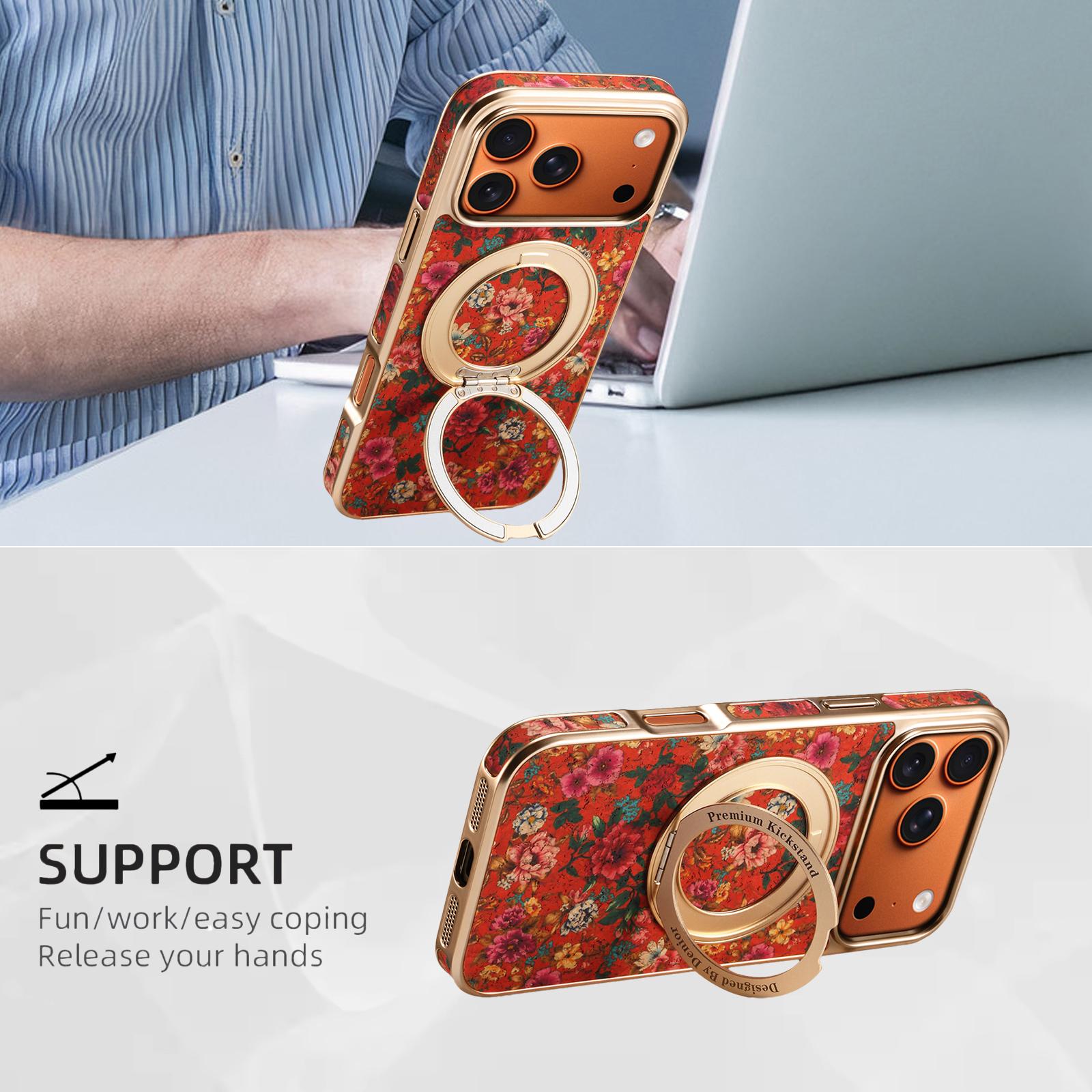 Floral Print Magnetic Gear Rotating Stand Phone Case for iPhone 17 Pro, Red
