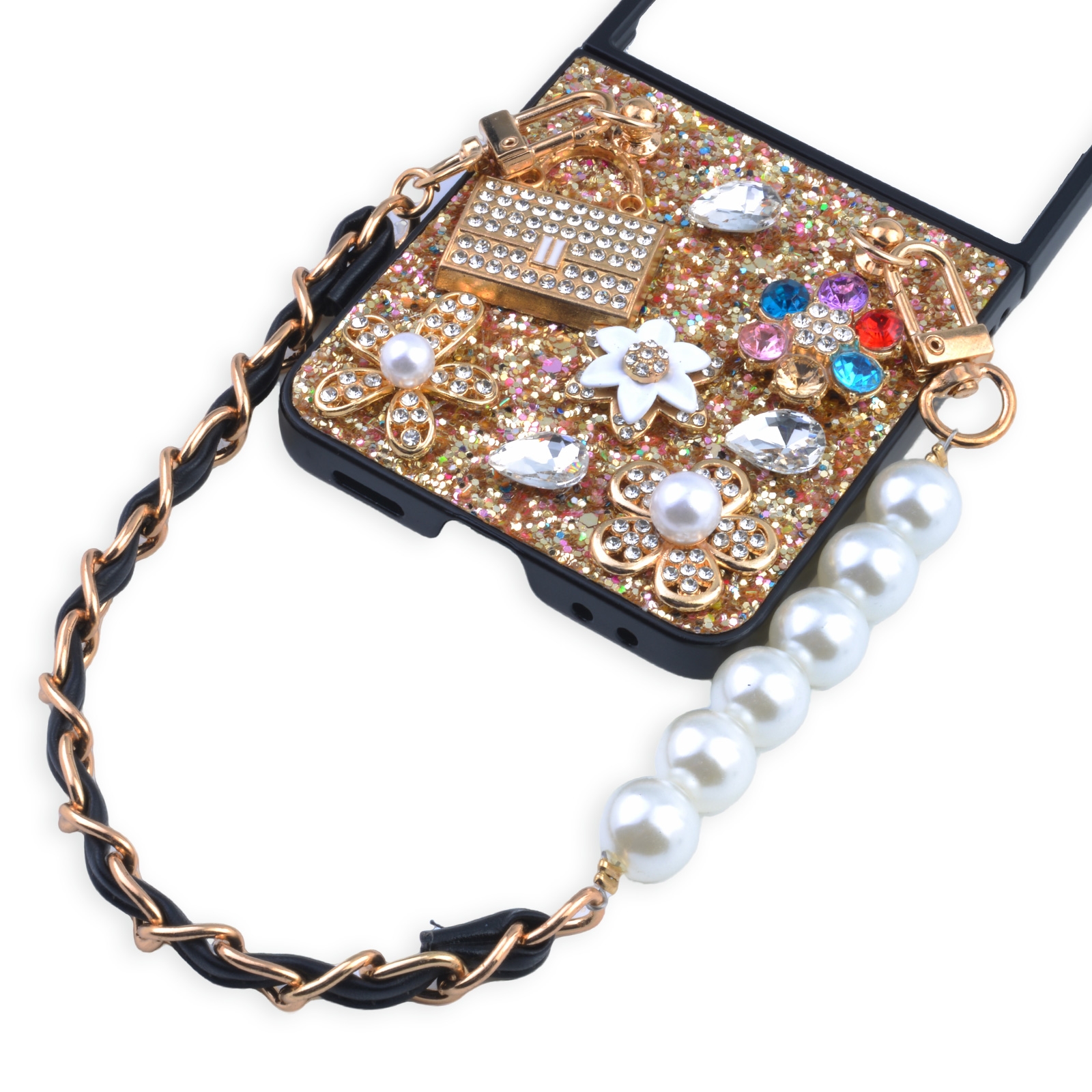 Glitter Rhinestone Case for Z Flip7 with Pearl Leather Chain Strap, Gold