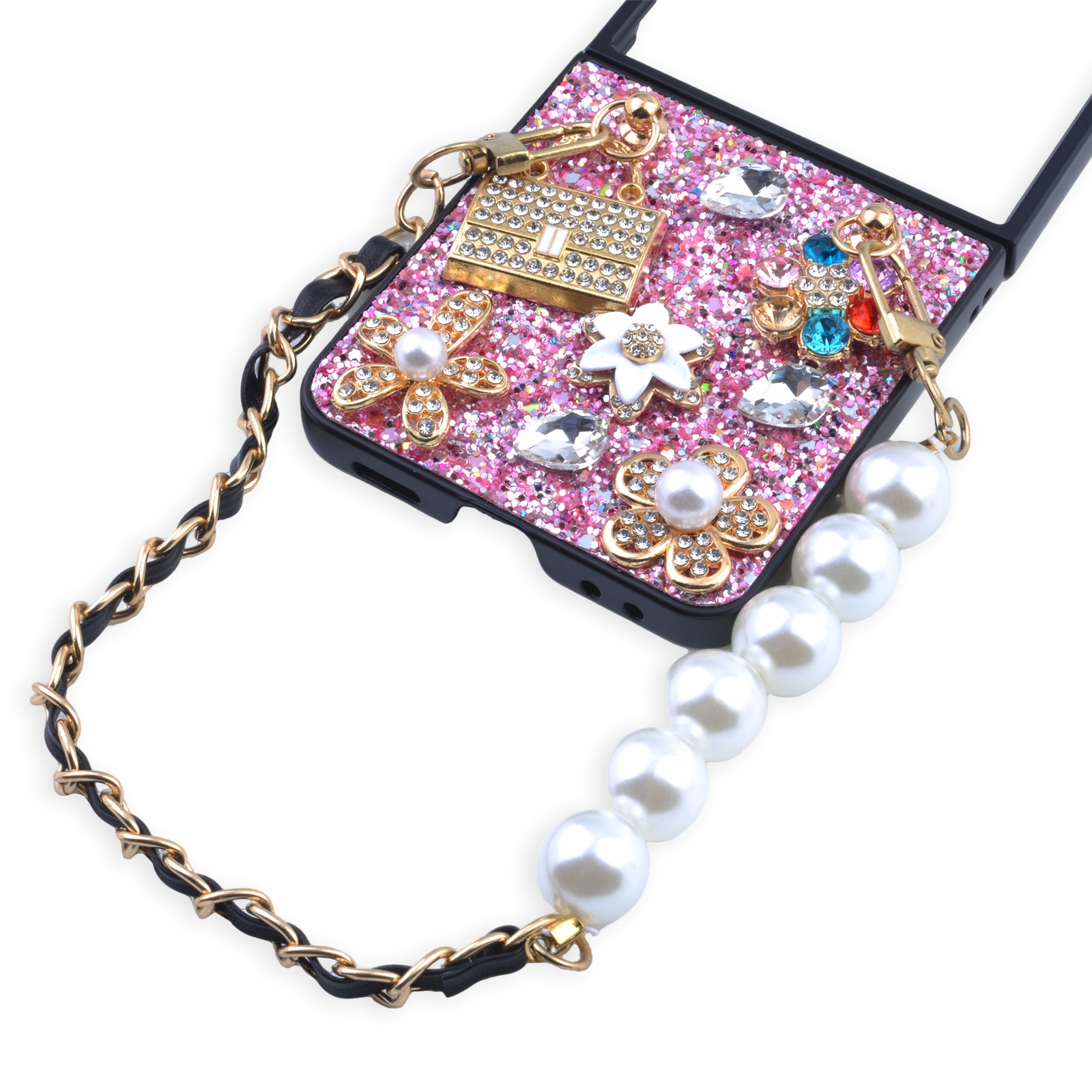 Glitter Rhinestone Case for Z Flip7 with Pearl Leather Chain Strap, Pink