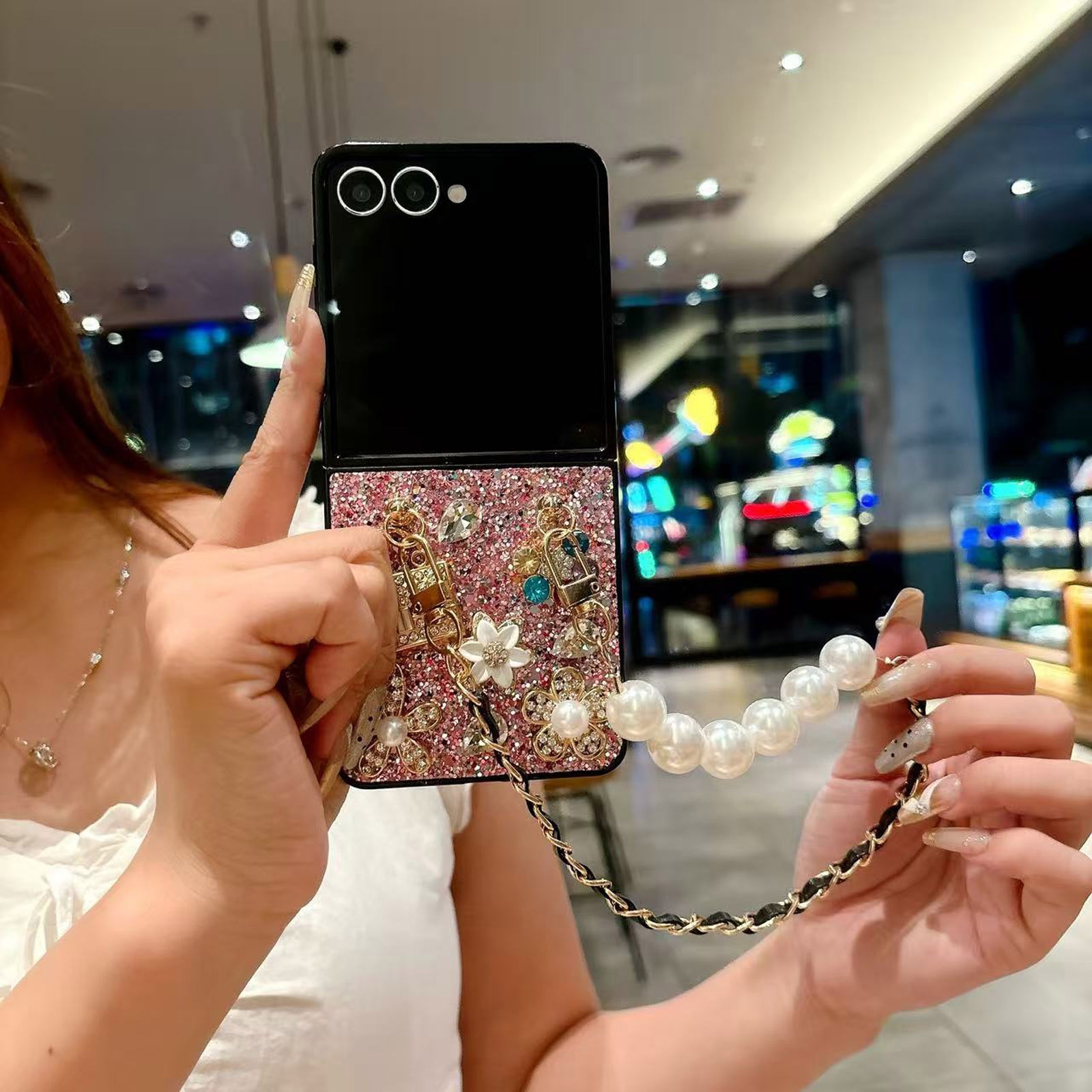 Glitter Rhinestone Case for Z Flip7 with Pearl Leather Chain Strap, Gold