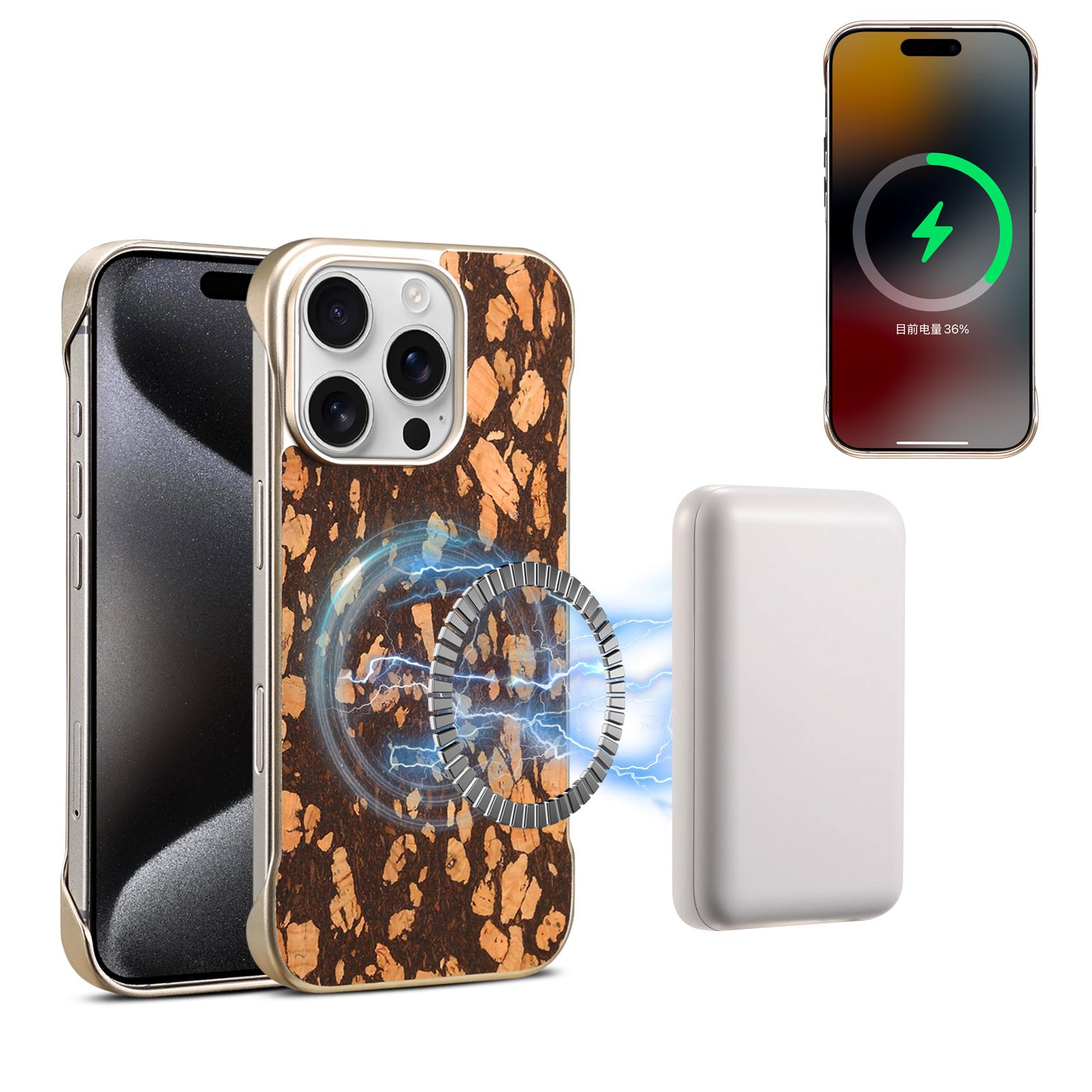 Denior Floral Pattern Frameless Phone Case for iPhone 16 Pro | Built-in N52 Magnet & MagSafe Wireless Charging Compatible | Eco-friendly Cork Material | Light Gold Painted Case - Granular Black