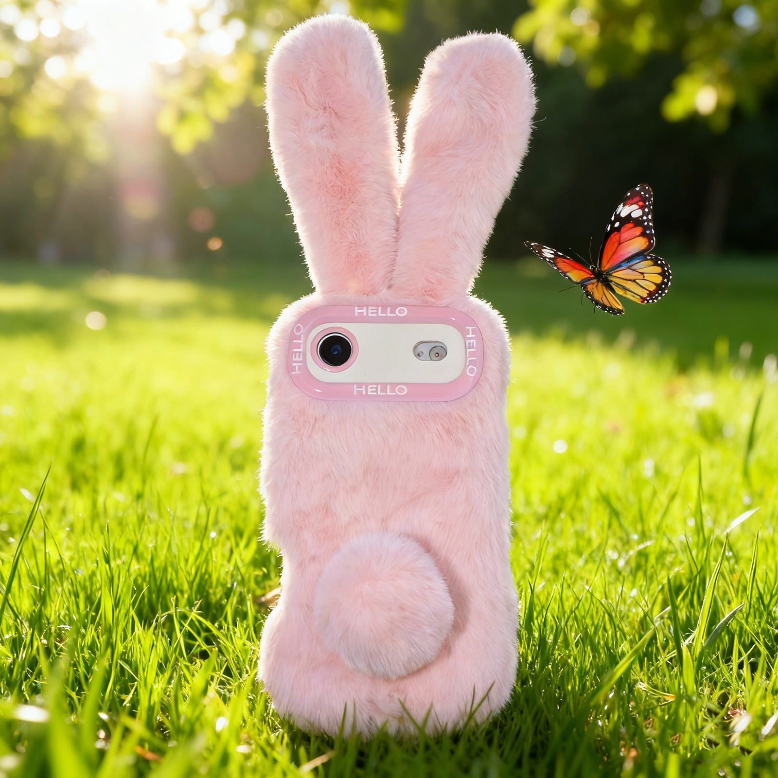 Pink Plush Silicone Bunny with Tail Phone Case for iPhone Air – Soft Furry Cute Protective Cover