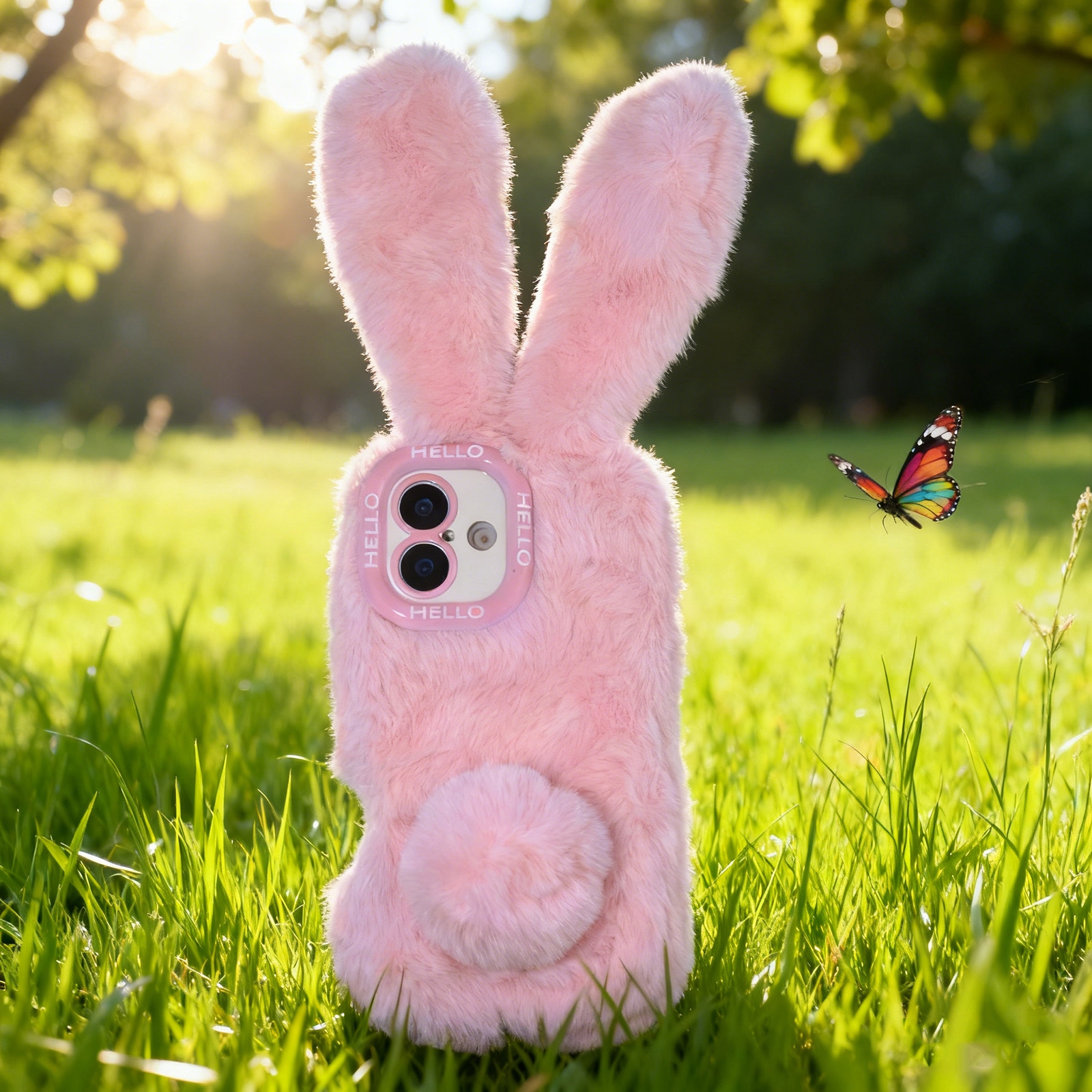 Pink Plush Silicone Bunny with Tail Phone Case for iPhone 16 Plus – Soft Furry Cute Protective Cover