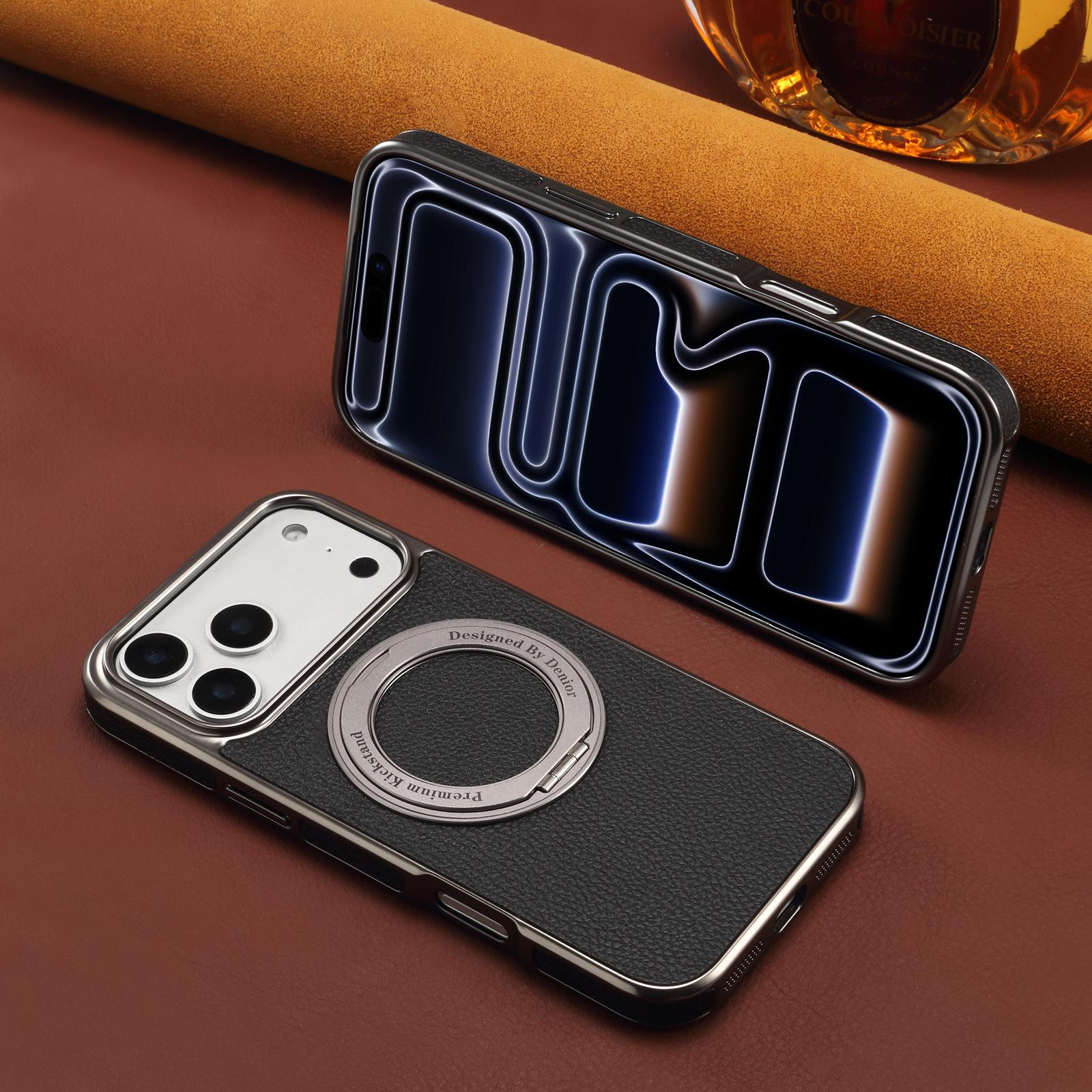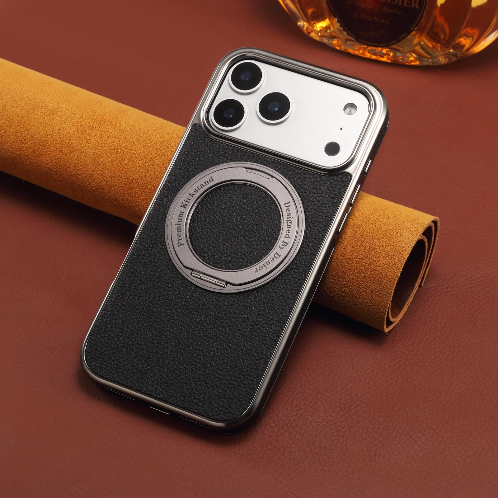 All pictures shown are for illustration purpose only. Actual product may vary due to product enhancement.Denior Lychee Texture 360 Rotating Gear Kickstand Electroplated Phone Case for iPhone 17 Pro Max | PU Faux Leather | No Wireless Charging - Black