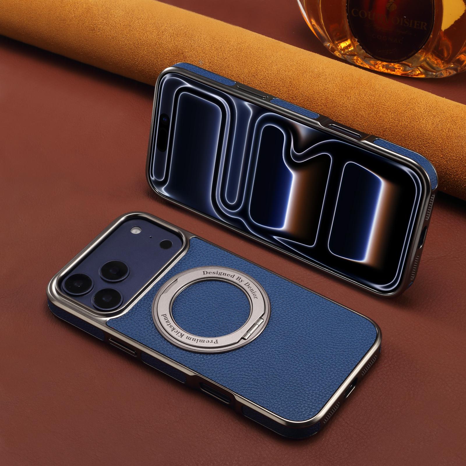 All pictures shown are for illustration purpose only. Actual product may vary due to product enhancement.Denior Lychee Texture 360 Rotating Gear Kickstand Electroplated Phone Case for iPhone 17 Pro Max | PU Faux Leather | No Wireless Charging - Blue