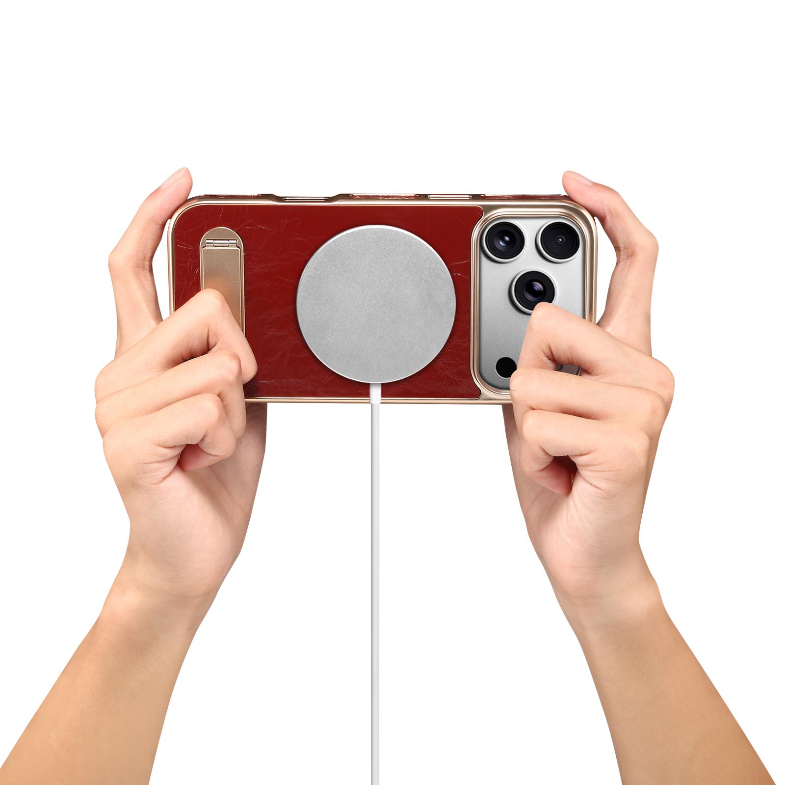 All pictures shown are for illustration purpose only. Actual product may vary due to product enhancement.Denior Top-Grain Leather Single-Stand Electroplated Phone Case for iPhone 17 Pro Max | Genuine Cowhide Leather | Wireless Charging Supported - Red