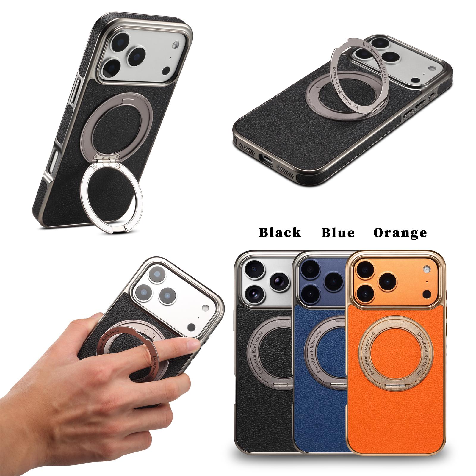 All pictures shown are for illustration purpose only. Actual product may vary due to product enhancement.Denior Lychee Texture 360 Rotating Gear Kickstand Electroplated Phone Case for iPhone 17 Pro Max | PU Faux Leather | No Wireless Charging - Black