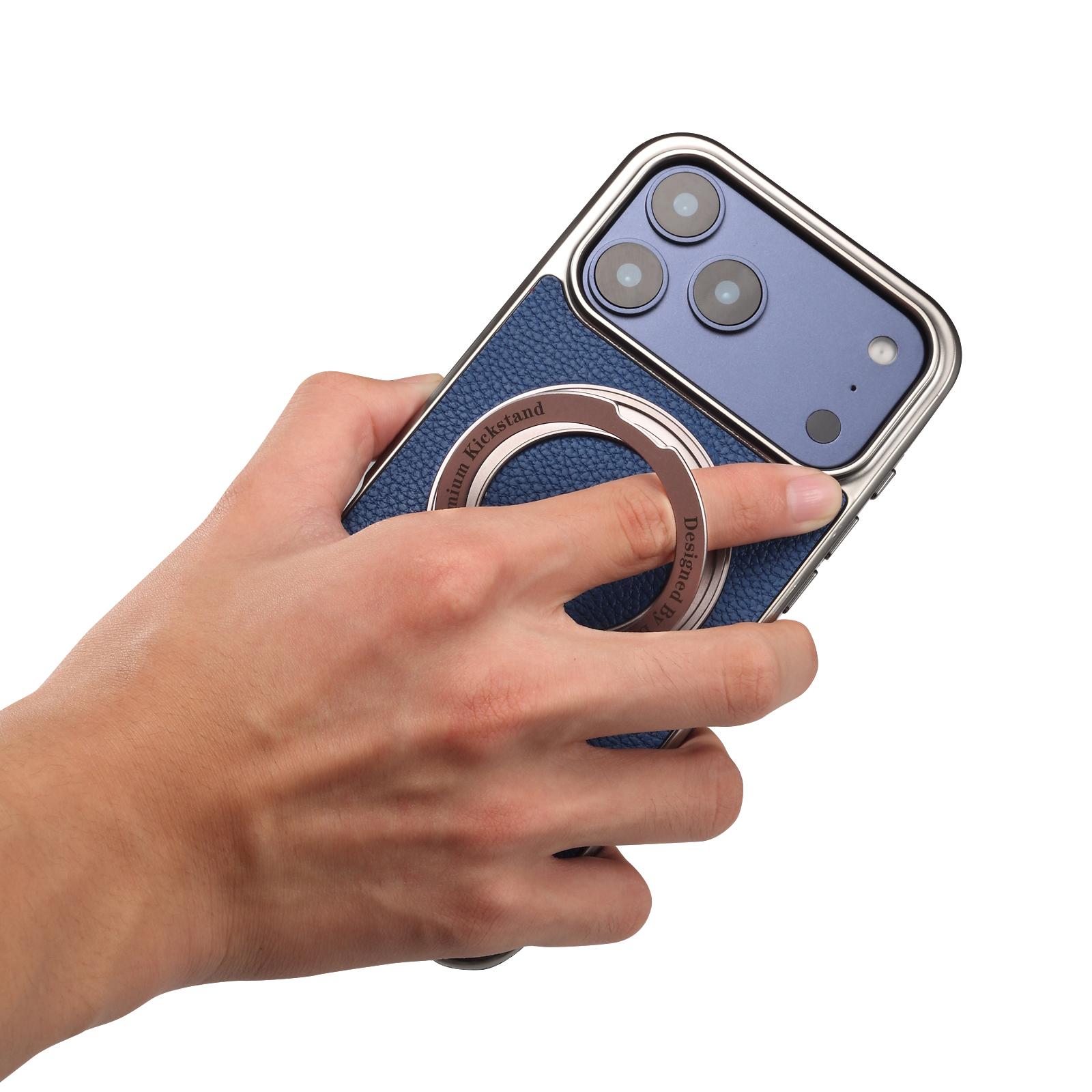All pictures shown are for illustration purpose only. Actual product may vary due to product enhancement.Denior Lychee Texture 360 Rotating Gear Kickstand Electroplated Phone Case for iPhone 17 Pro Max | PU Faux Leather | No Wireless Charging - Blue
