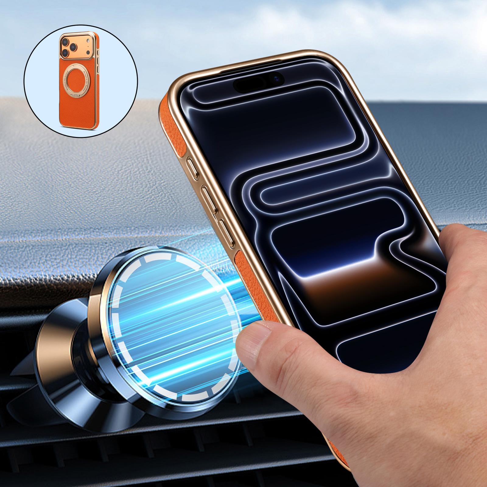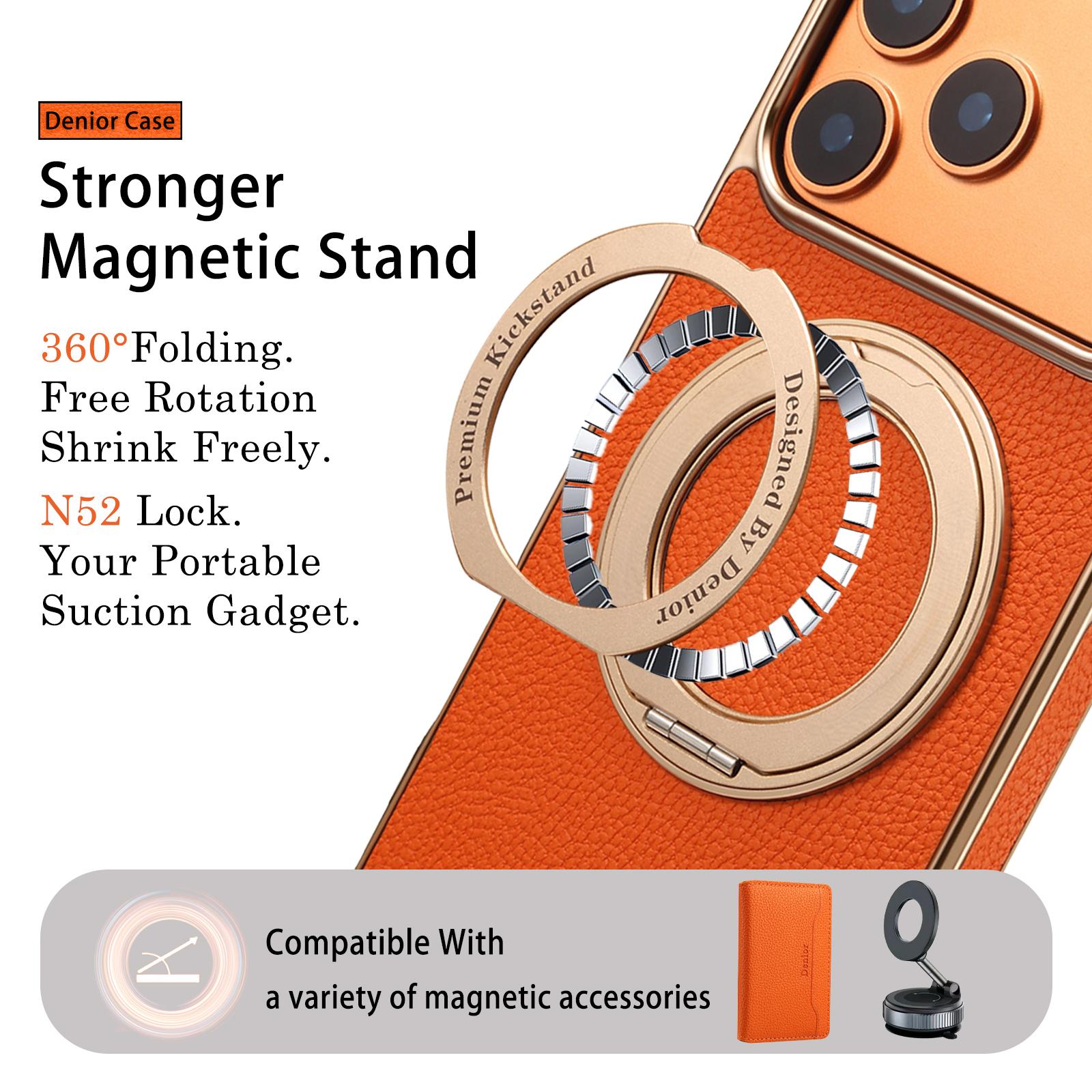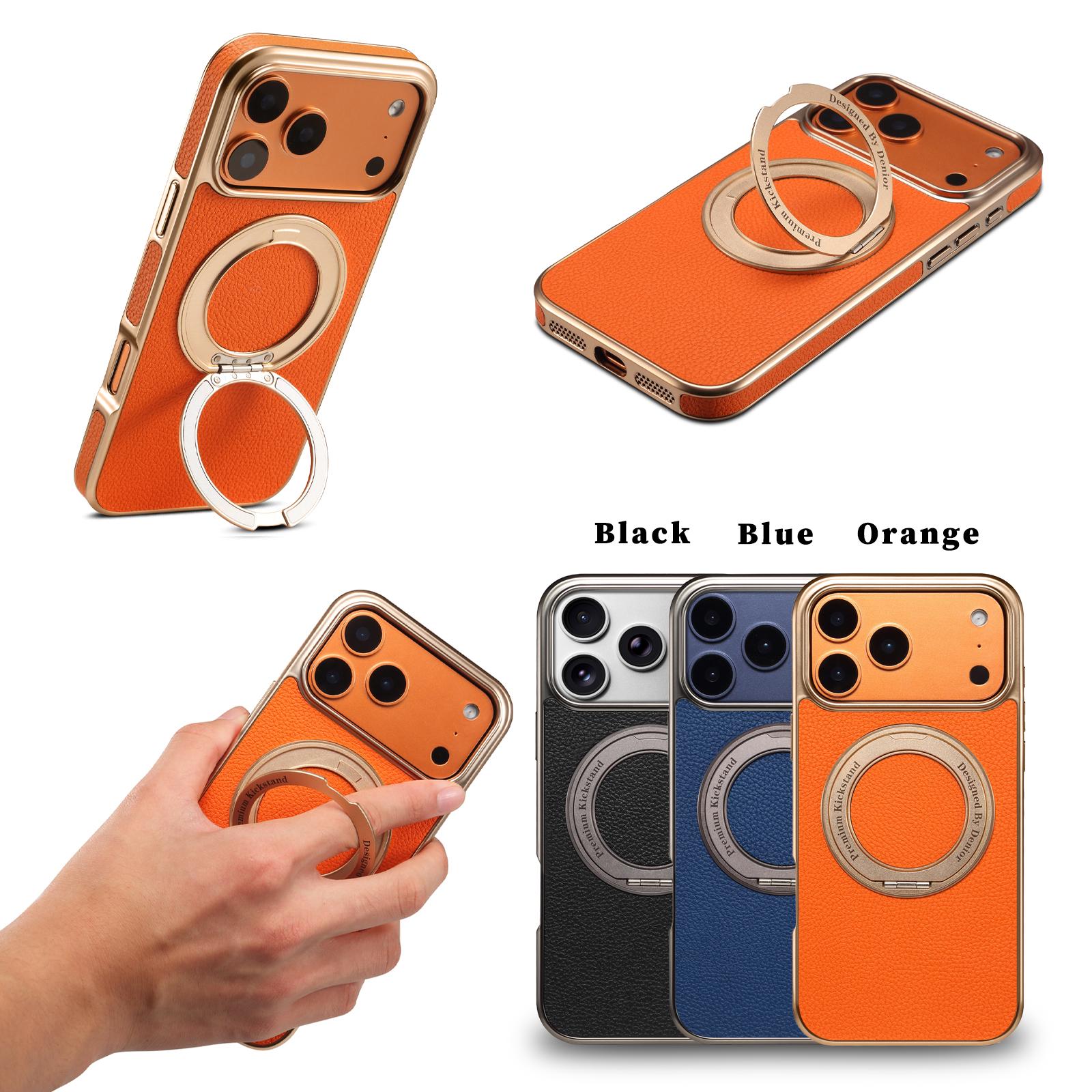 All pictures shown are for illustration purpose only. Actual product may vary due to product enhancement.Denior Lychee Texture 360 Rotating Gear Kickstand Electroplated Phone Case for iPhone 17 Pro Max | PU Faux Leather | No Wireless Charging - Orange