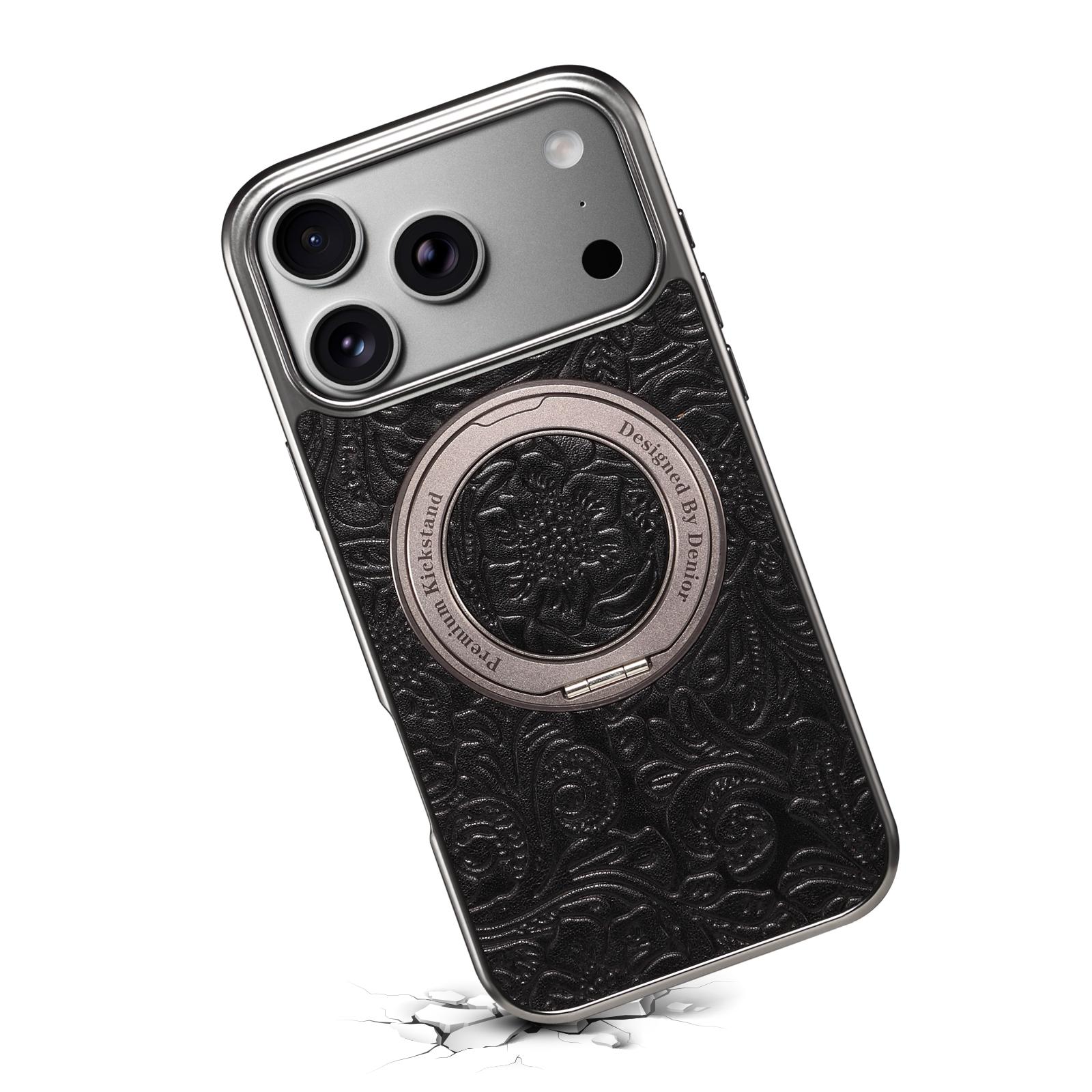 All pictures shown are for illustration purpose only. Actual product may vary due to product enhancement.Denior Retro Tang-style Flower 360 Rotating Gear Kickstand Electroplated Phone Case for iPhone 17 Pro Max | Genuine Cowhide Leather | No Wireless Charging - Black