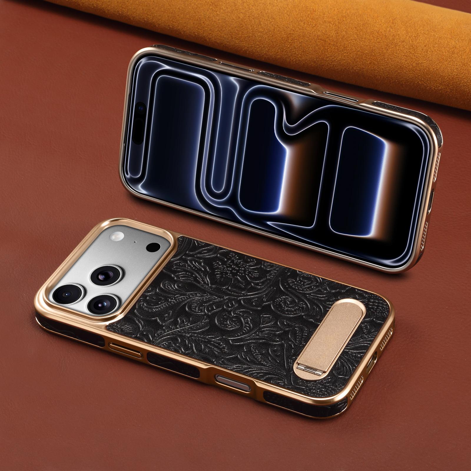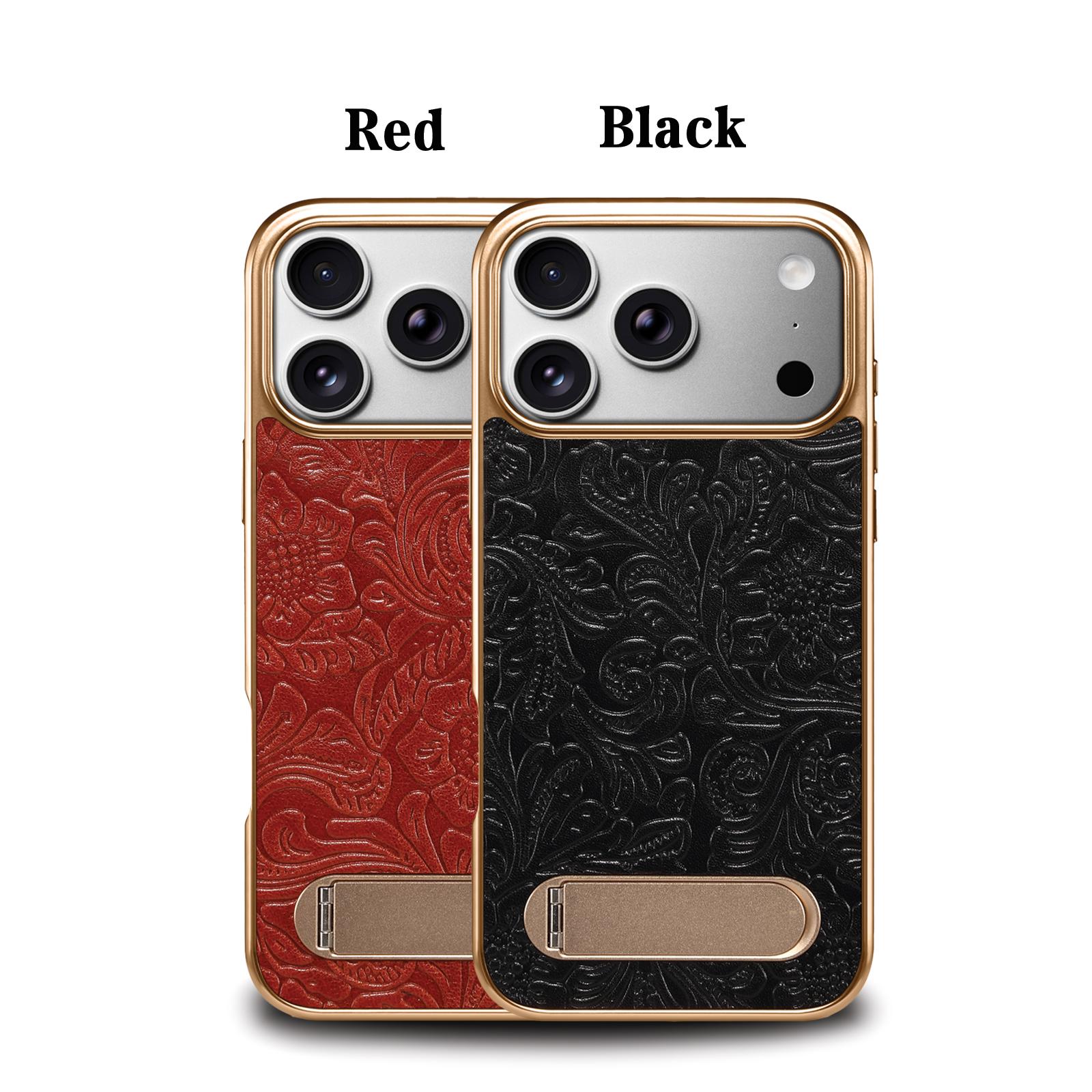 All pictures shown are for illustration purpose only. Actual product may vary due to product enhancement.Denior Retro Tang-style Flower Single-Stand Electroplated Phone Case for iPhone 17 Pro Max | Genuine Cowhide Leather | Wireless Charging Supported - Black