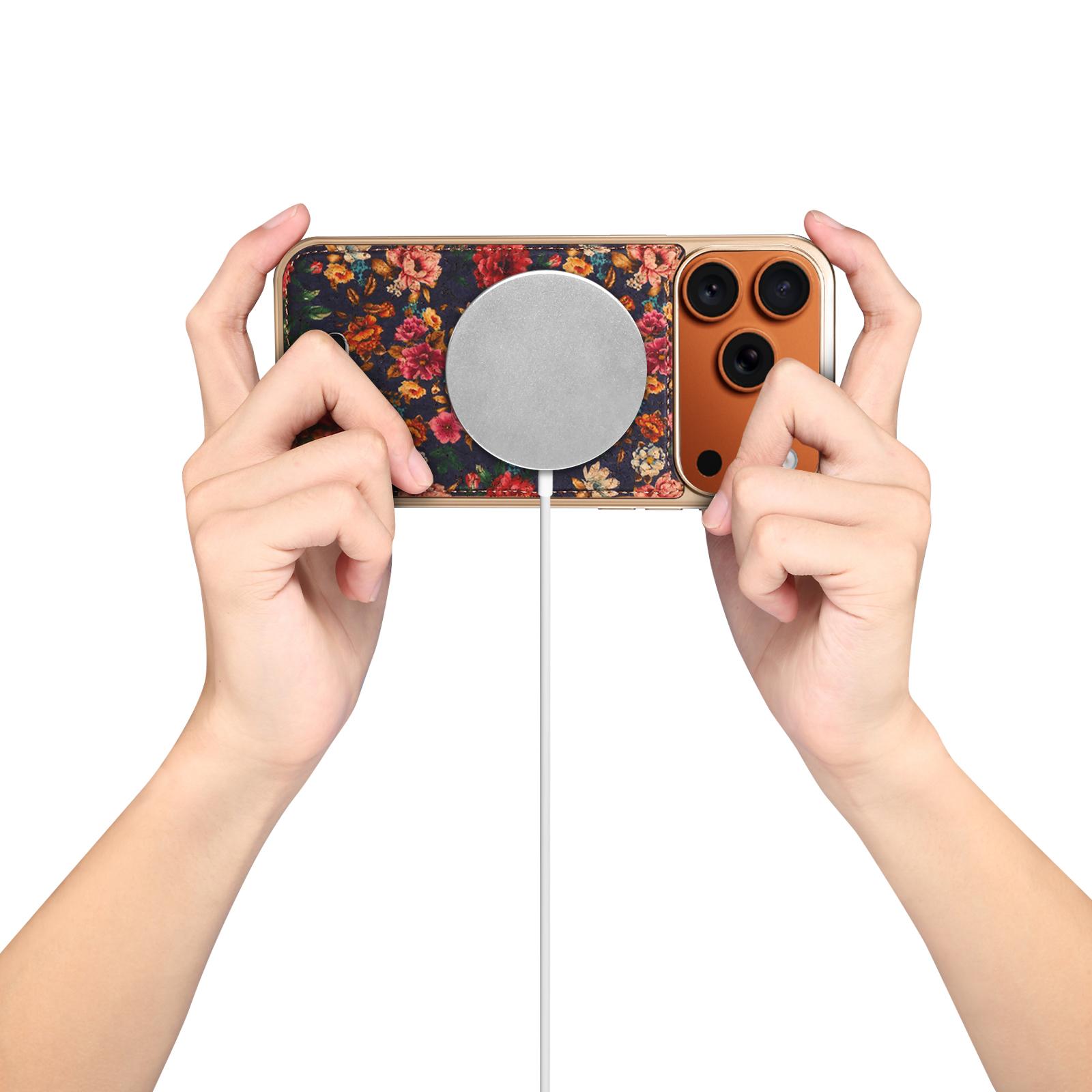 All pictures shown are for illustration purpose only. Actual product may vary due to product enhancement.Denior Printed Magnetic Detachable Electroplated Phone Case for iPhone 17 Pro | Cork Material | Wireless Charging Supported - Peony Purple