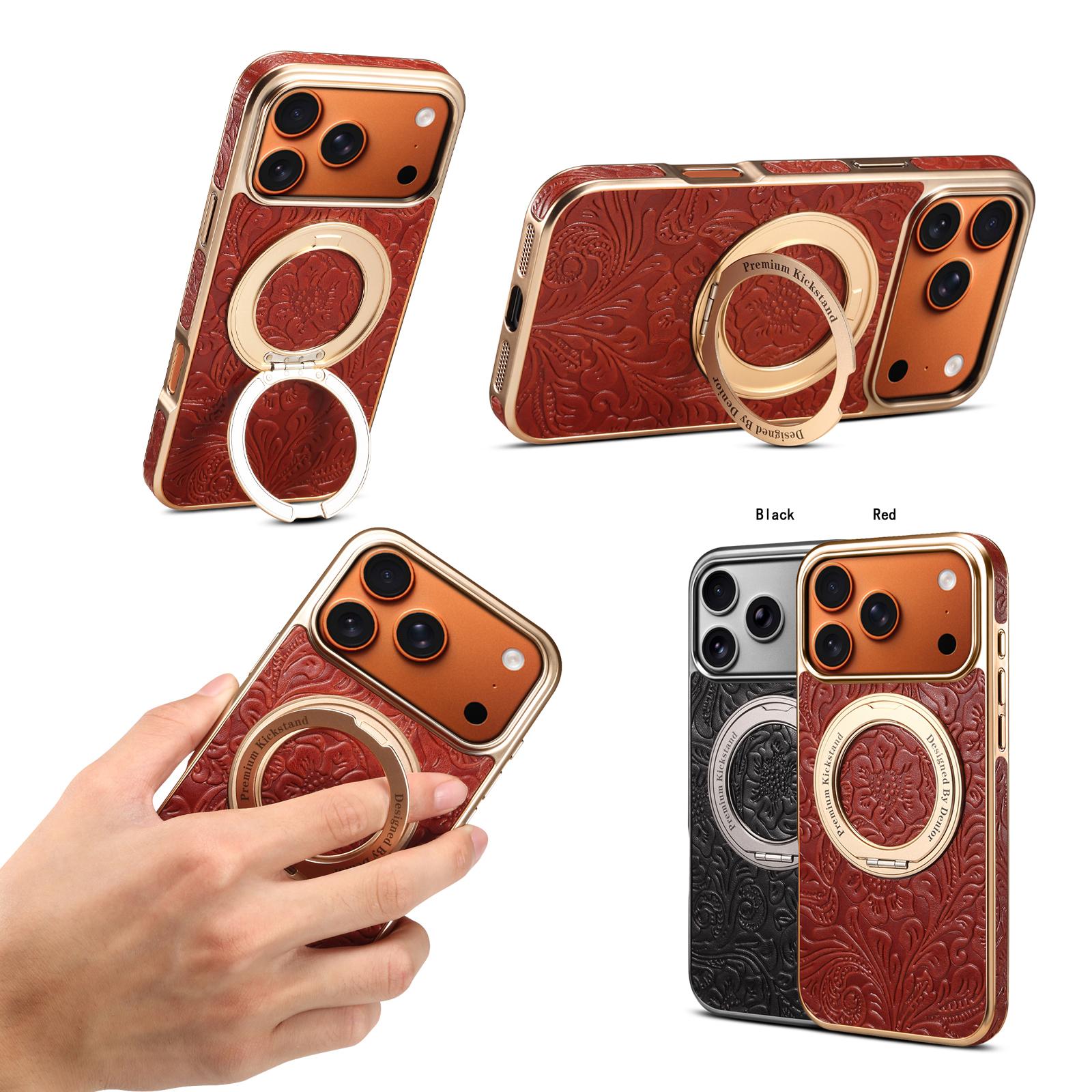 All pictures shown are for illustration purpose only. Actual product may vary due to product enhancement.Denior Retro Tang-style Flower 360 Rotating Gear Kickstand Electroplated Phone Case for iPhone 17 Pro | Genuine Cowhide Leather | No Wireless Charging - Red