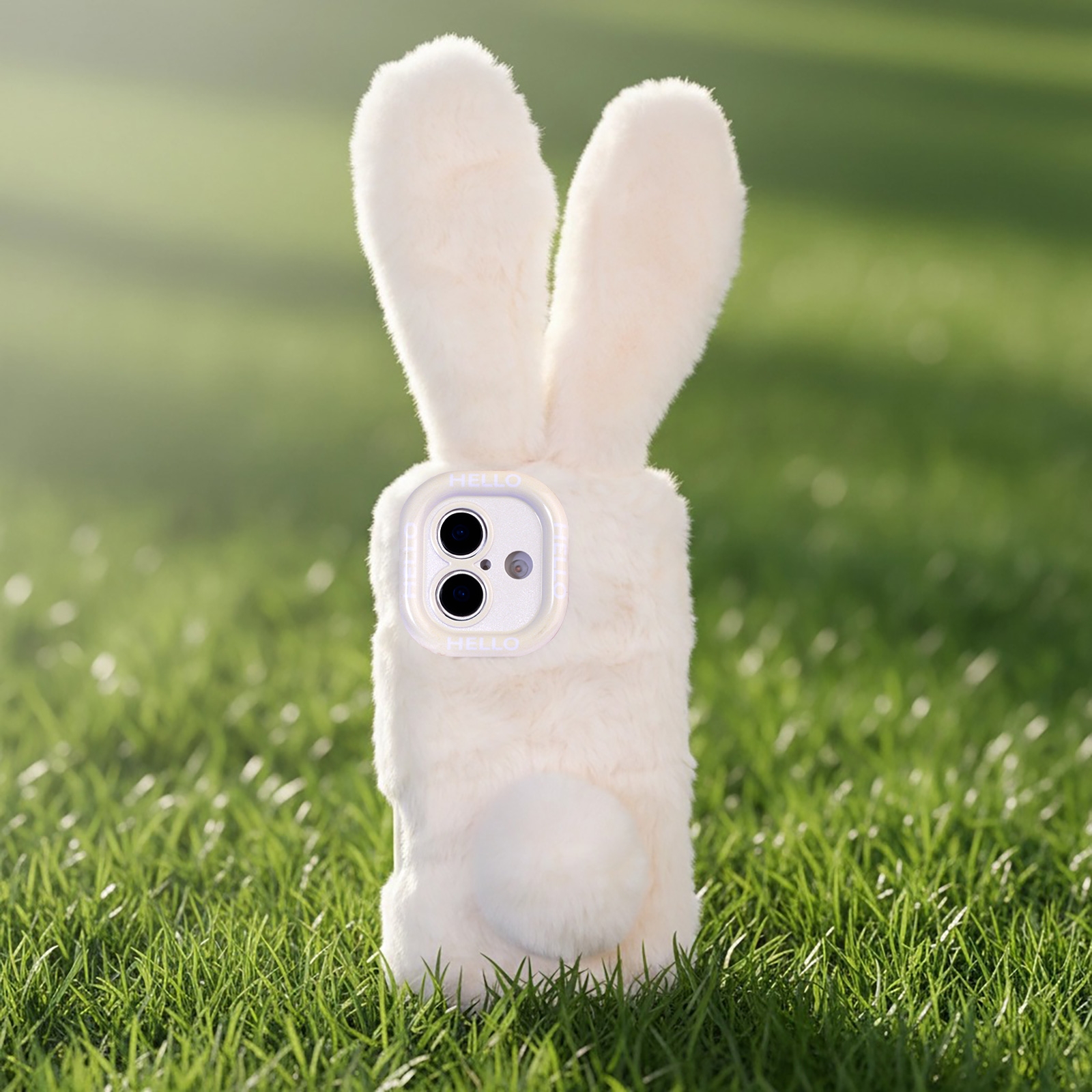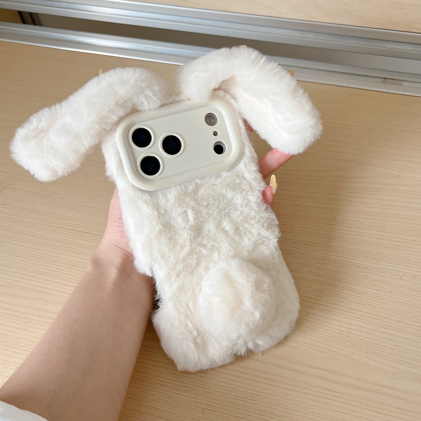 - Soft Plush Exterior: Covered in beige fuzzy material resembling rabbit fur, with ears and a tail accent.