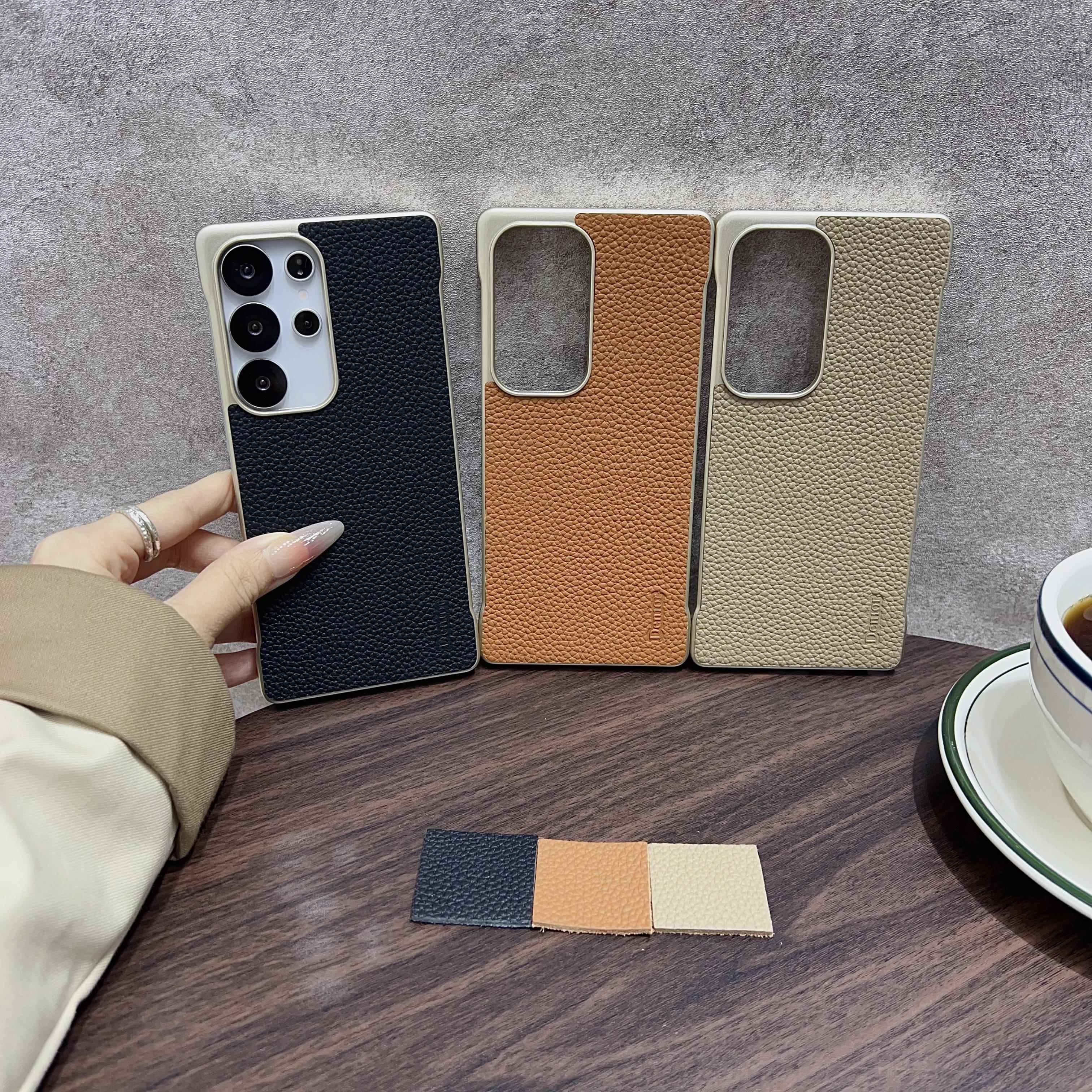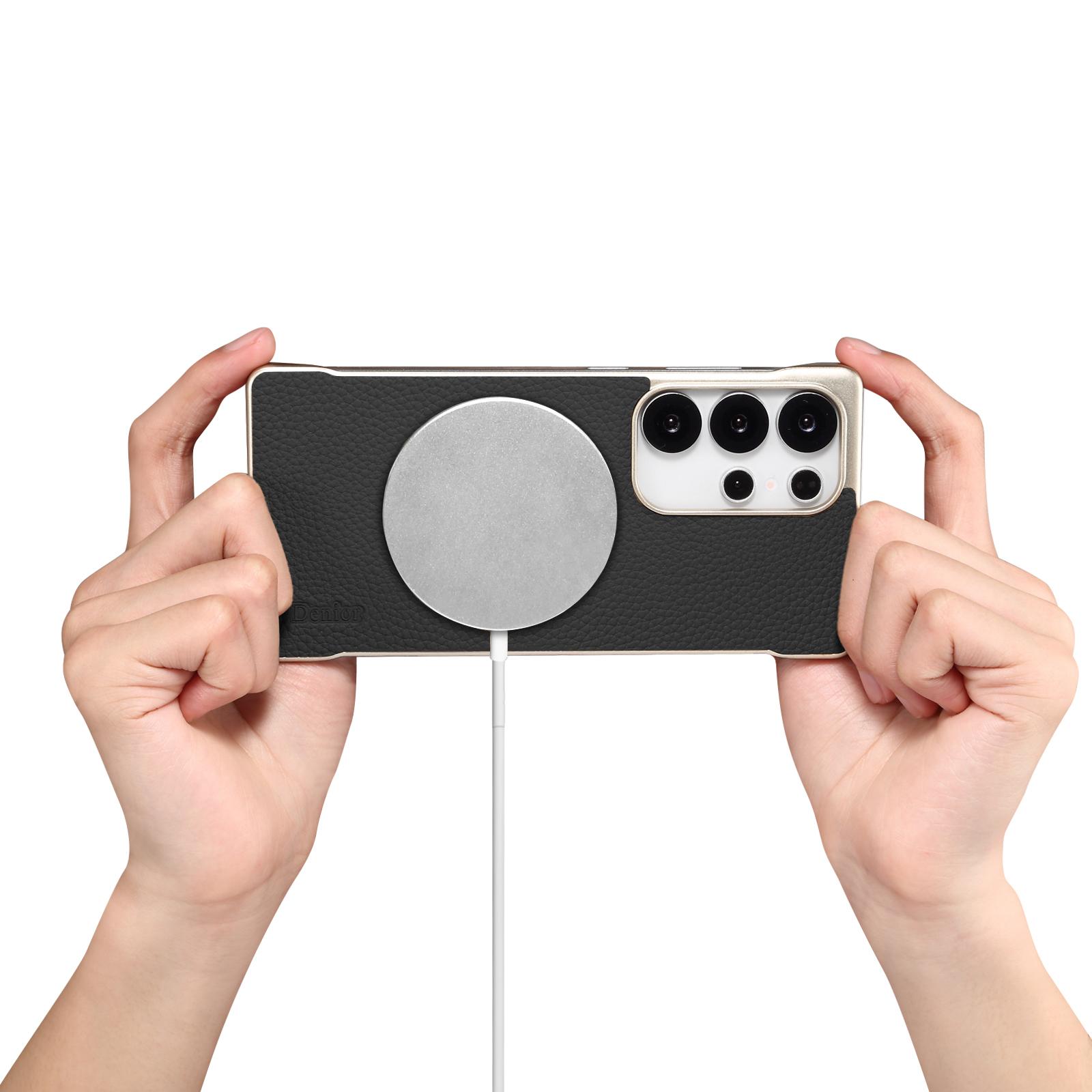 Denior Lychee Pattern Genuine Cowhide Leather Frameless Phone Case for Samsung Galaxy S25 Ultra | Built-in N52 Magnet & MagSafe Wireless Charging Compatible | Genuine Cowhide Leather | Light Gold Painted Case - Black