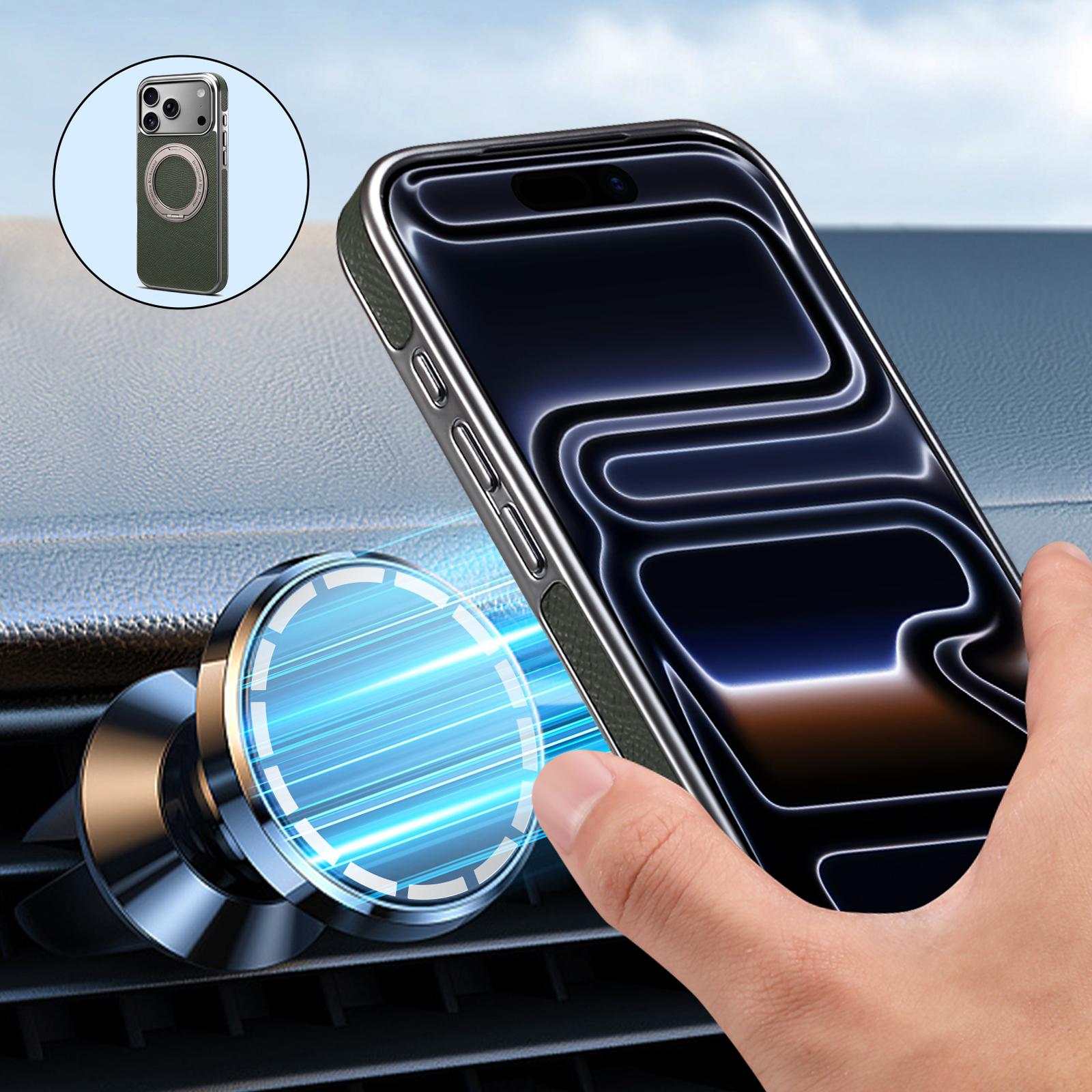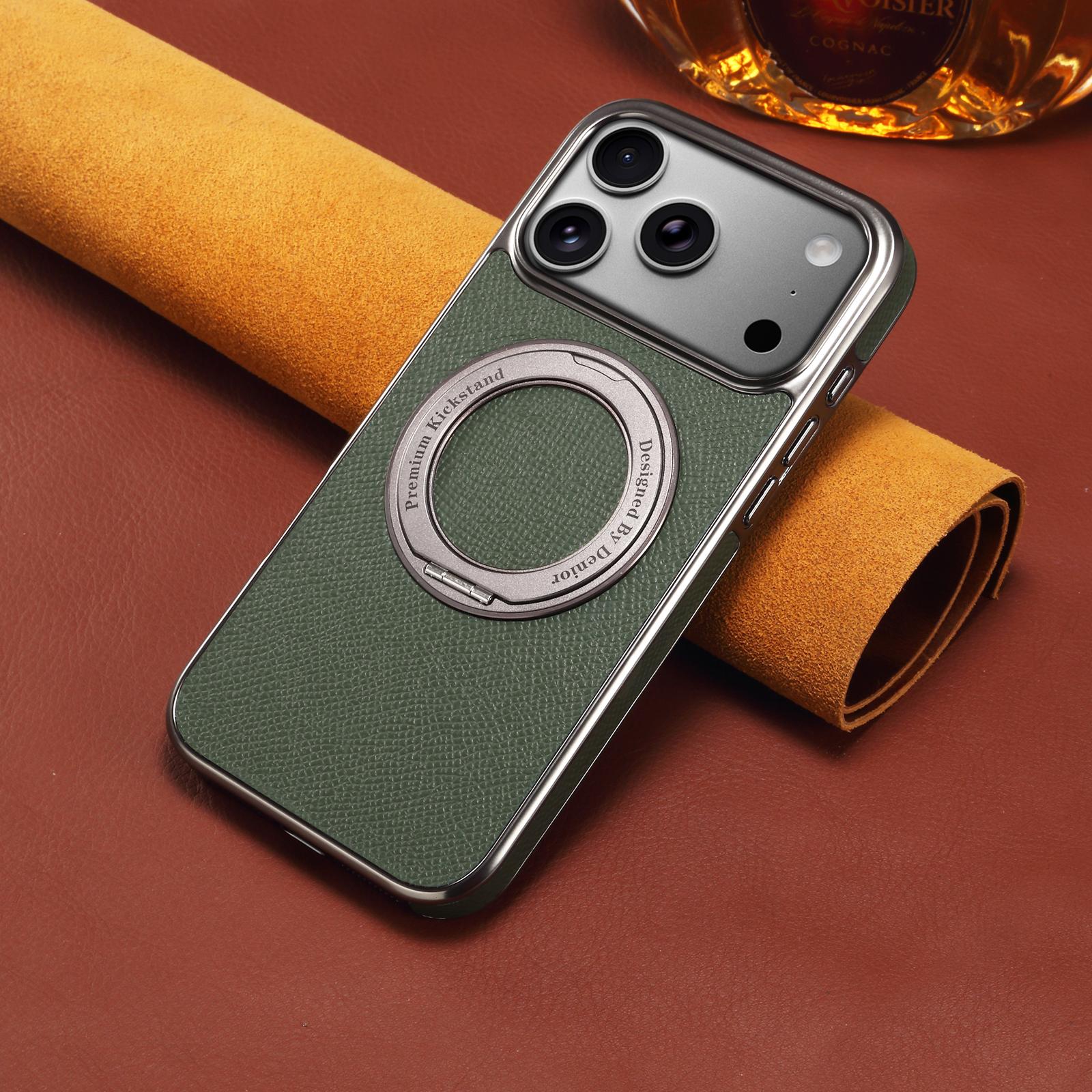Denior Magnetic Gear Rotating Stand Phone Case for iPhone 17 Pro Max | Genuine Cowhide Leather | Fingerprint-Resistant Electroplated Case - Green