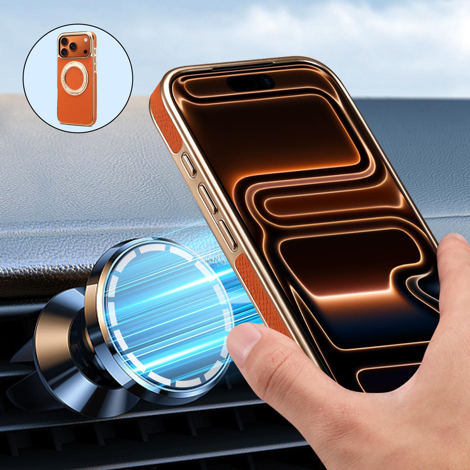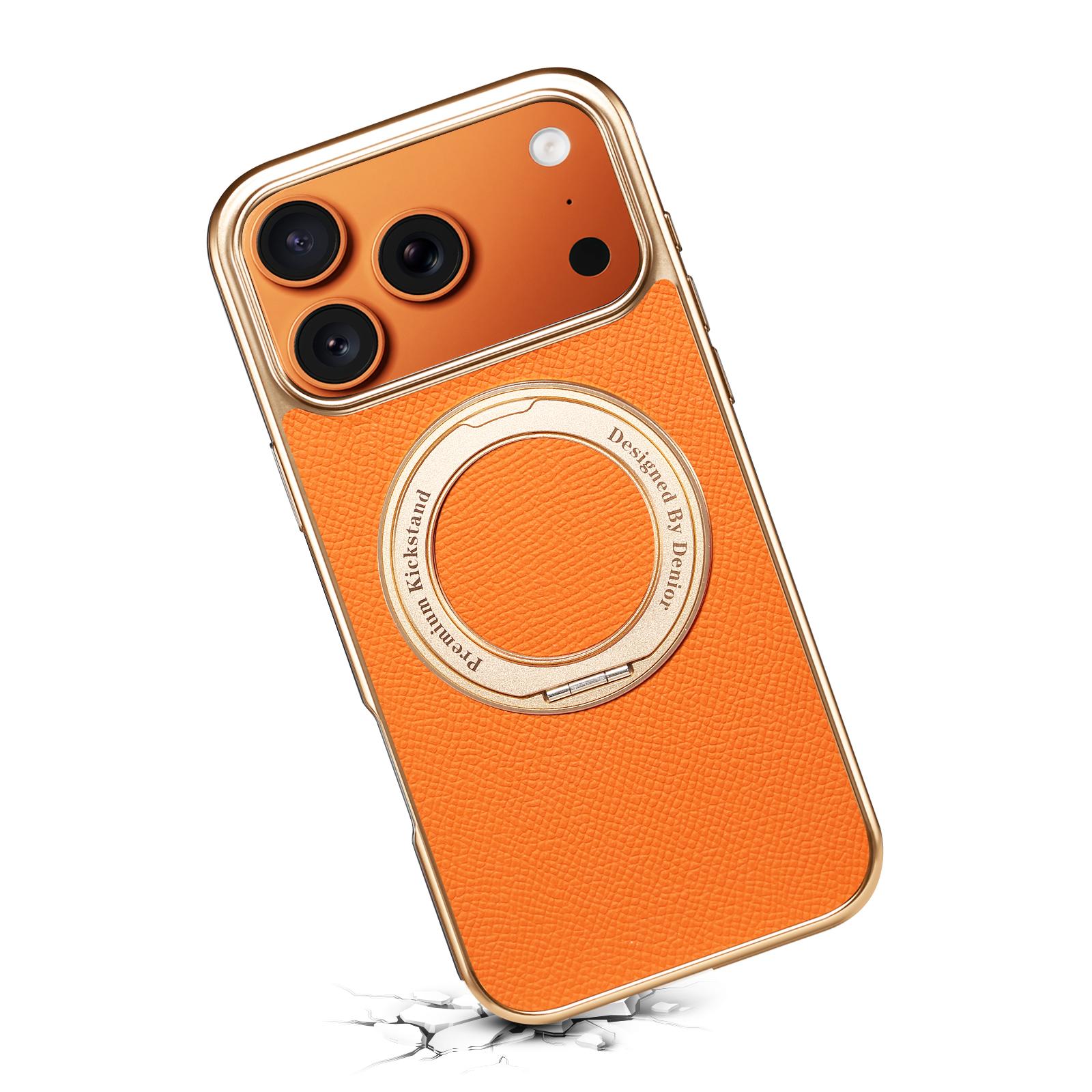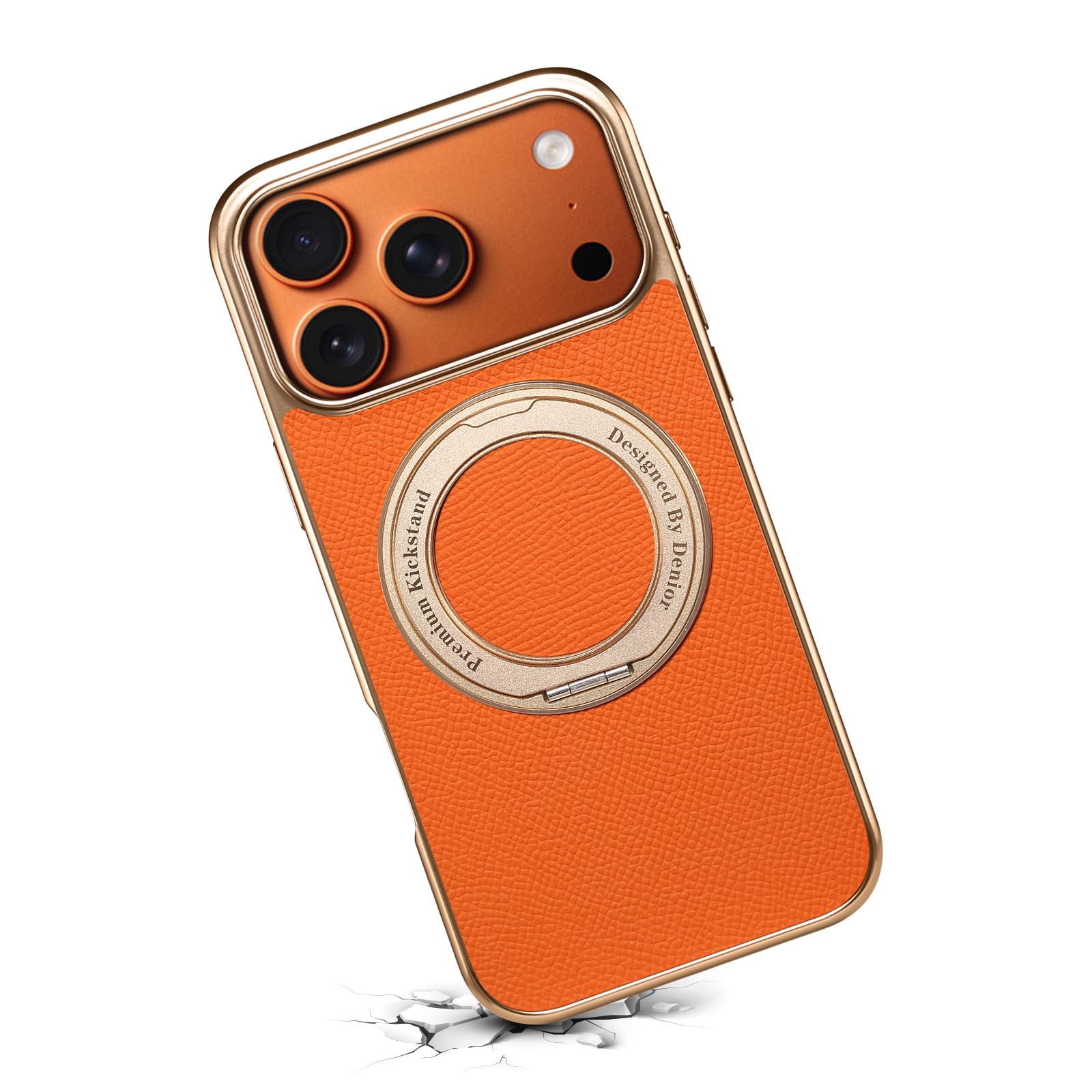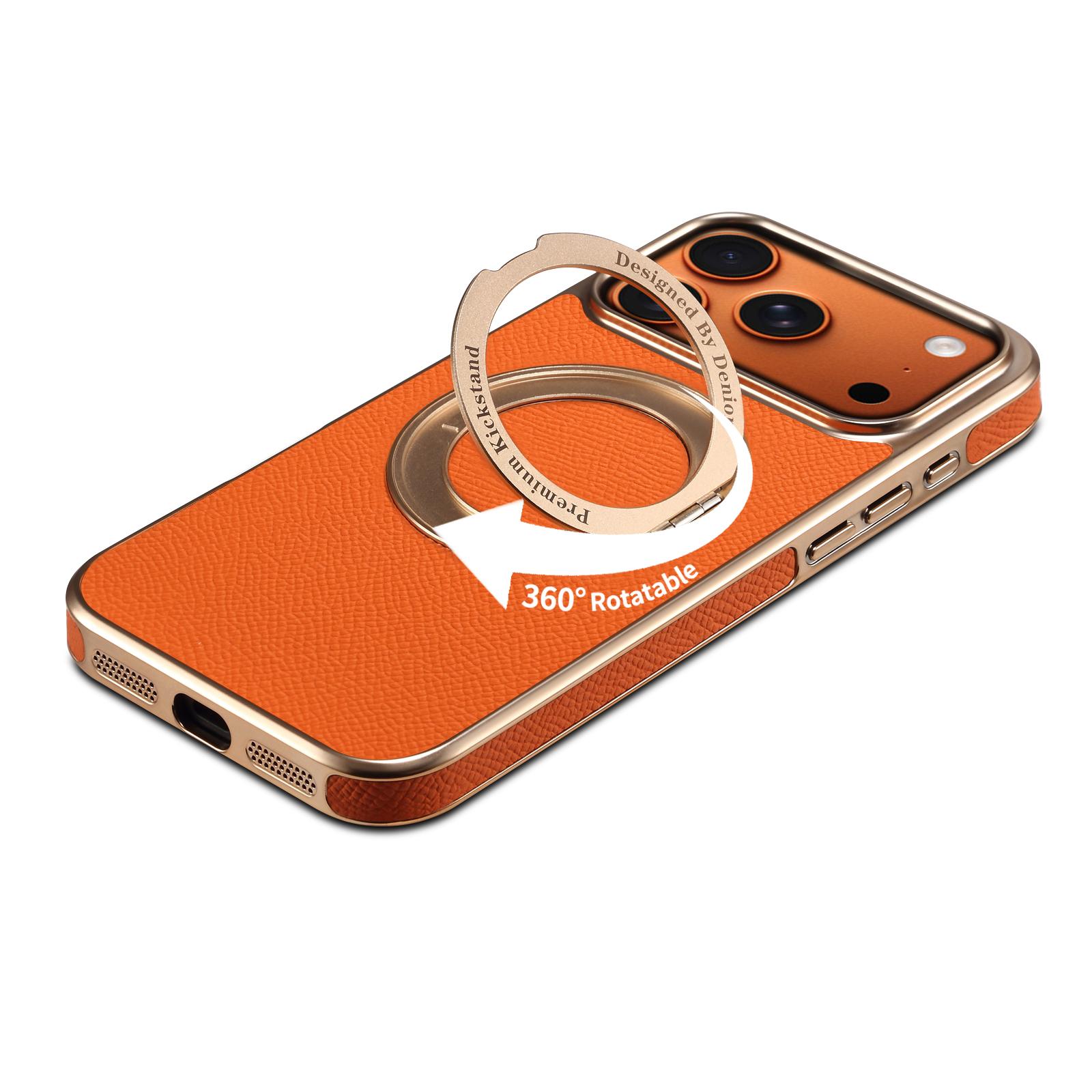 Denior Magnetic Gear Rotating Stand Phone Case for iPhone 17 Pro Max | Genuine Cowhide Leather | Fingerprint-Resistant Electroplated Case - Orange