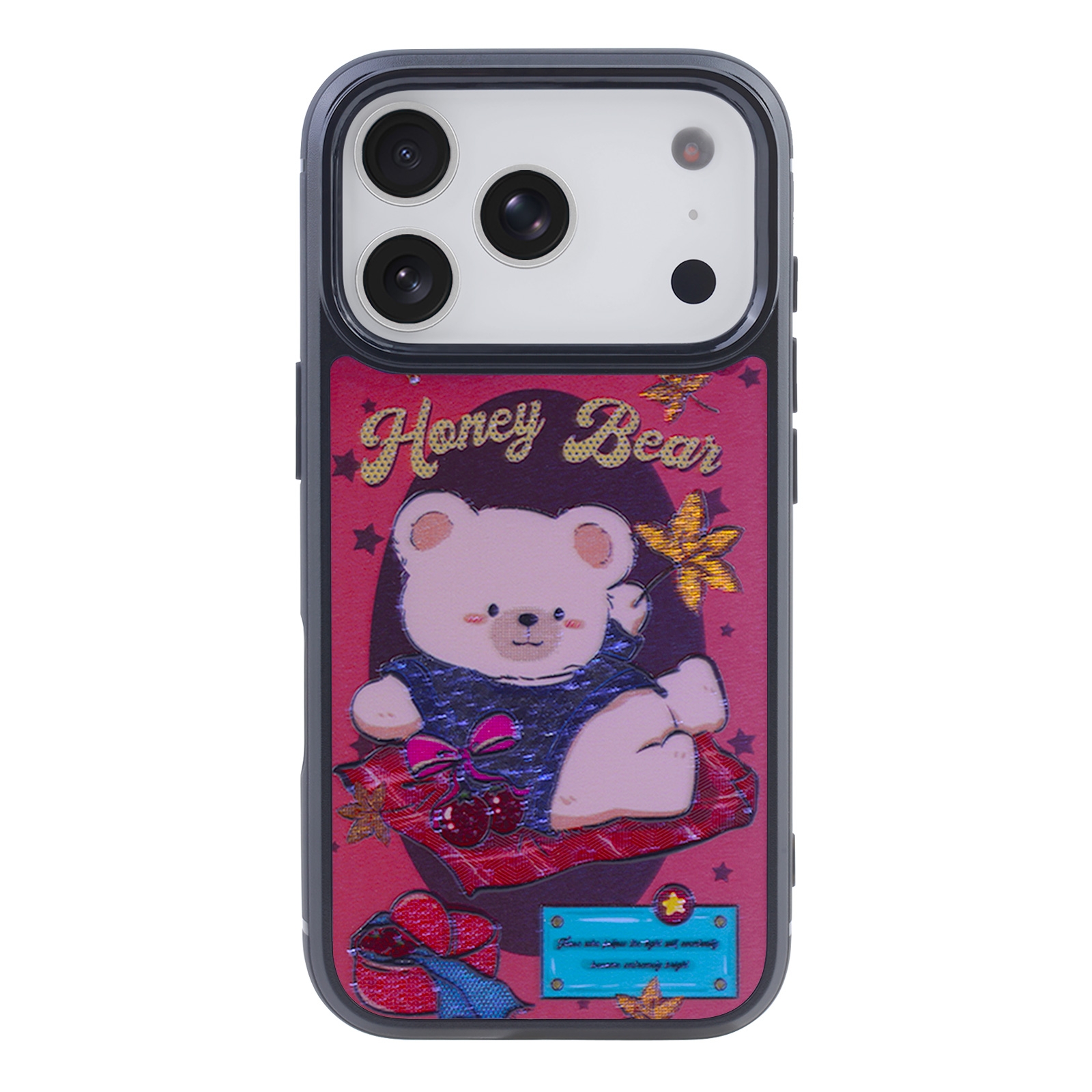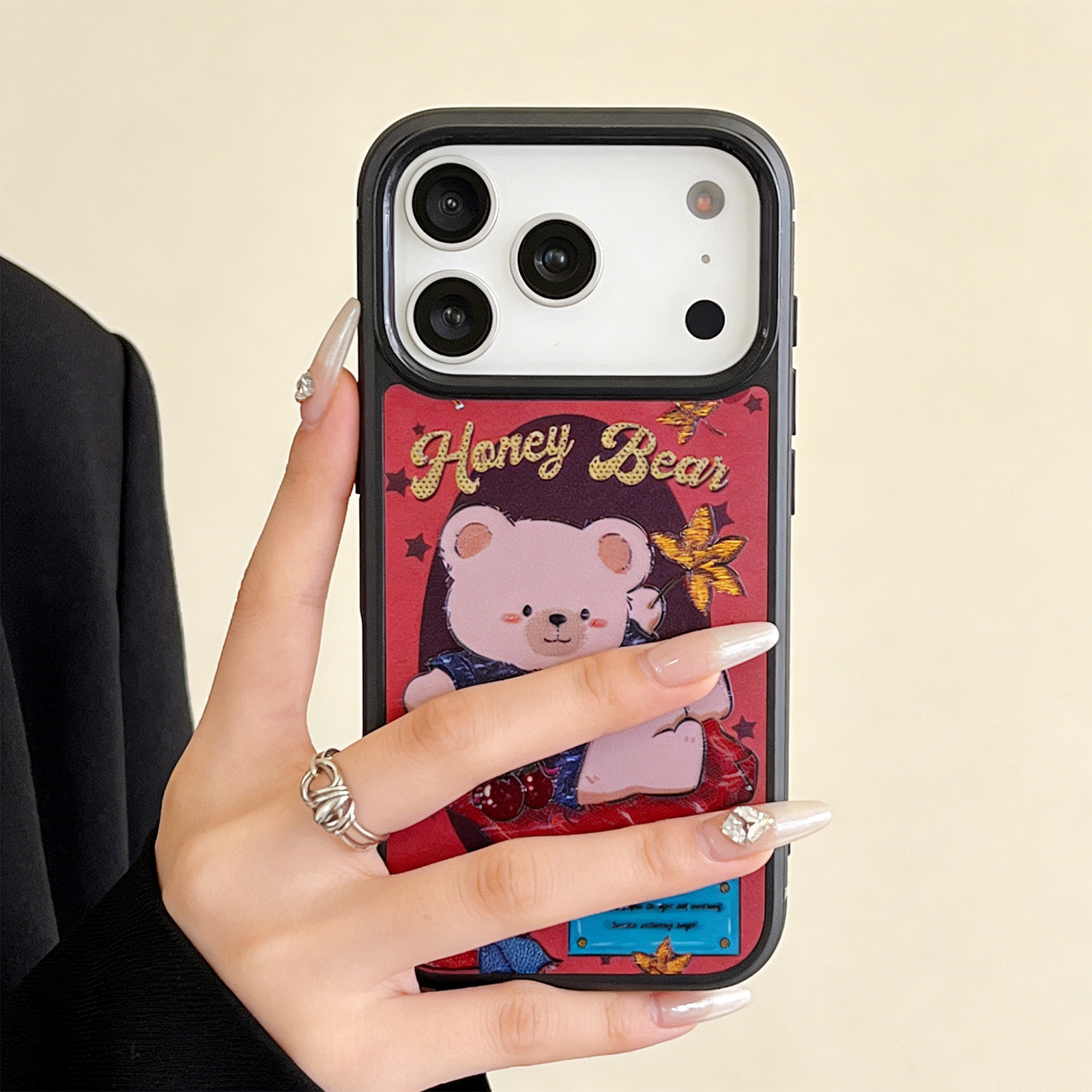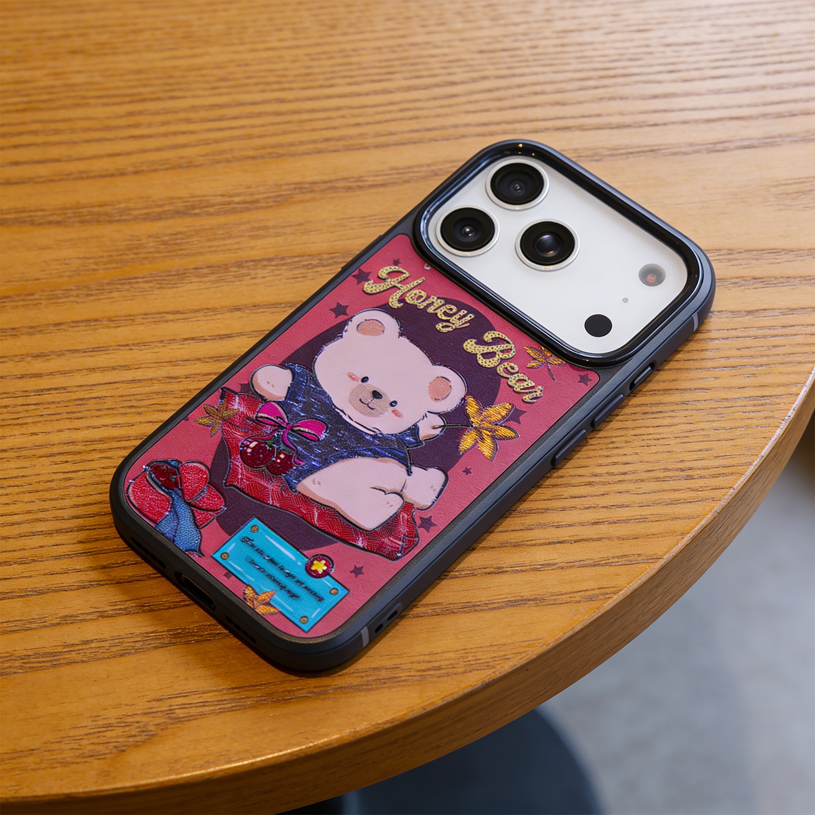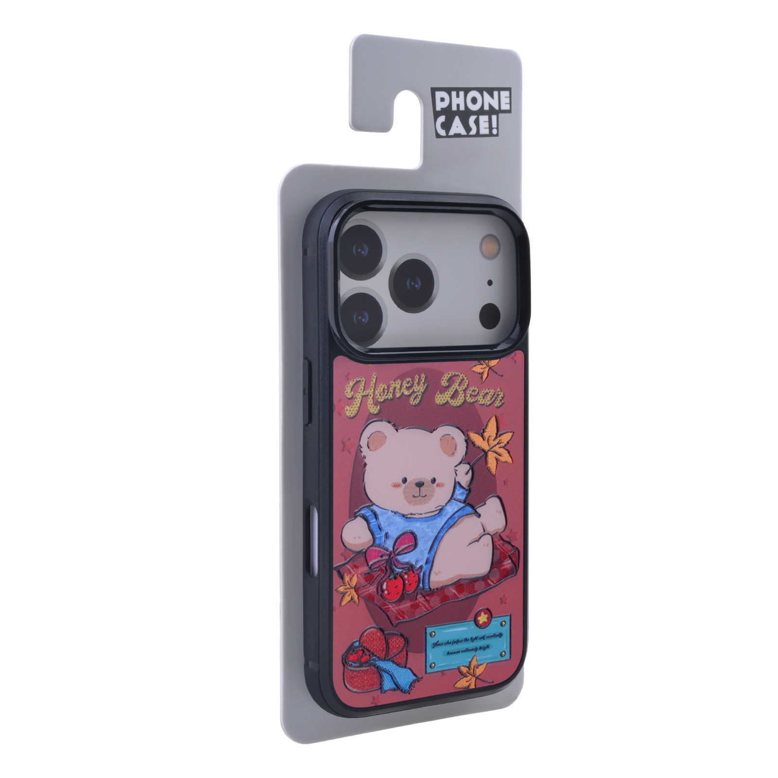Maroon Magnetic Honey Bear Case for iPhone 17 Pro Max - Cute Bear in Blue Sparkly Outfit & Fall Leaves Print