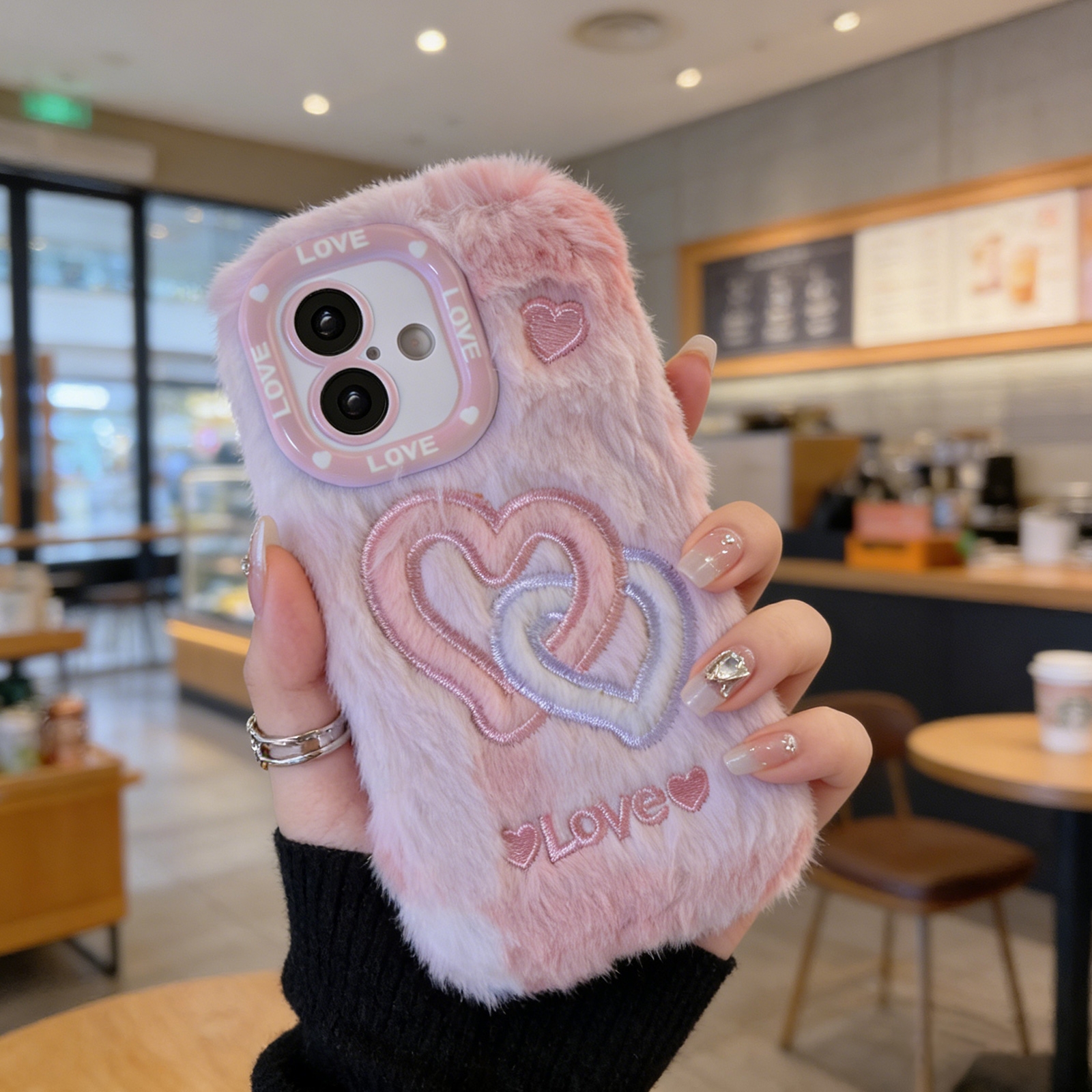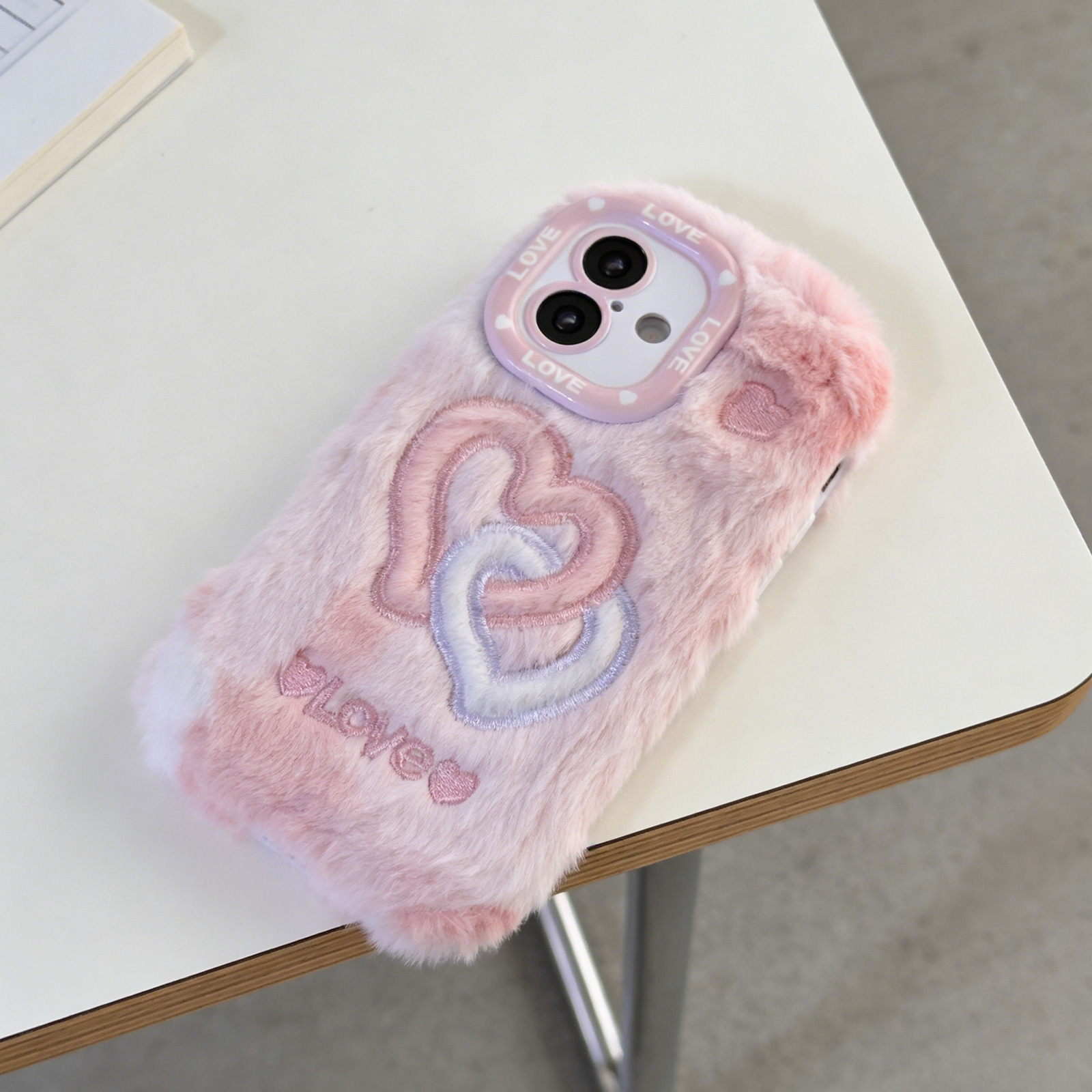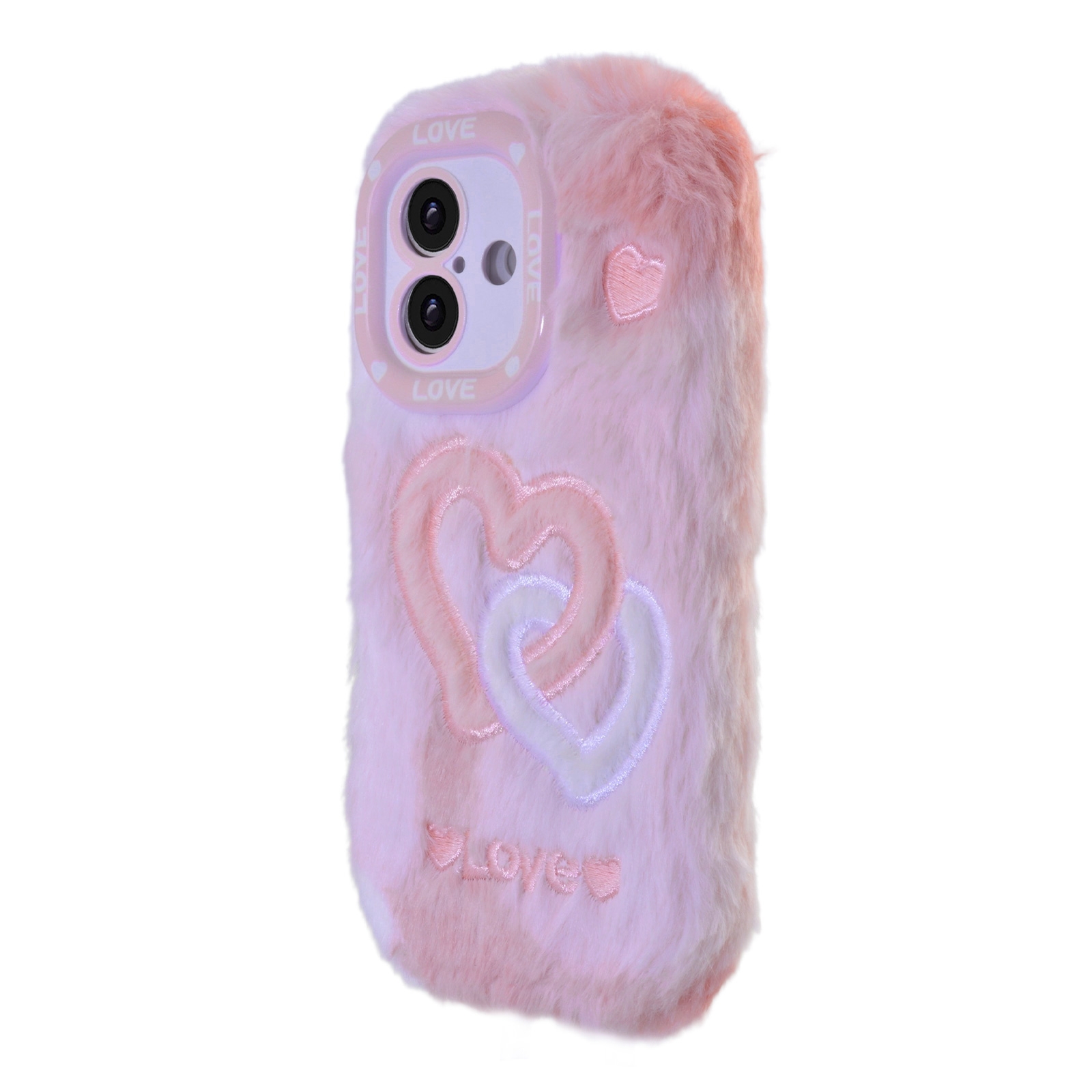 Pink Plush Silicone Double Heart Phone Case for iPhone 16 – Soft Furry Cute Protective Cover