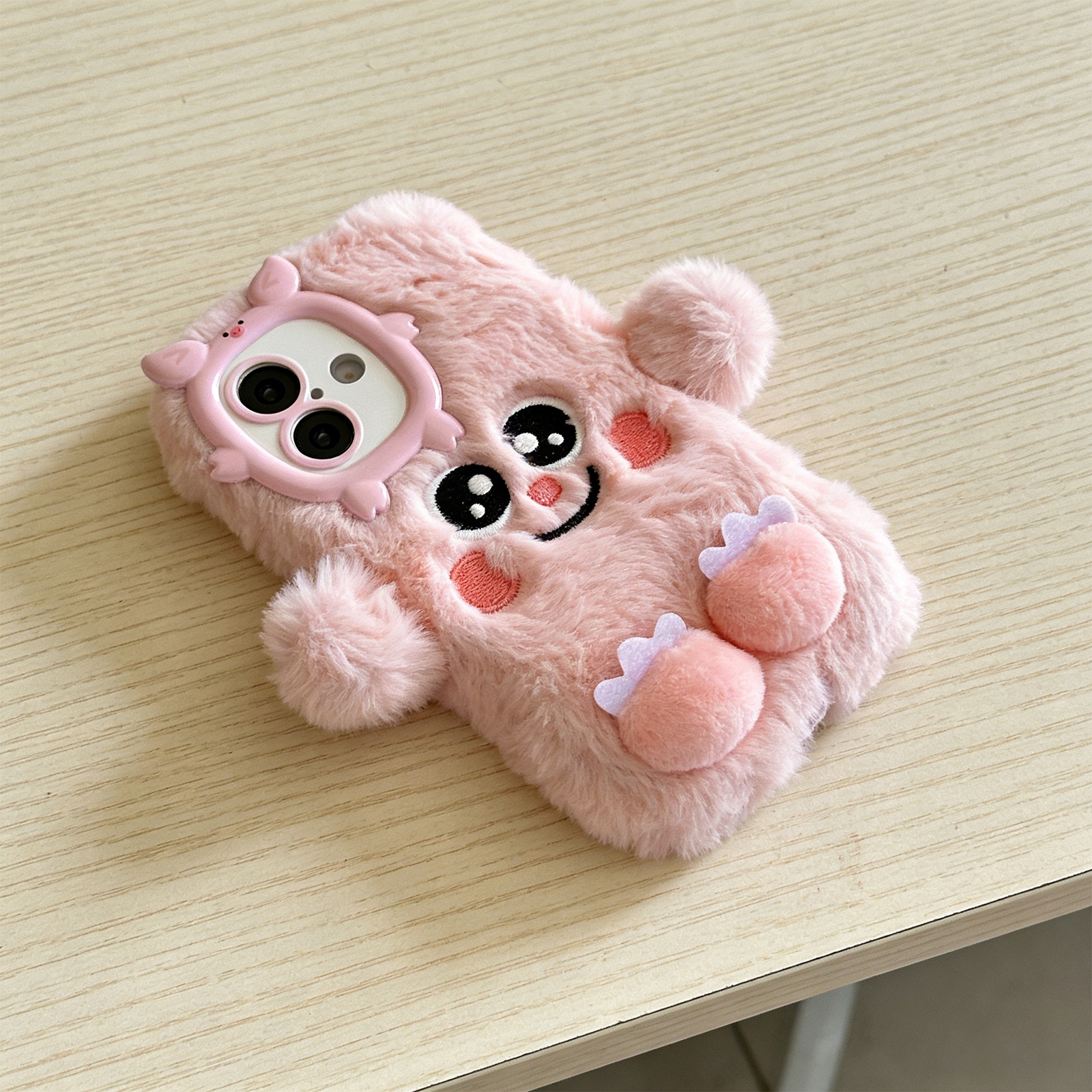 Pink Plush Silicone Monster Phone Case for iPhone 16 – Soft Furry Cute Protective Cover
