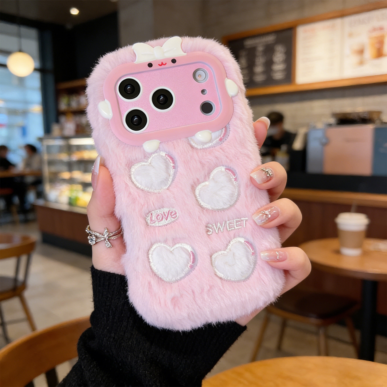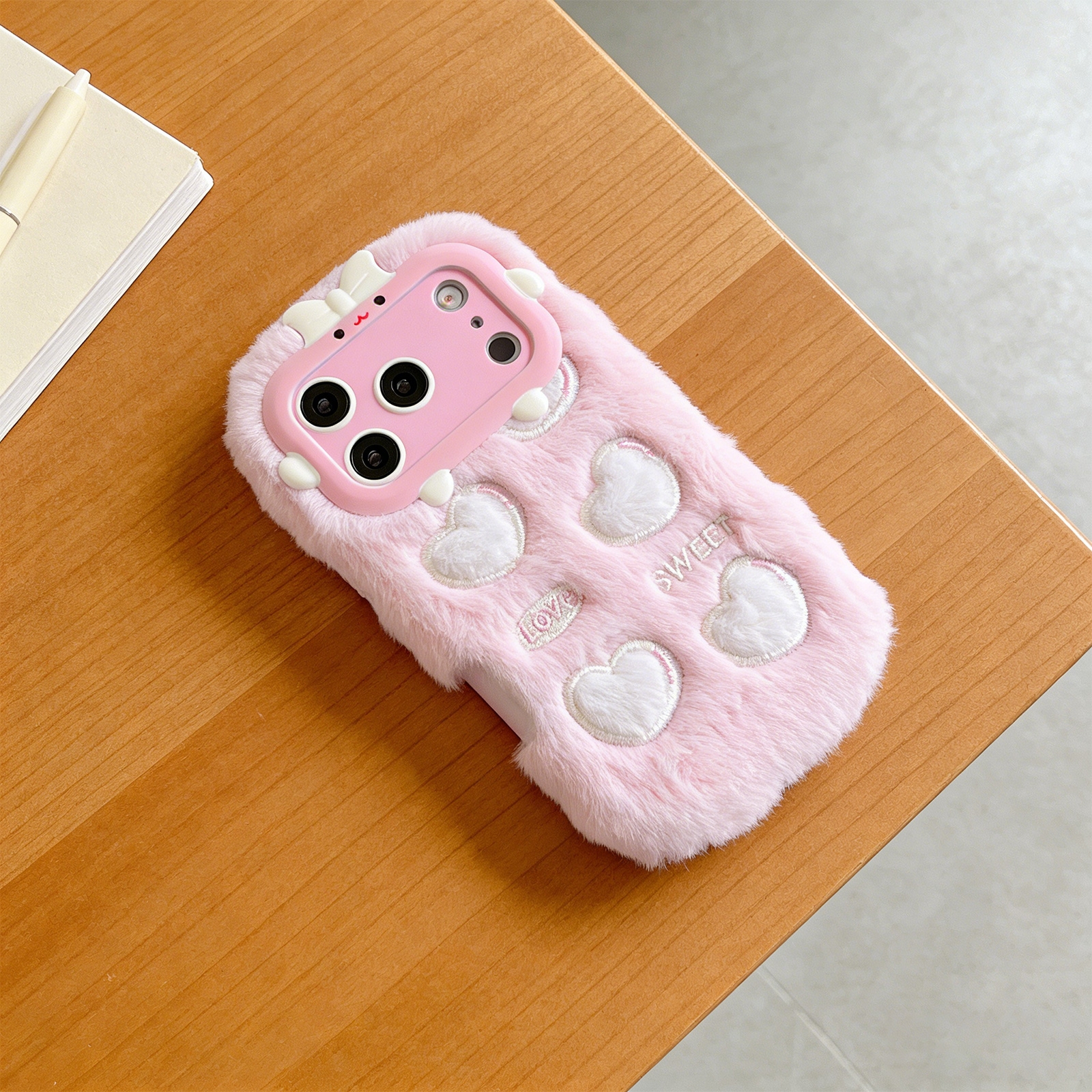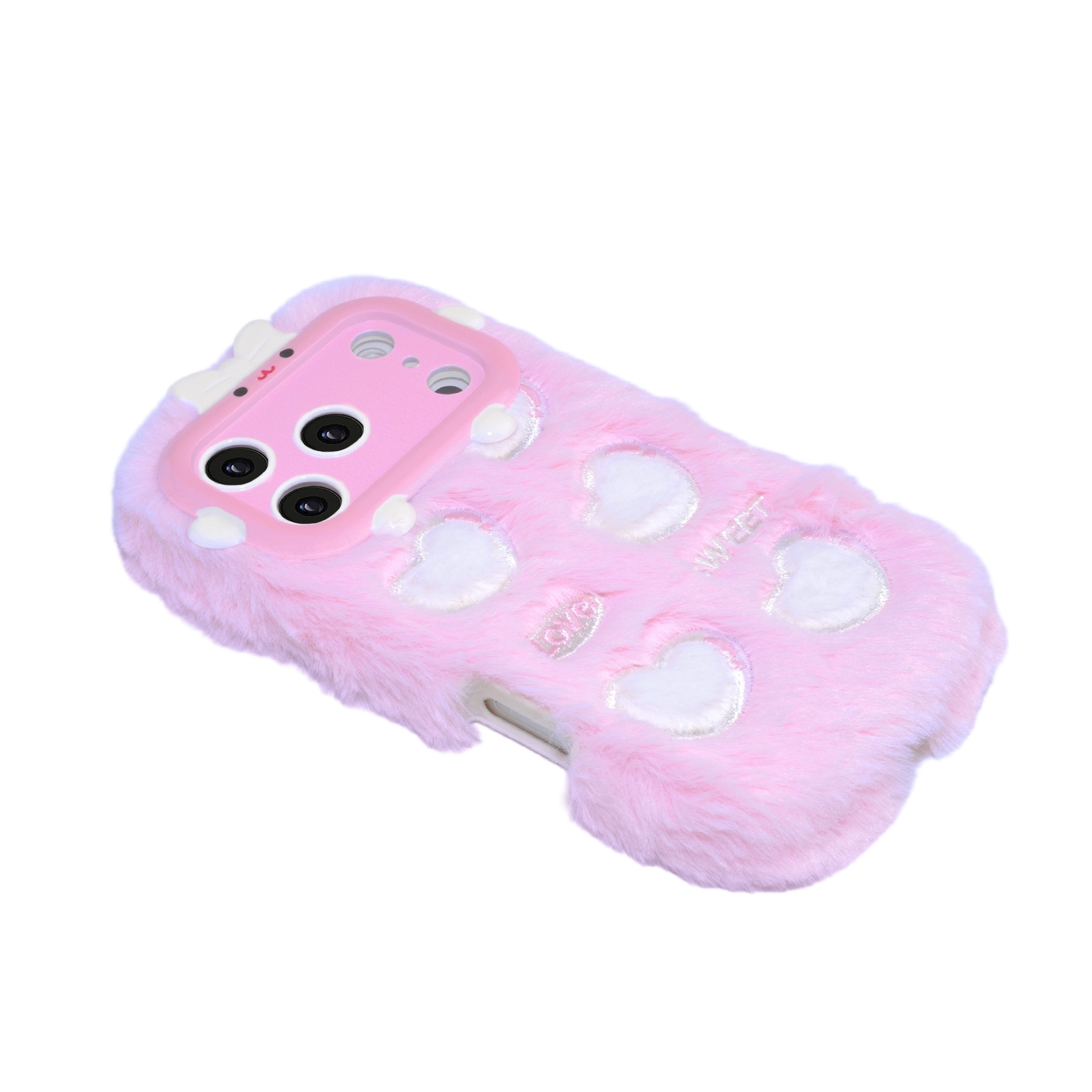 Pink Plush Silicone Phone Case with Five Hearts for iPhone 17 Pro – Soft Furry Cute Protective Cover