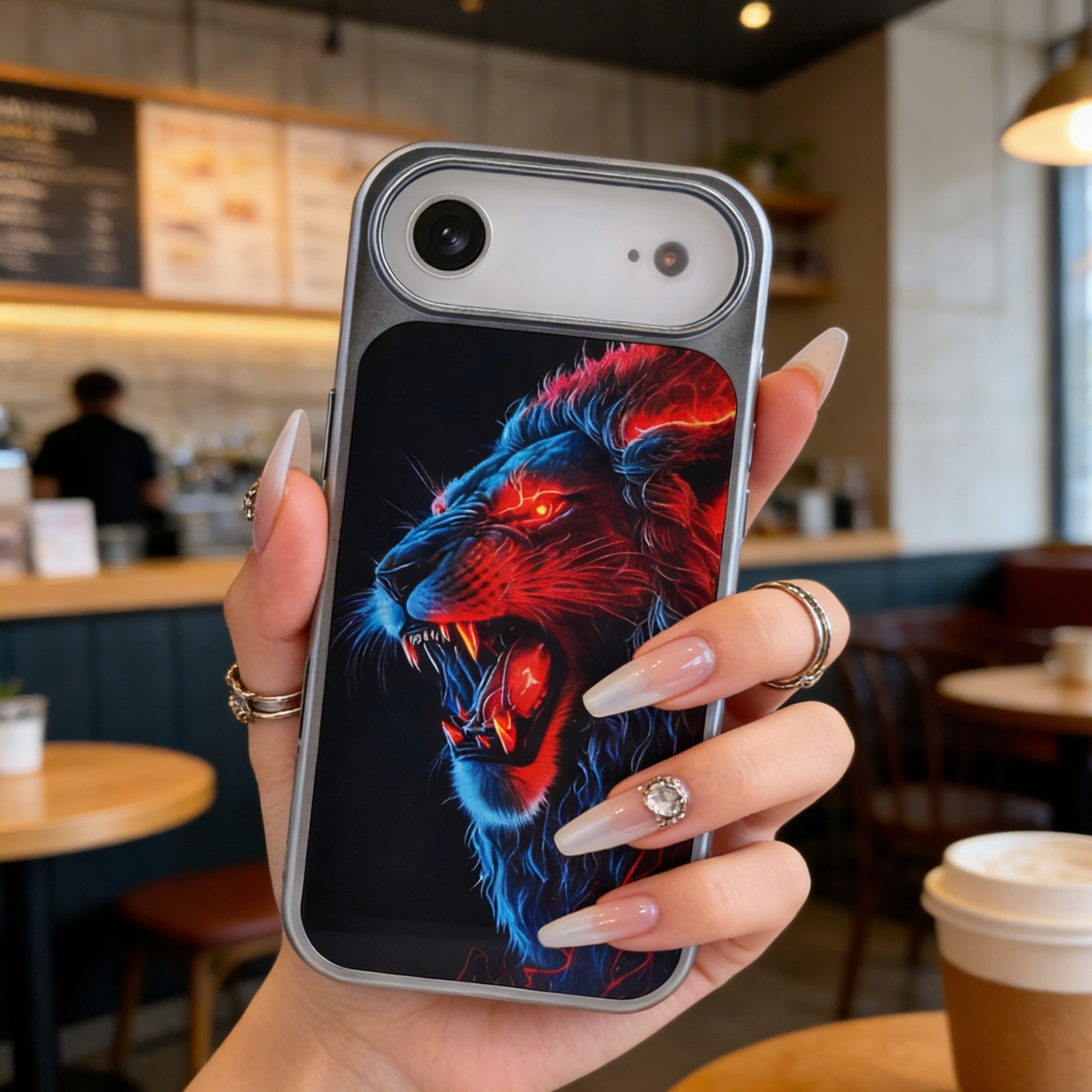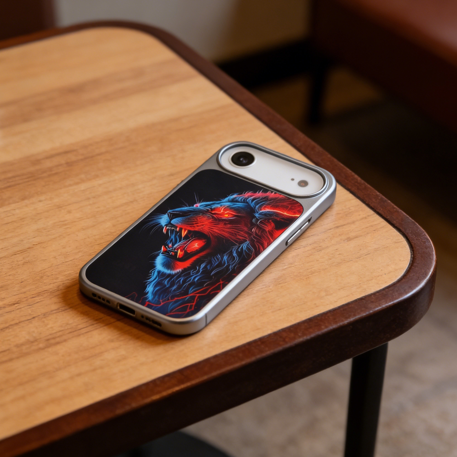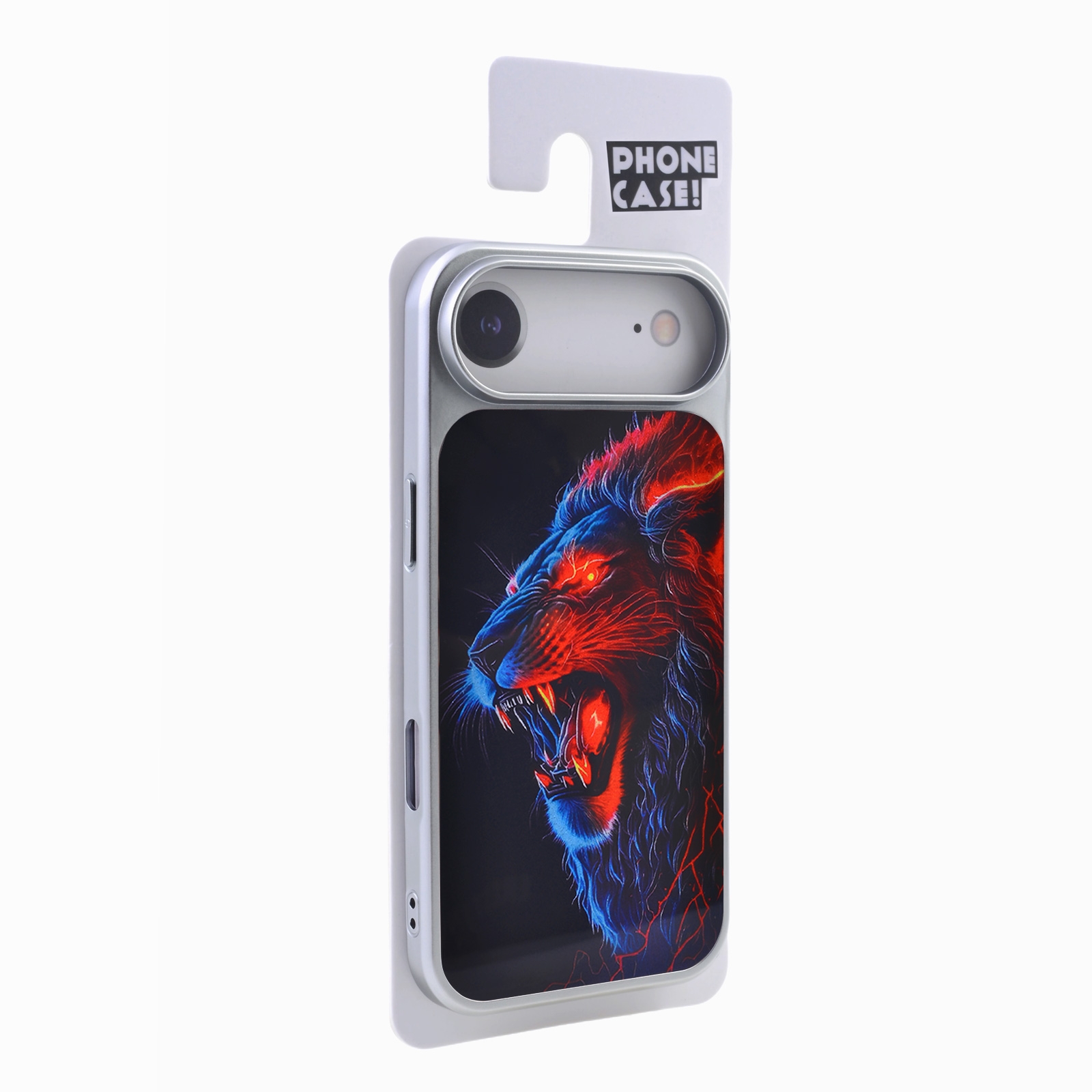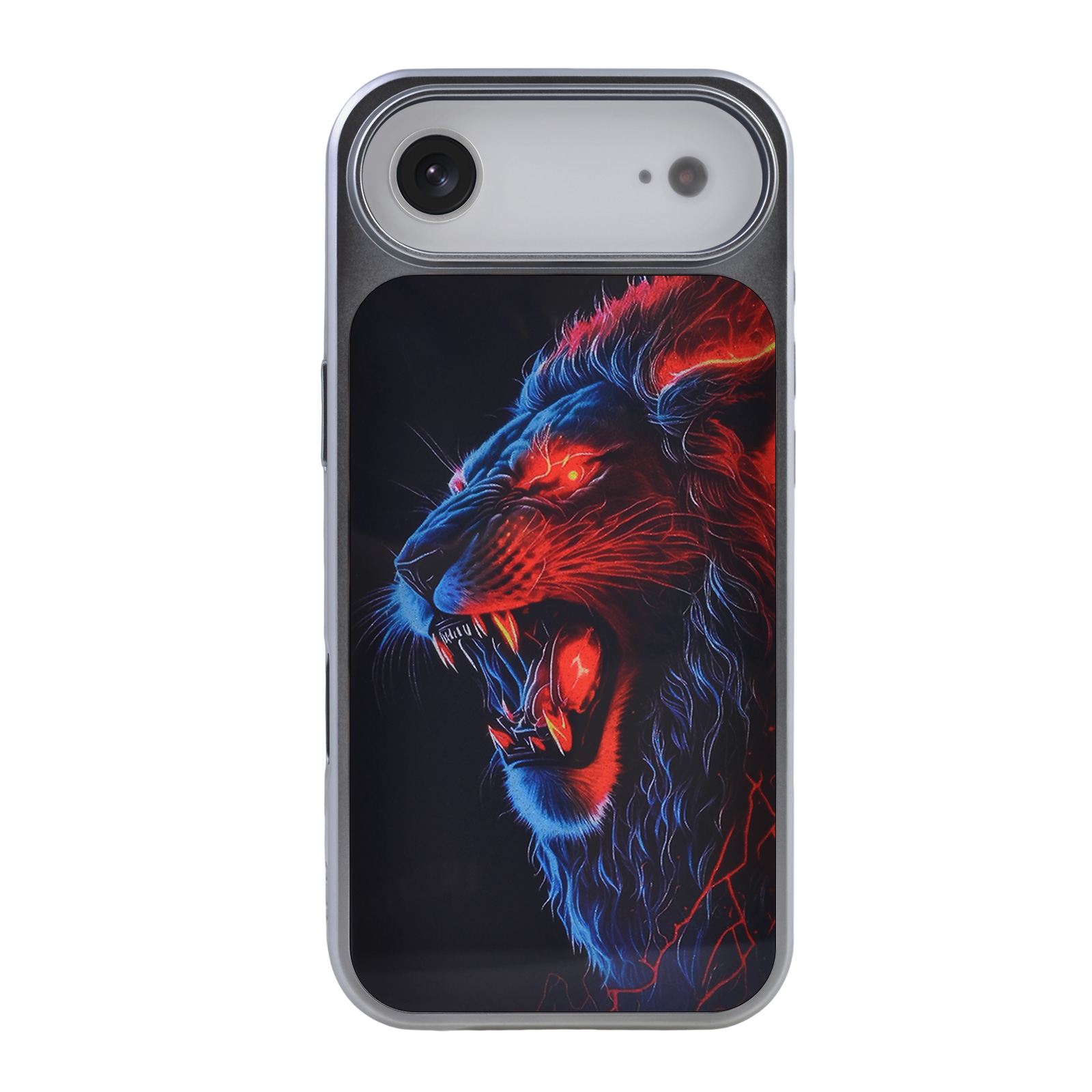 - Vivid Neon Art Graphic - The back panel showcases a high-contrast illustration of a roaring lion, accented with electric red and blue neon glow effects against a solid dark background.
