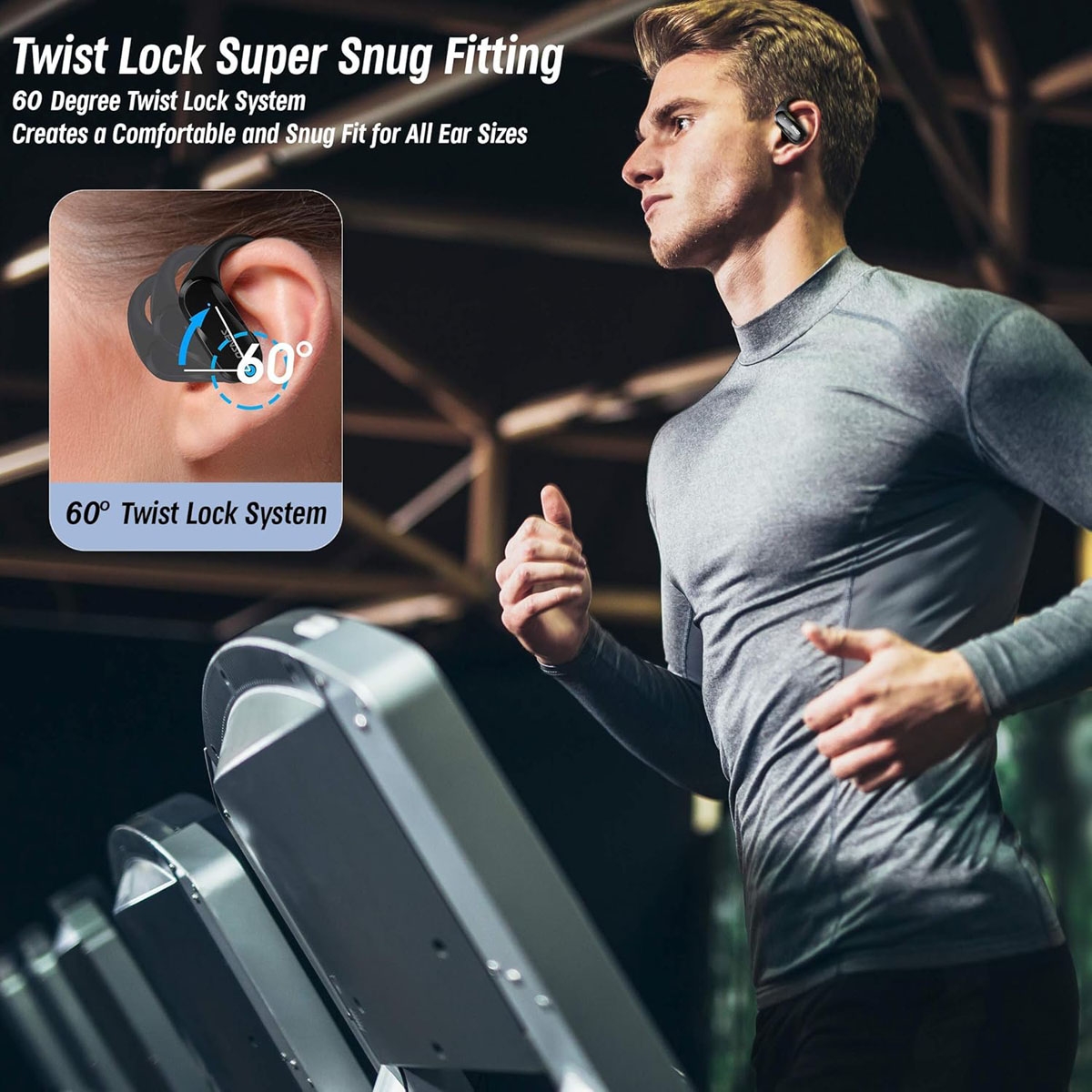 - 60-Degree Twist Lock Fitting: The earbuds feature a 60-degree twist lock system combined with flexible over-ear hooks. This ergonomic structure creates a snug fit that prevents the earbuds from falling out during intense workouts or running.