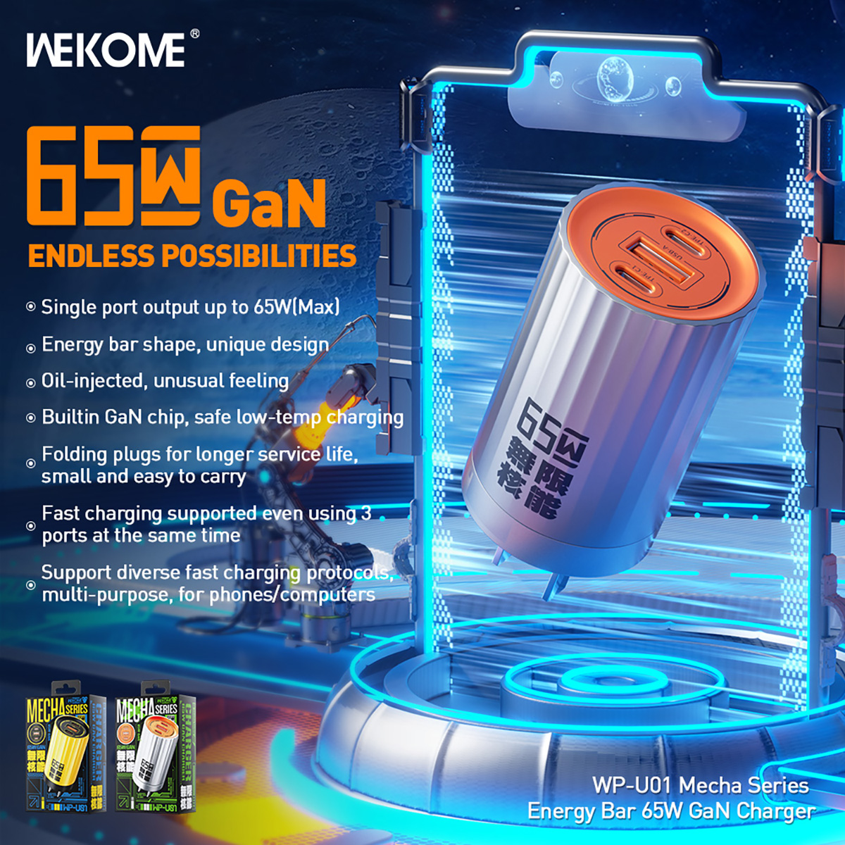 65W GaN USB-C Charger – Energy Bar Style Multi-Port Fast Charger (Silver)