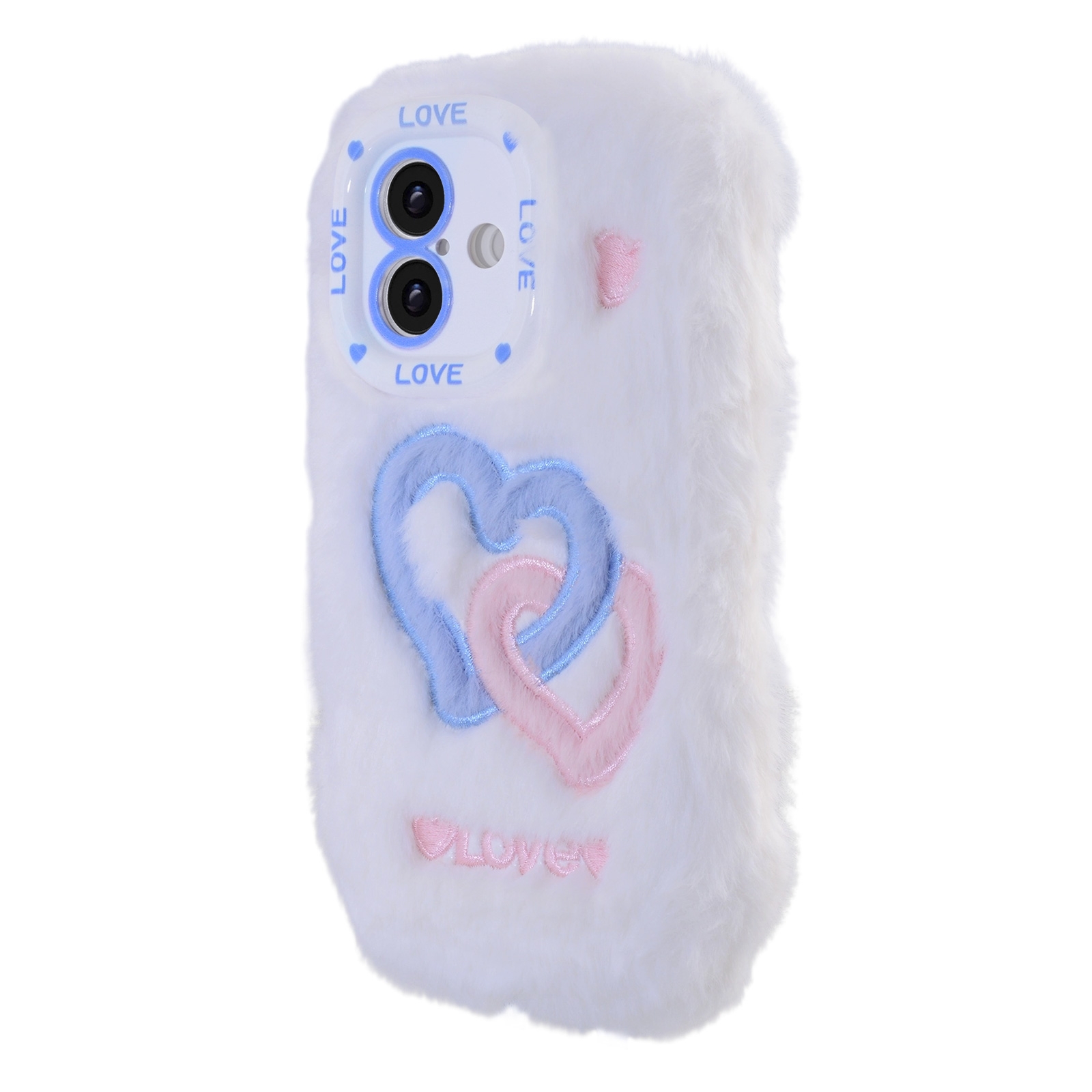 White Plush Silicone Double Heart Phone Case for iPhone 16 – Soft Furry Cute Protective Cover