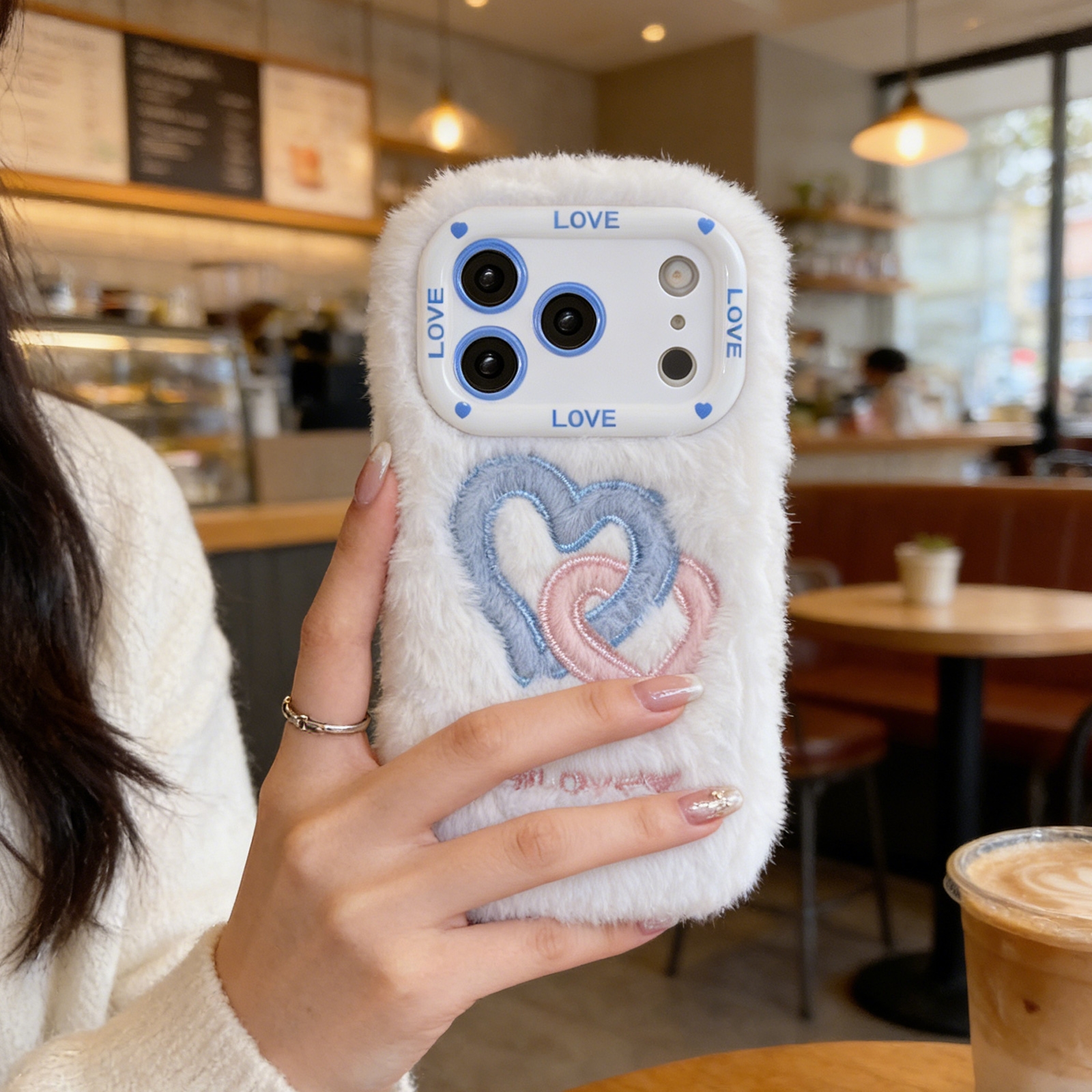 White Plush Silicone Double Heart Phone Case for iPhone 17 Pro Max – Soft Furry Cute Protective Cover