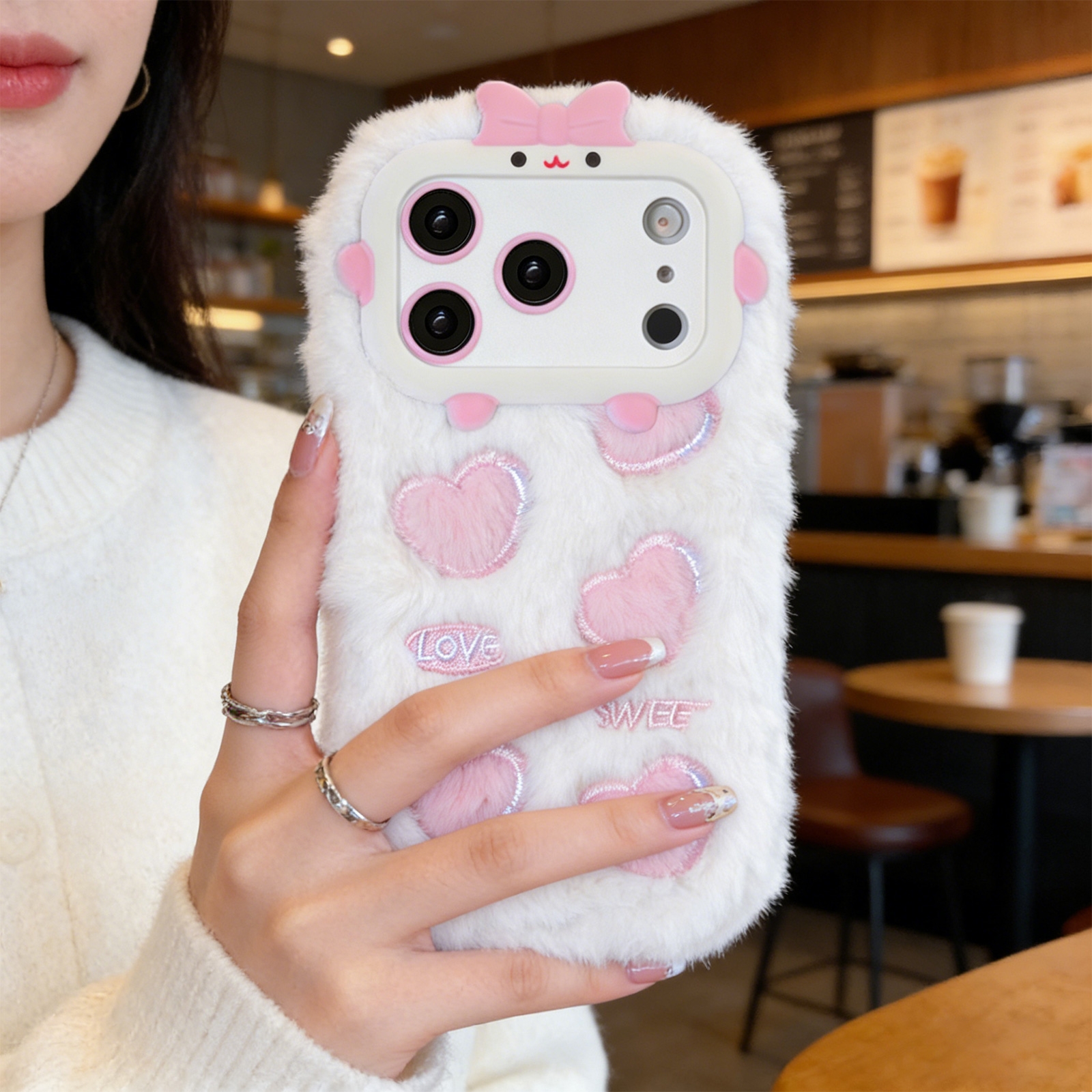 White Plush Silicone Double Heart Phone Case for iPhone 17 Pro – Soft Furry Cute Protective Cover