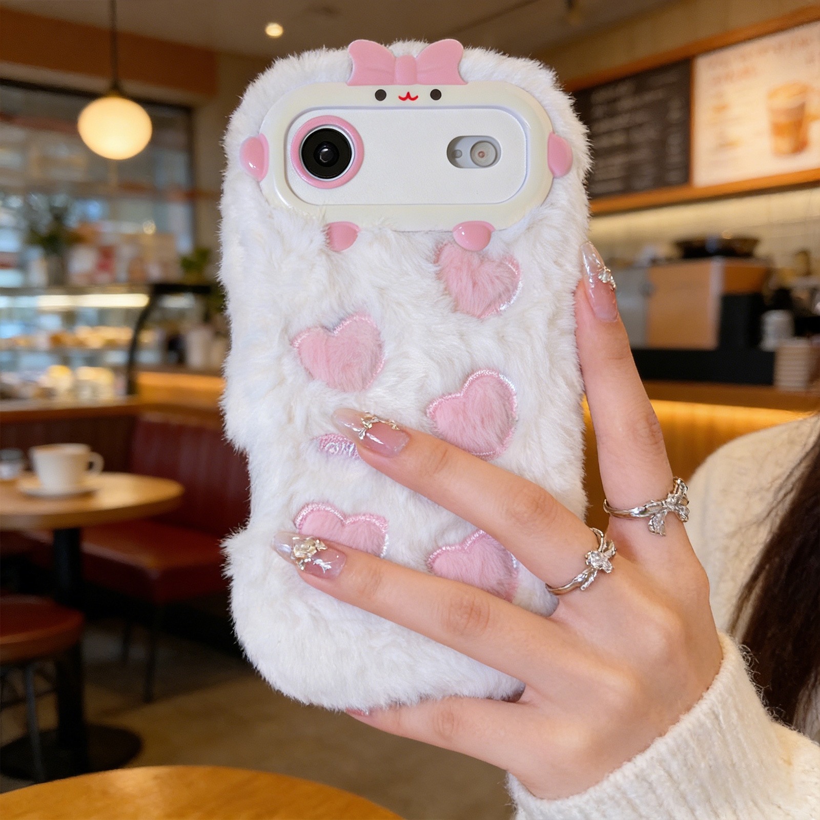 White Plush Silicone Phone Case with Five Hearts for iPhone Air – Soft Cute Protective Cover
